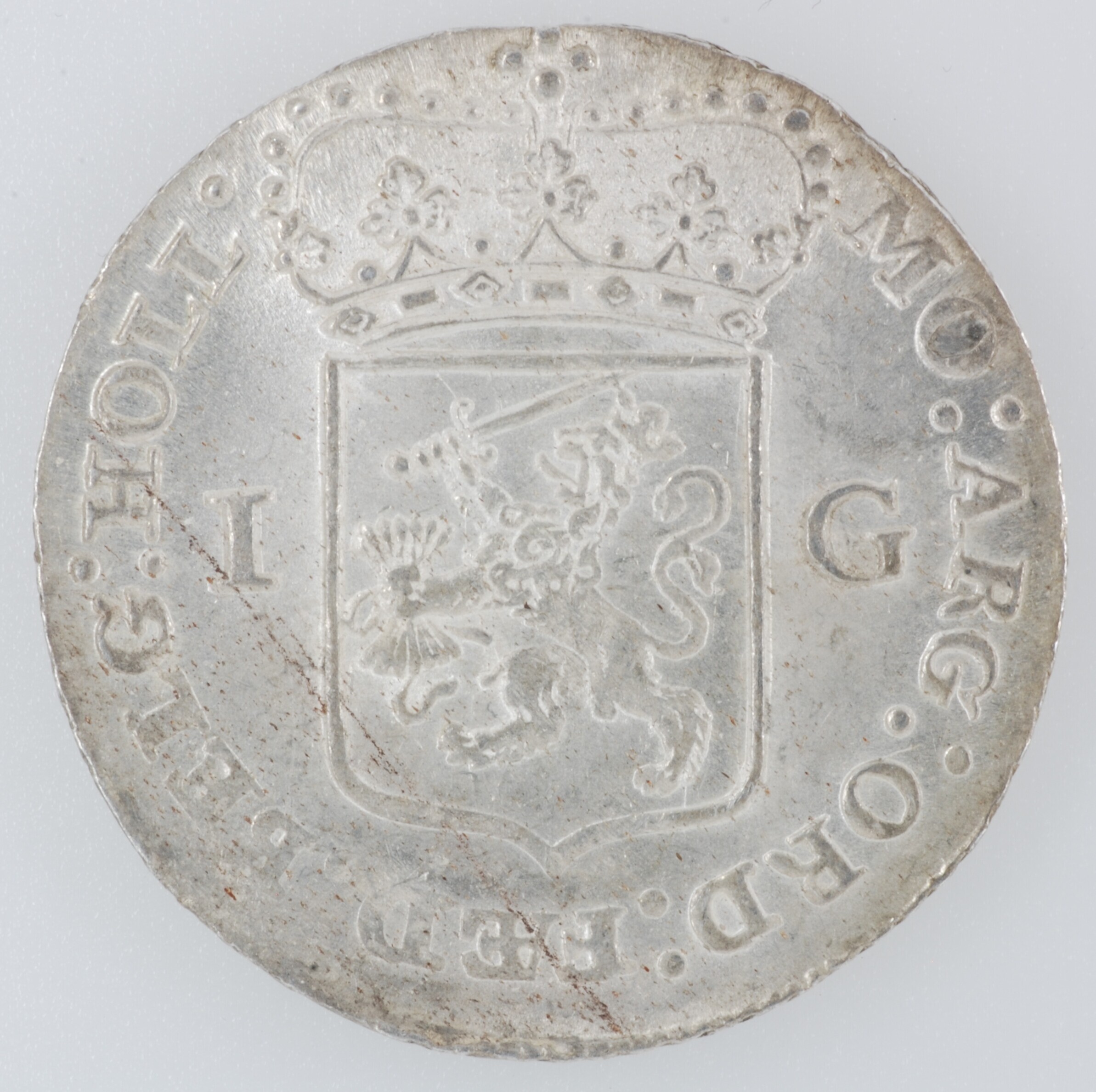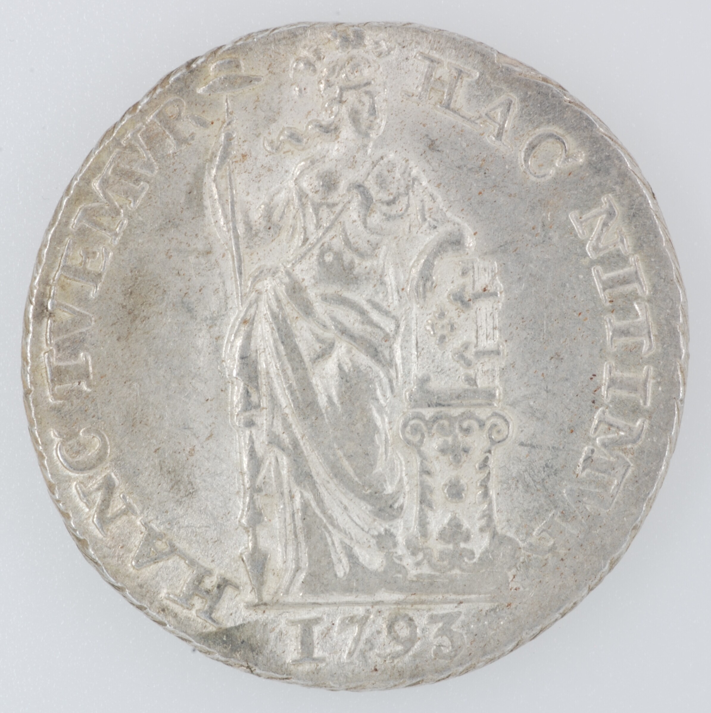Gulden; Holland Provincie (1581-1795); vz.: gekroond generaliteitswapen met ter weerszijden waardeaanduiding 1 – G, met omschrift MO:ARG:ORD:FAED:BELG:HOLL. (interpunctie achter HOLL hoge punt); kz.: Nederlands maagd, in de rechterhand een speer waarop een vrijheidshoed, met de linkerelleboog steunend op een rechtop op een zuil staande bijbel met in afsnede 1793, met omschrift HAC NITIMVR – HANC ...