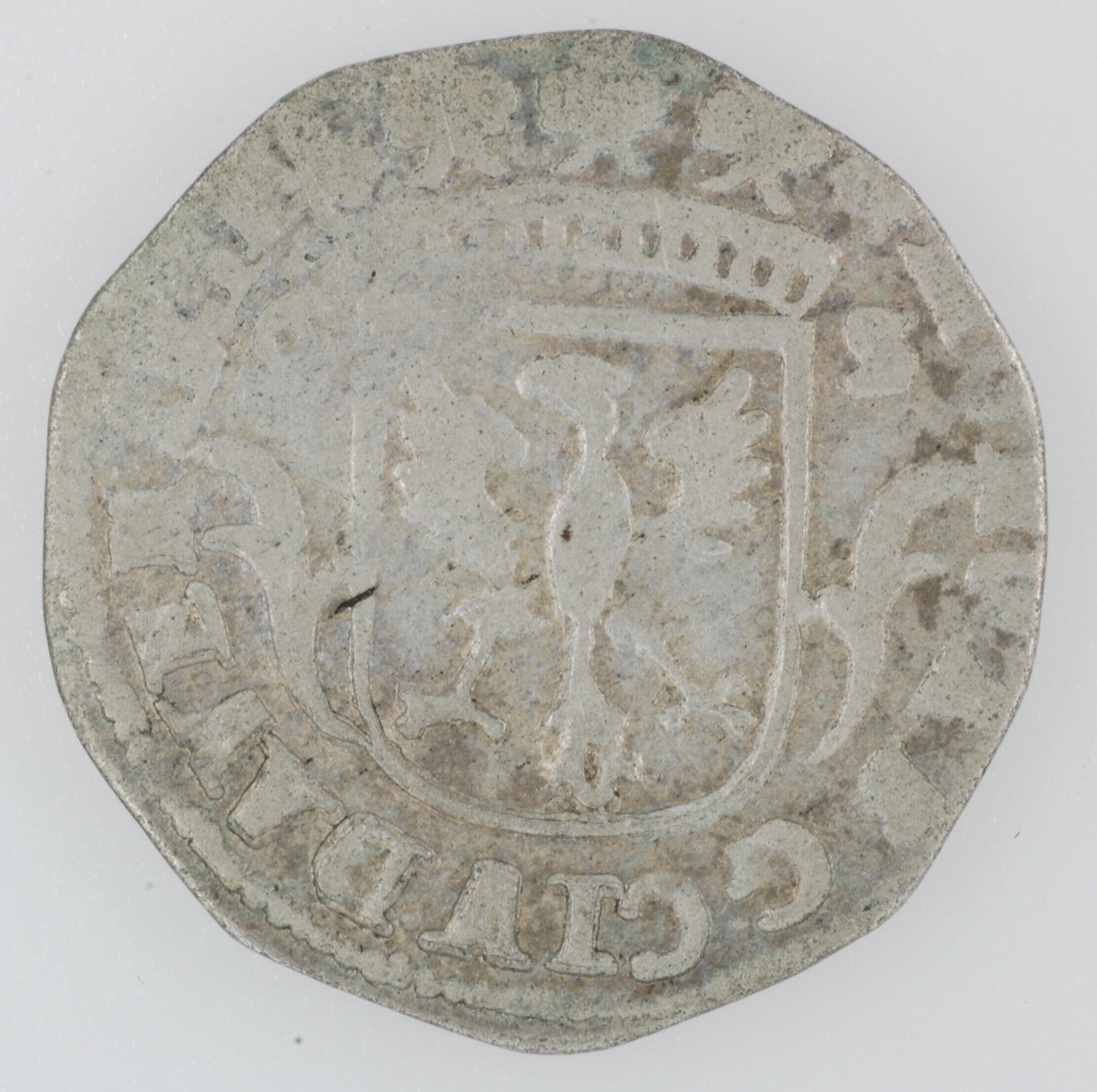 Rijderschelling; Overijssel Provincie (1581-1795); Steden: Deventer; vz.: met palmtakken versierd, gekroond provinciewapen met ter weerszijden waardeaanduiding 6 - S, jaartal boven de kroon, met omschrift MO.NO.ARG.CIV.DAVENTRIAE [1-6-8-.]; kz.: geharnaste ridder met een sjerp om en met een geheven zwaard in rechterhand gezeten op een maar rechts galopperend paard, met omschrift [C]O[N]CORDIA.RES.PARVAE.CRESC[VNT] (interpunctie hoge punt); muntplaats: ...