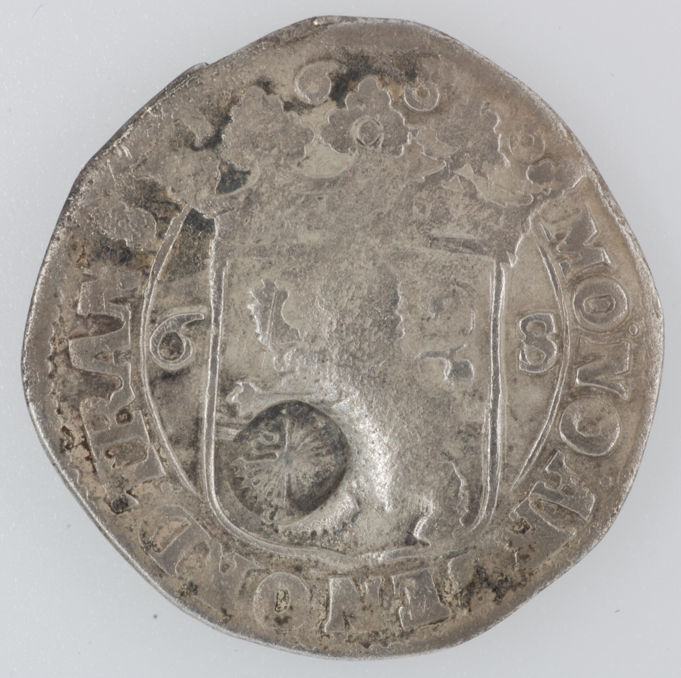 Rijderschelling; Overijssel Provincie (1581-1795); vz.: gekroond provinciewapen met ter weerszijden waardeaanduiding 6 - S, jaartal tussen fleurons van de kroon, met omschrift MO.NO.ARGEN.ORD.TRANS – 1 – 6 – 8 – 6; kz.: geharnaste ridder met een sjerp om en met een geheven zwaard in rechterhand gezeten op een naar rechts galopperend paard, met omschrift .CONCORDIA.RES.PARVAE.CRESCVNT ...