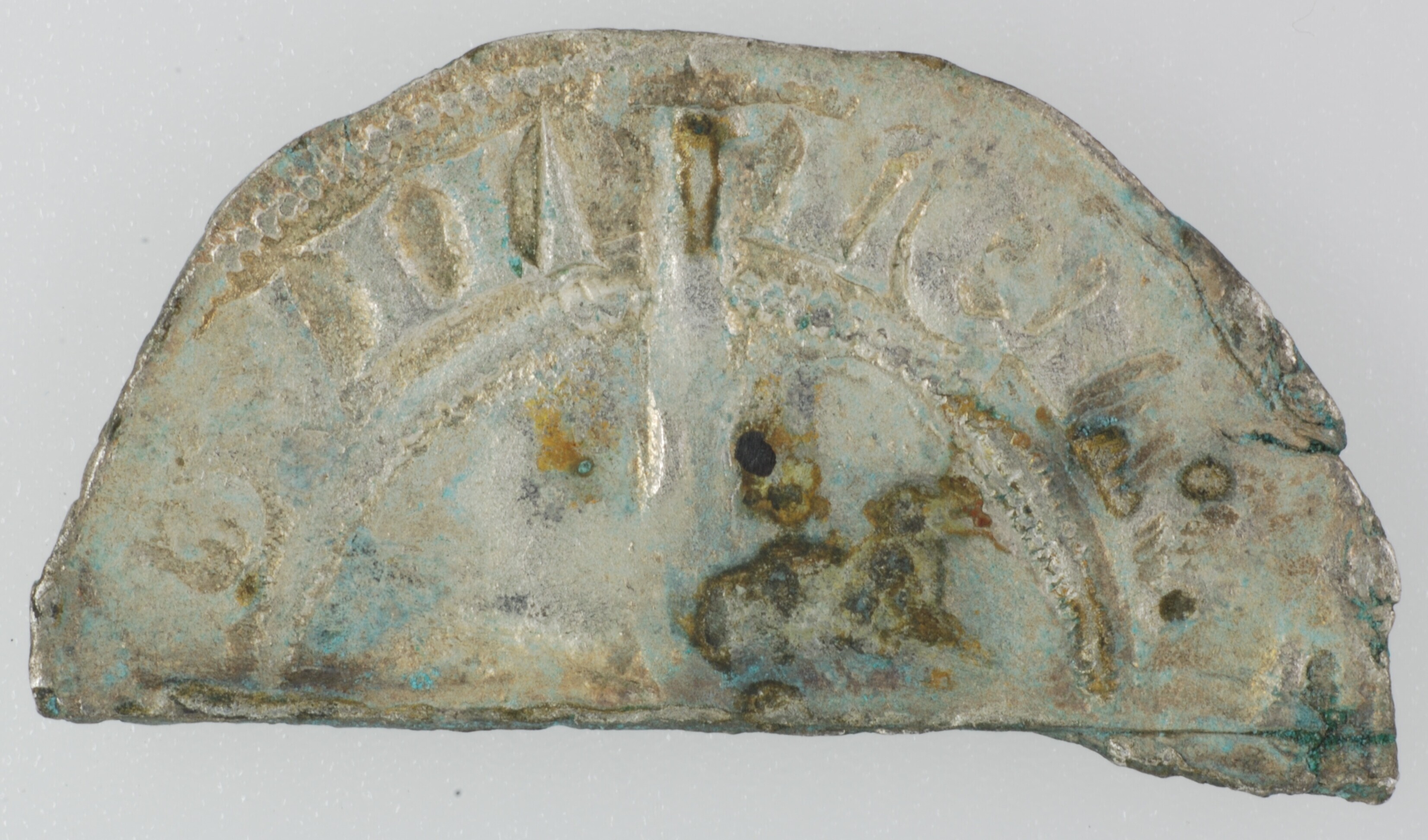 Halve leeuwengroot; Holland Graafschap (1049-1581); Willem V (1345-1389); vz.: klimmende leeuw naar links binnen parelcirkel, met omschrift +M[ONETAxHOLL]ANDRIEx; kz.: lang gevoet kruis binnen parelcirkel, met omschrift GVIL / LELM / [DVX.C / OMES]; muntplaats: Dordrecht; zeldzaam; gewicht: 0.61 gram; referentie: Grolle 17.2.3d; gehalveerd