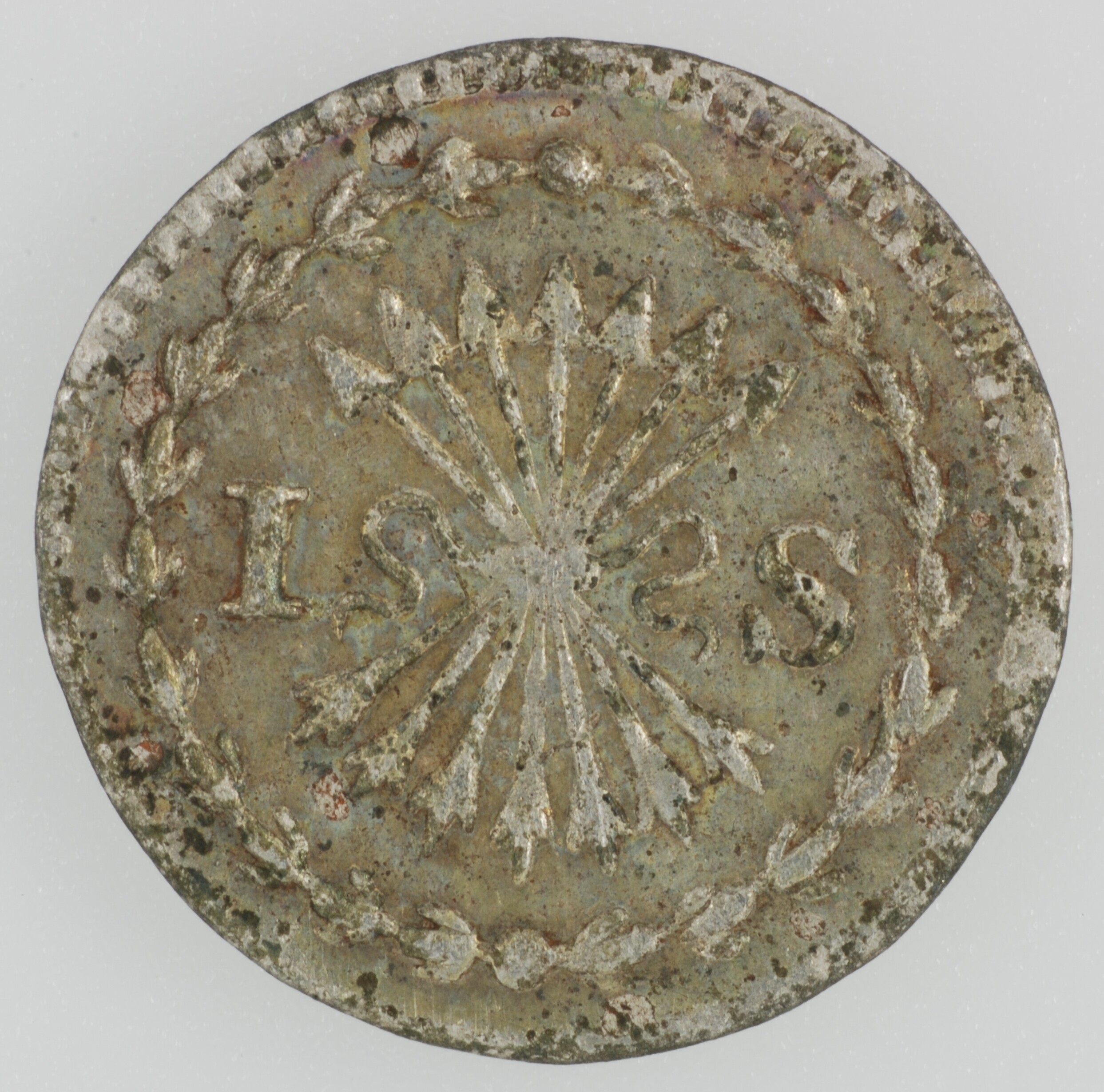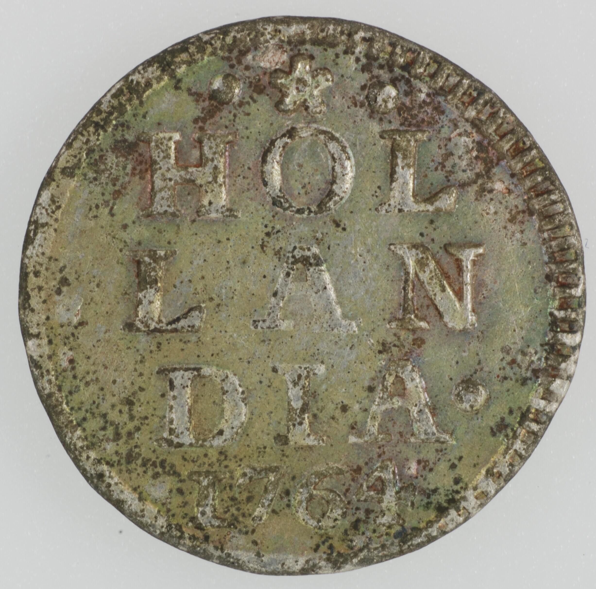 Bezemstuiver; Holland Provincie (1581-1795); vz.: in vier regels: • (rozet) • HOL / LAN / DIA / 1764; kz.: bundel van zeven pijlen binnen een bladerkrans met 1 – S ter weerszijden; muntplaats: Dordrecht; gewicht: 0.51 gram; referentie: CNM 2.28.121
