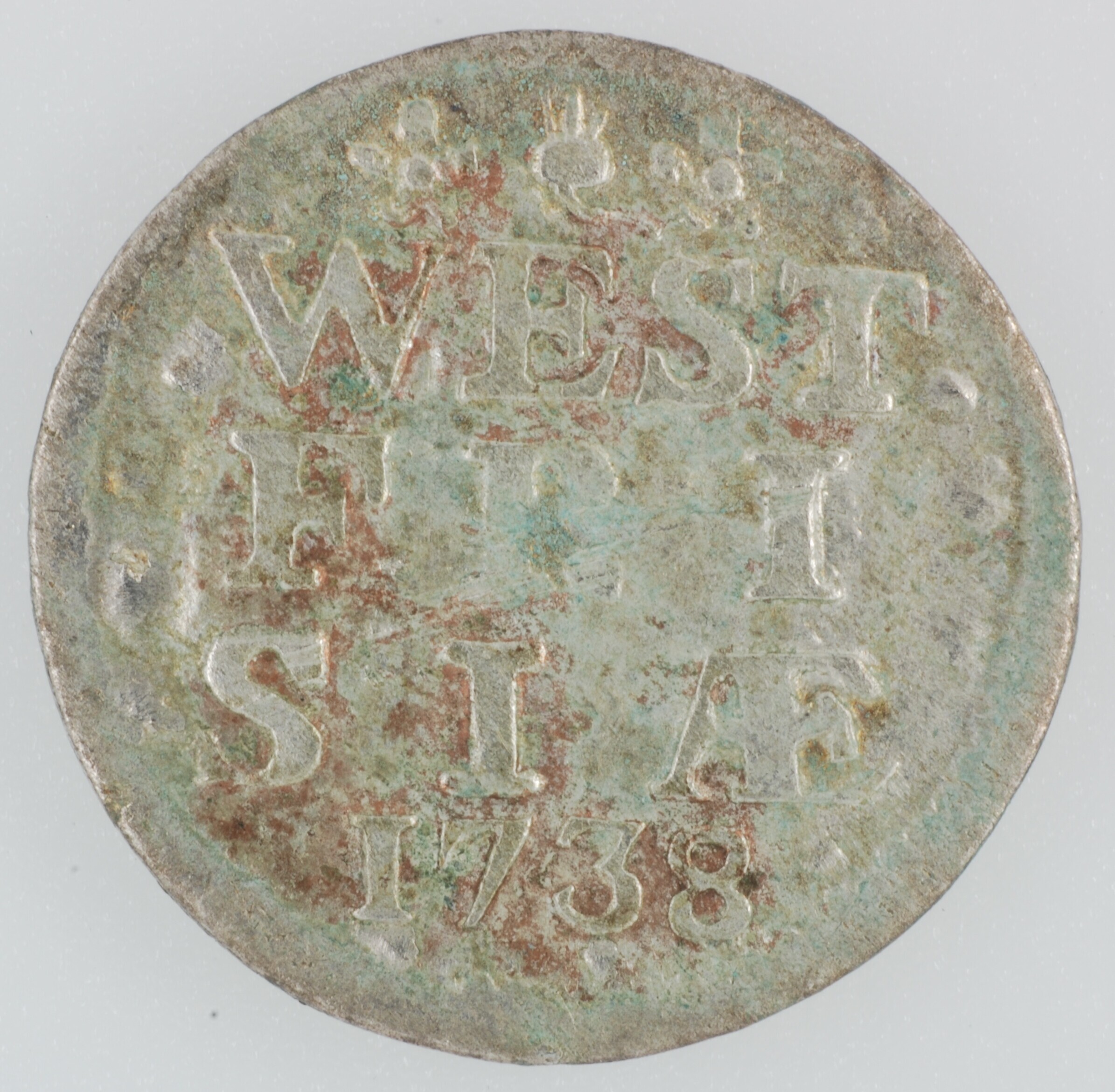 Bezemstuiver; West Friesland Provincie (1581-1795); vz.: in vier regels: Knol (rozet) knol / WEST / FRI / SIAE / •1738•; kz.: bundel van zeven pijlen binnen een bladerkrans met 1 – S ter weerszijden; muntplaats: Enkhuizen; gewicht: 0.56 gram; referentie: CNM 2.46.84