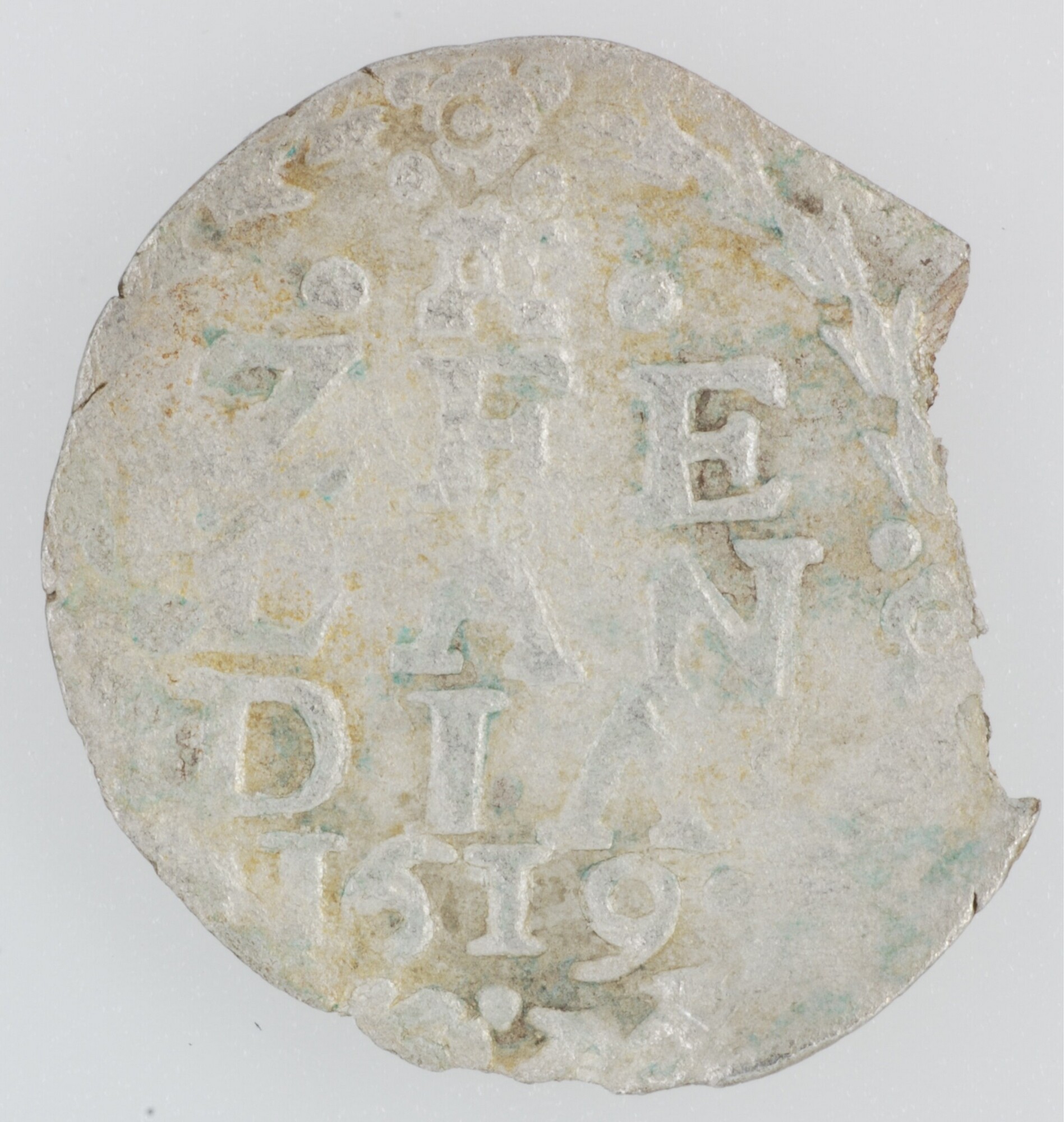 Bezemstuiver; Zeeland provincie (1581-1795); vz.: binnen een bladerkrans in vijf regels: • (burcht) • / ZEE / LAN / DIA / 1619 kz.: bundel van zeven pijlen binnen een bladerkrans met 1 – S ter weerszijden; muntplaats: Middelburg; gewicht: 0.79 gram; referentie: CNM 2.49.99 var (punten ter weerszijden muntteken)