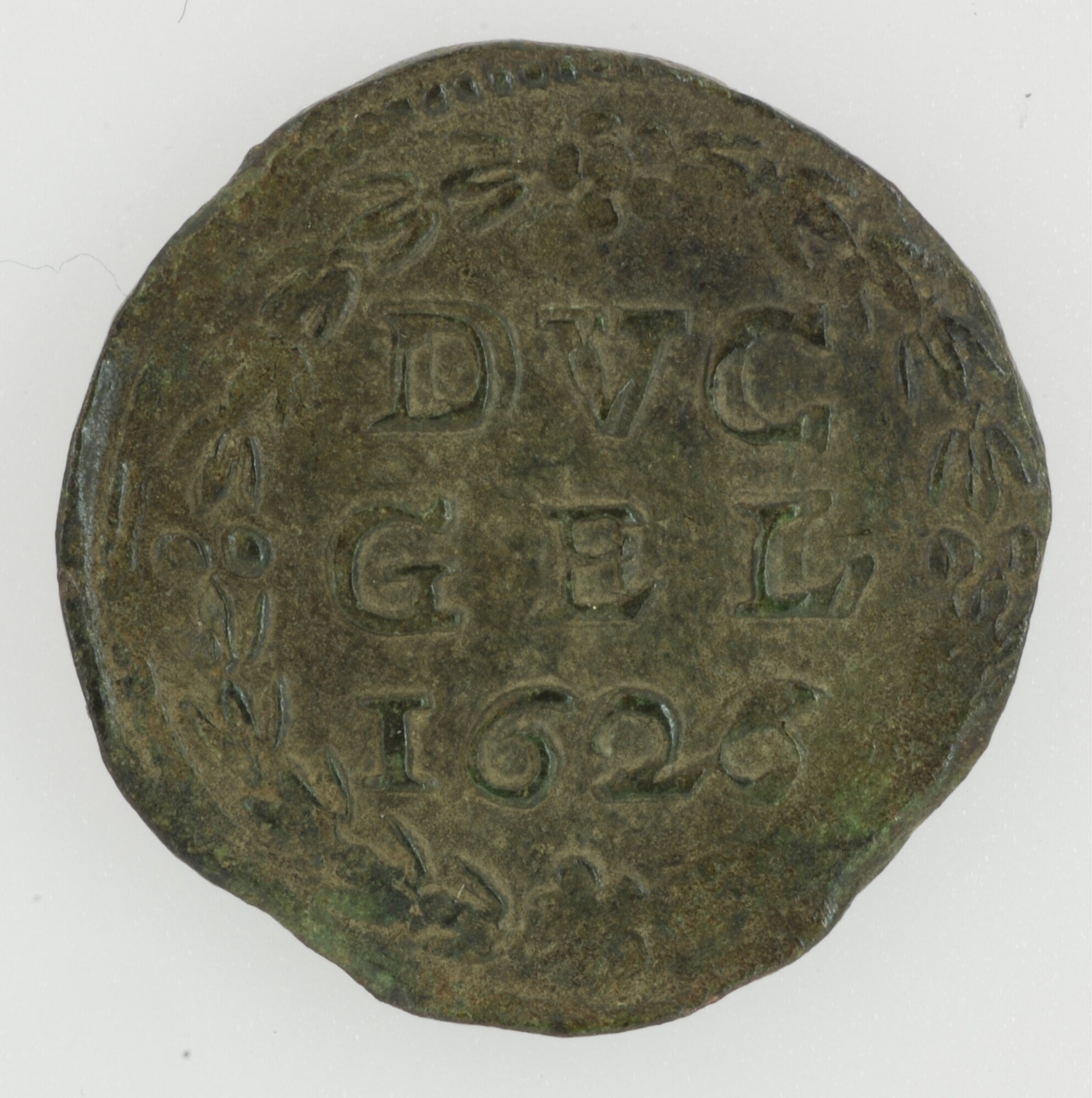 Duit; Gelderland Provincie (1581-1795); vz.: binnen een bladerkrans in drie regels DVC / GEL / 1626; kz.: wapenschild van Gelderland binnen achtpas en parelcirkel, met omschrift •IN•DEO[•]SPE[S•]NOST[R]A•(Gelders kruis); muntplaats: Harderwijk; gewicht: 2.25 gram; referentie: Purmer / Wiel 1008, CNM 2.17.184