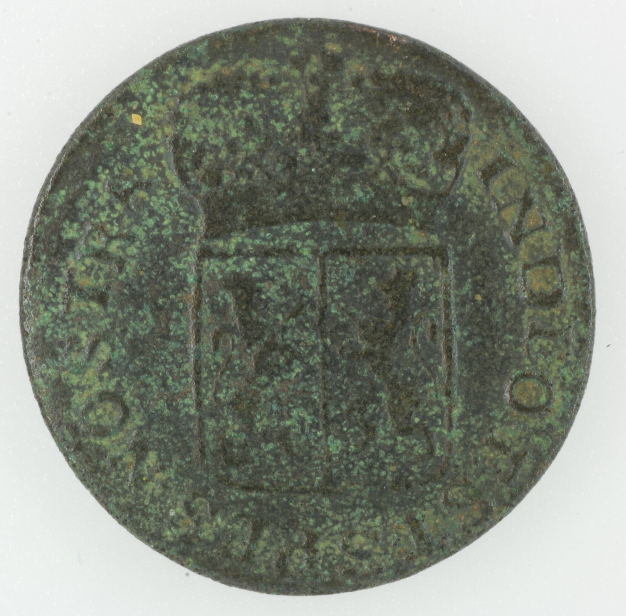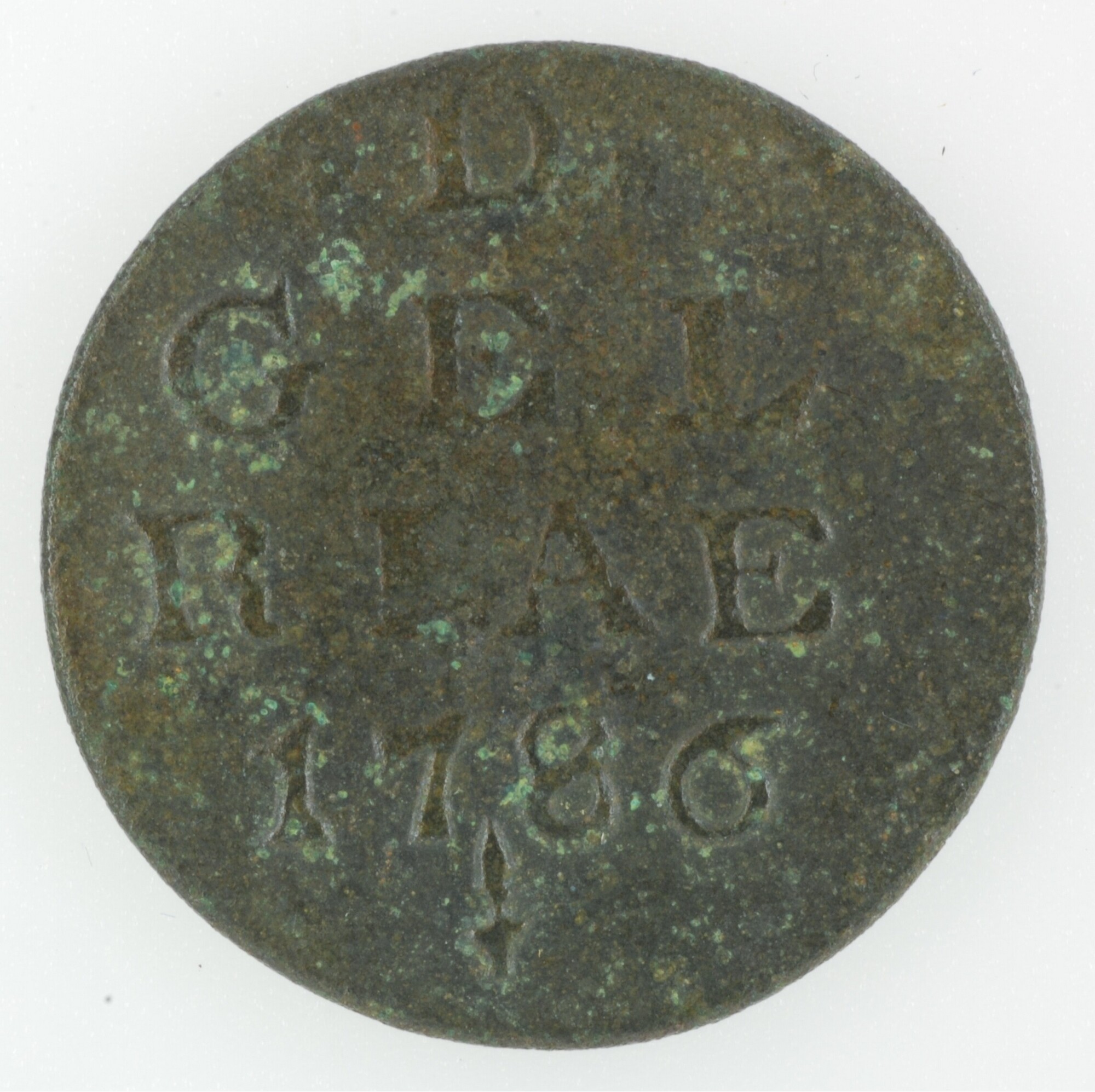 Duit; Gelderland Provincie (1581-1795); vz.: in vijf regels: (rozet) D (rozet) / GEL / RIAE / 1786 / (korenaar); kz.: gekroond wapenschild van Gelderland, met omschrift IN•DEO•EST•SPES•NOSTRA; muntplaats: Harderwijk; gewicht: 2.92 gram referentie: Purmer / Wiel 1018 var (zonder interpunctie om jaartal), CNM 2.17.196
