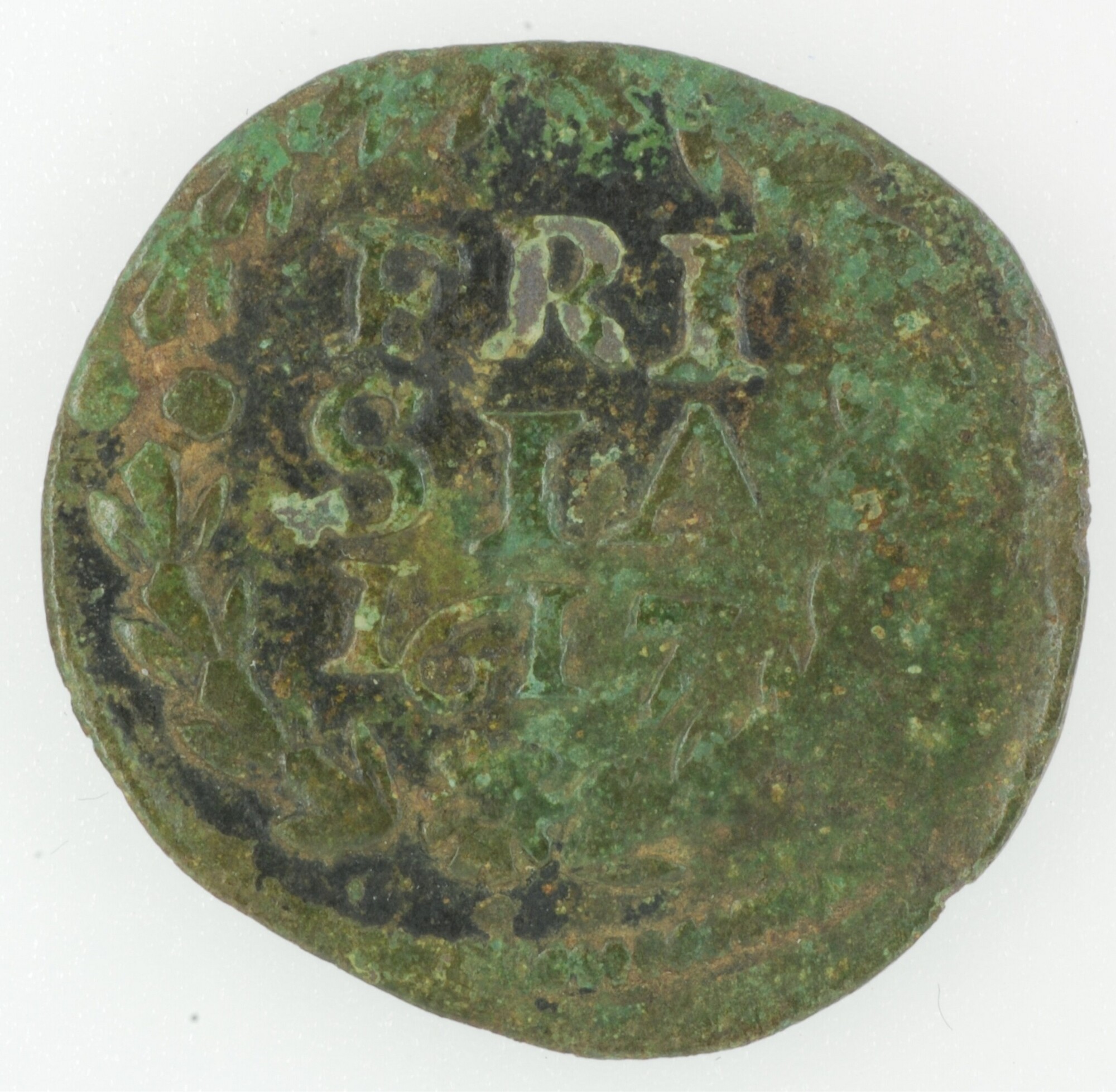 Duit; Friesland Provincie (1581-1795); vz.: in drie regels: FRI / SIA / 1617; kz.: met open kroon gekroond en versierd wapenschild van Friesland, met omschrift (leeuw) NISI•D[NS•]NO[BISCVM]; muntplaats: Leeuwarden; gewicht: 1.50 gram; referentie: Purmer / Wiel 6004, CNM 2.16.140