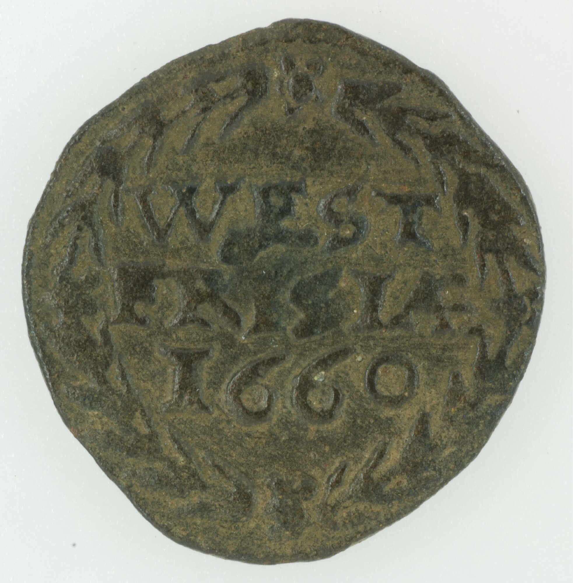 Duit; West-Friesland Provincie (1581-1795); vz.: in een bladerkrans in drie regels WEST / FRISIAE / 1660; kz.: gekroond en versierd wapenschild van West-Friesland, terzijde twee punten, met omschrift DEVS FORTI•[ET•S]P•NOS; muntplaats: Medemblik; gewicht: 2.03 gram; referentie: Purmer / Wiel 3003, CNM 2.46.91