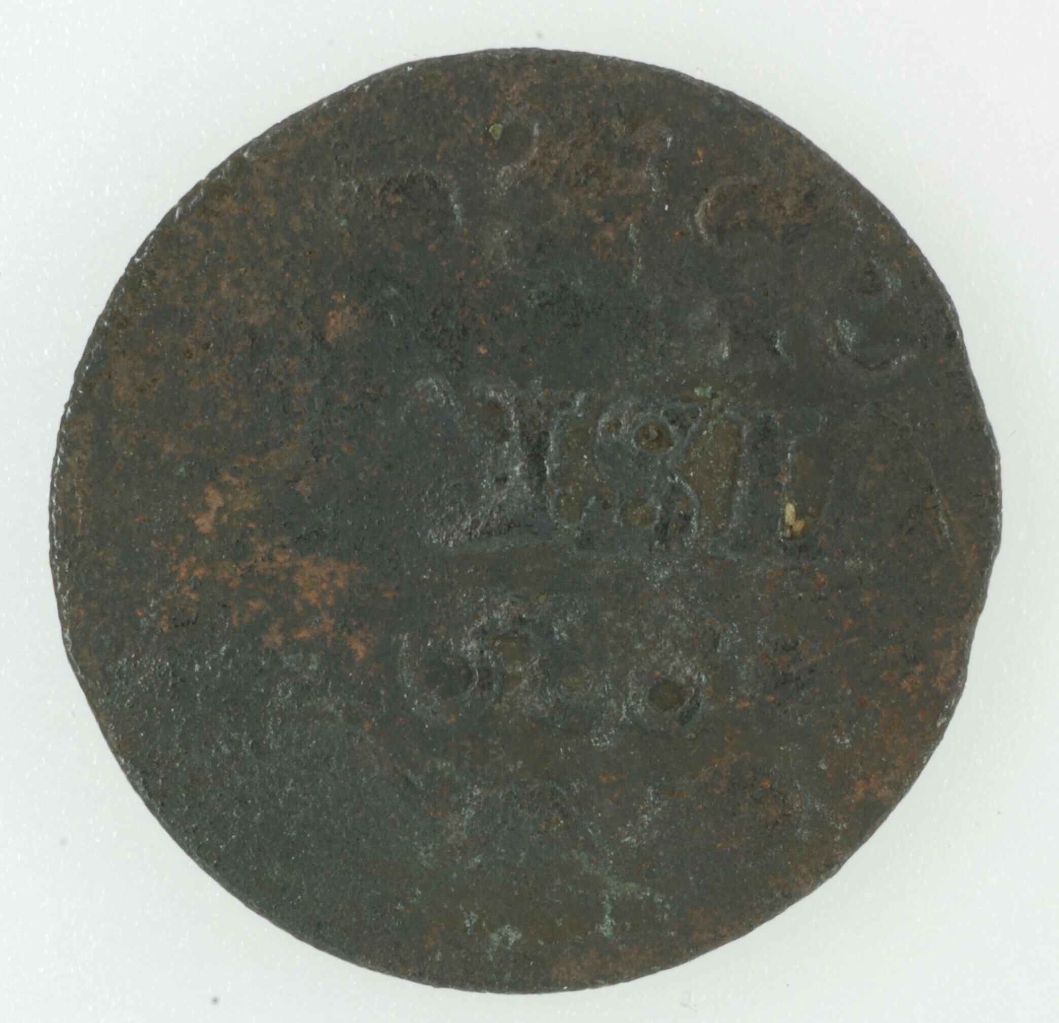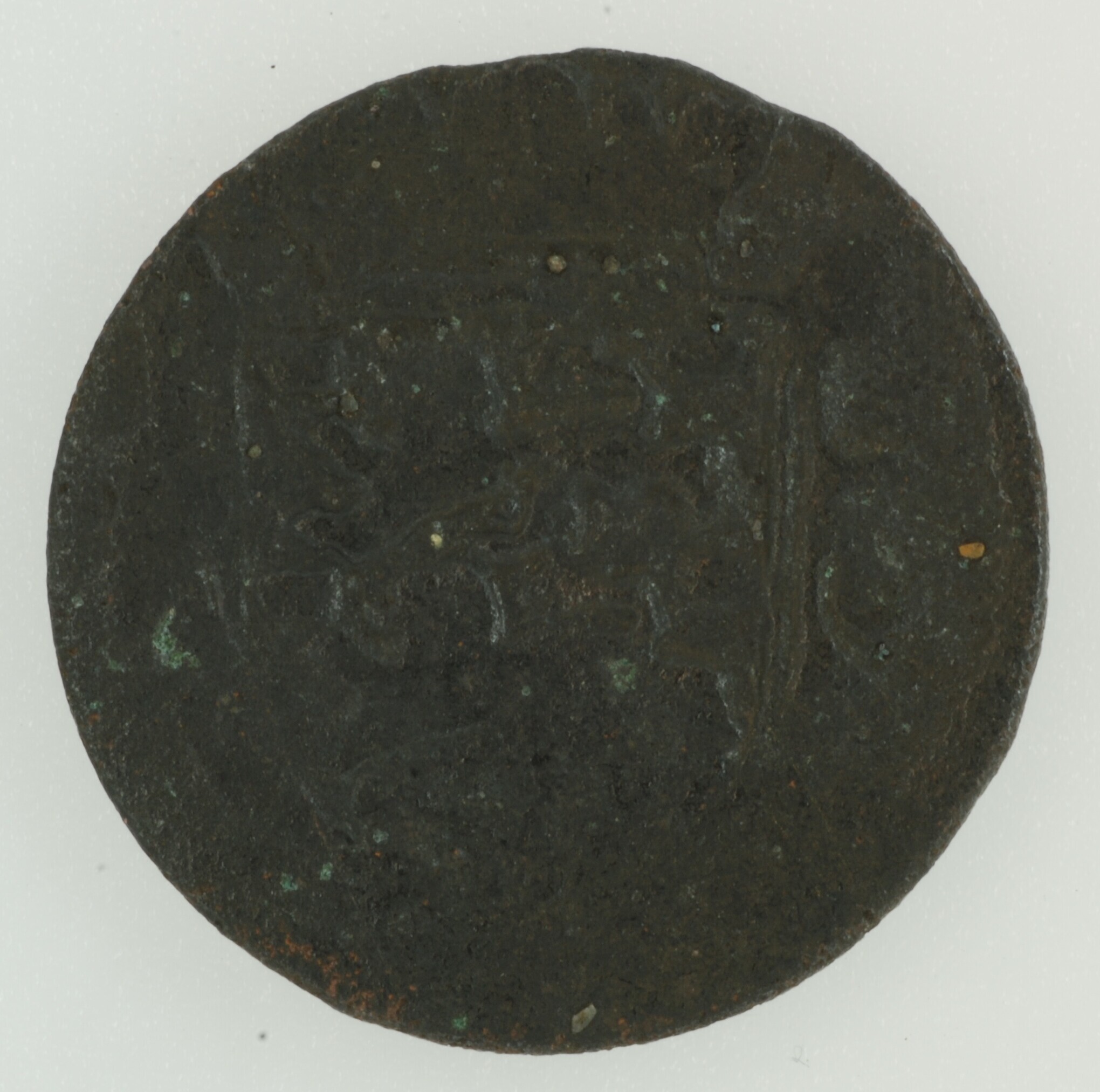 Duit; Friesland Provincie (1581-1795); vz.: muntmeesterteken leeuw tussen twee bladornamenten met daaronder in drie regels: [FR]ISIA / 1688 / bladornament rozet bladornament; muntplaats: kz.: gekroond en versierd wapenschild van Friesland; Medemblik; gewicht: 1.63 gram; referentie: Purmer / Wiel 3002, CNM 2.16.144