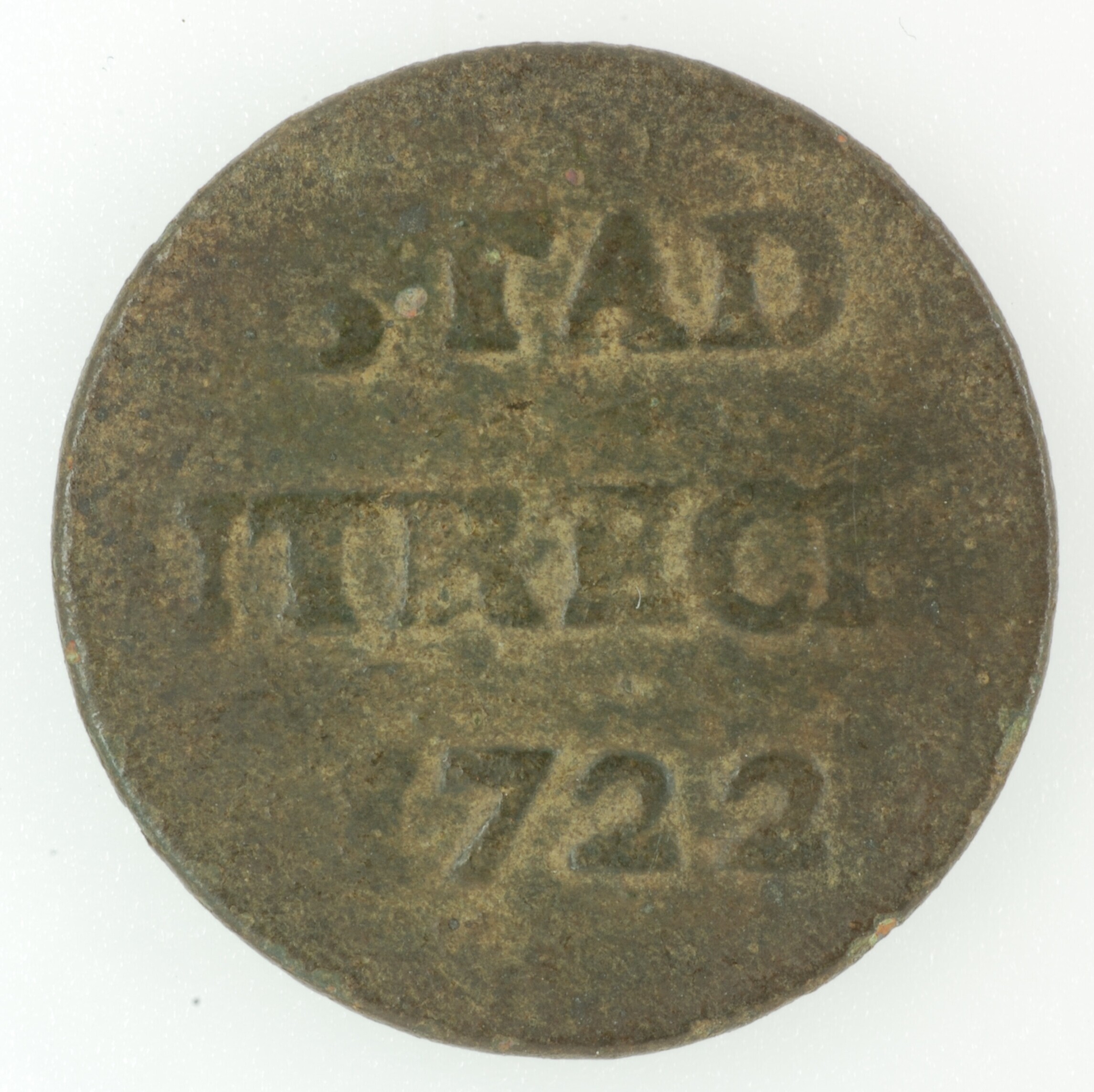 Duit; Utrecht Stad (1581-1795); vz.: in drie regels: STAD / UTRECHT / 1722; kz.: gedamasceerd stedelijk wapenschild; muntplaats: Utrecht; gewicht: 2.80 gram; referentie: Purmer / Wiel 5110, CNM 2.44.20