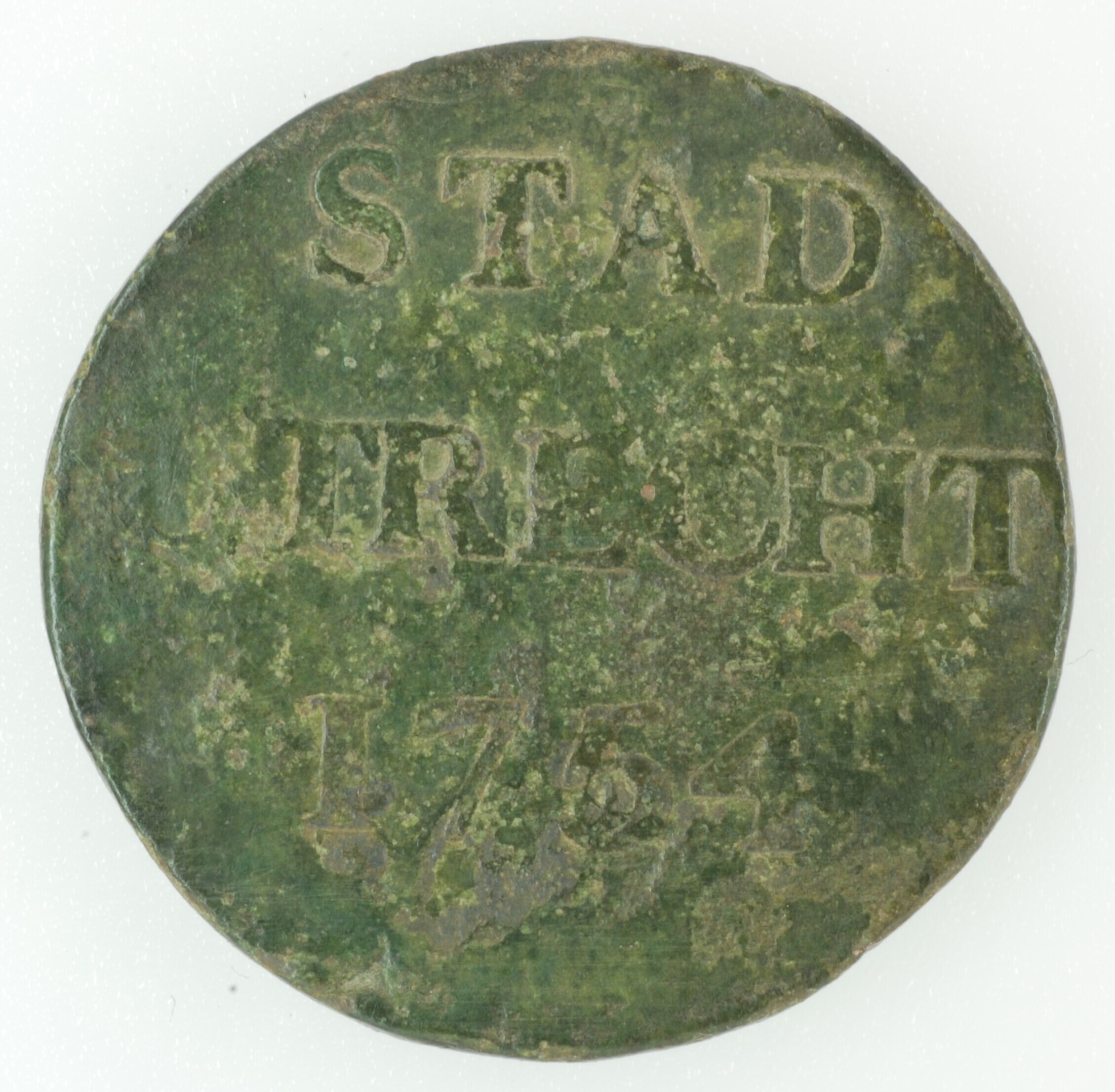 Duit; Utrecht Stad (1581-1795); vz.: in drie regels: STAD / UTRECHT / 1754; kz.: gedamasceerd stedelijk wapenschild grof gearceerd, gehouden door twee leeuwen, de afsnede bestaat uit een dunne lijn, met hieronder een versierde accolade met een kleine schelp; muntplaats: Utrecht; gewicht: 3.28 gram; referentie: Purmer / Wiel 5111, CNM 2.44.21