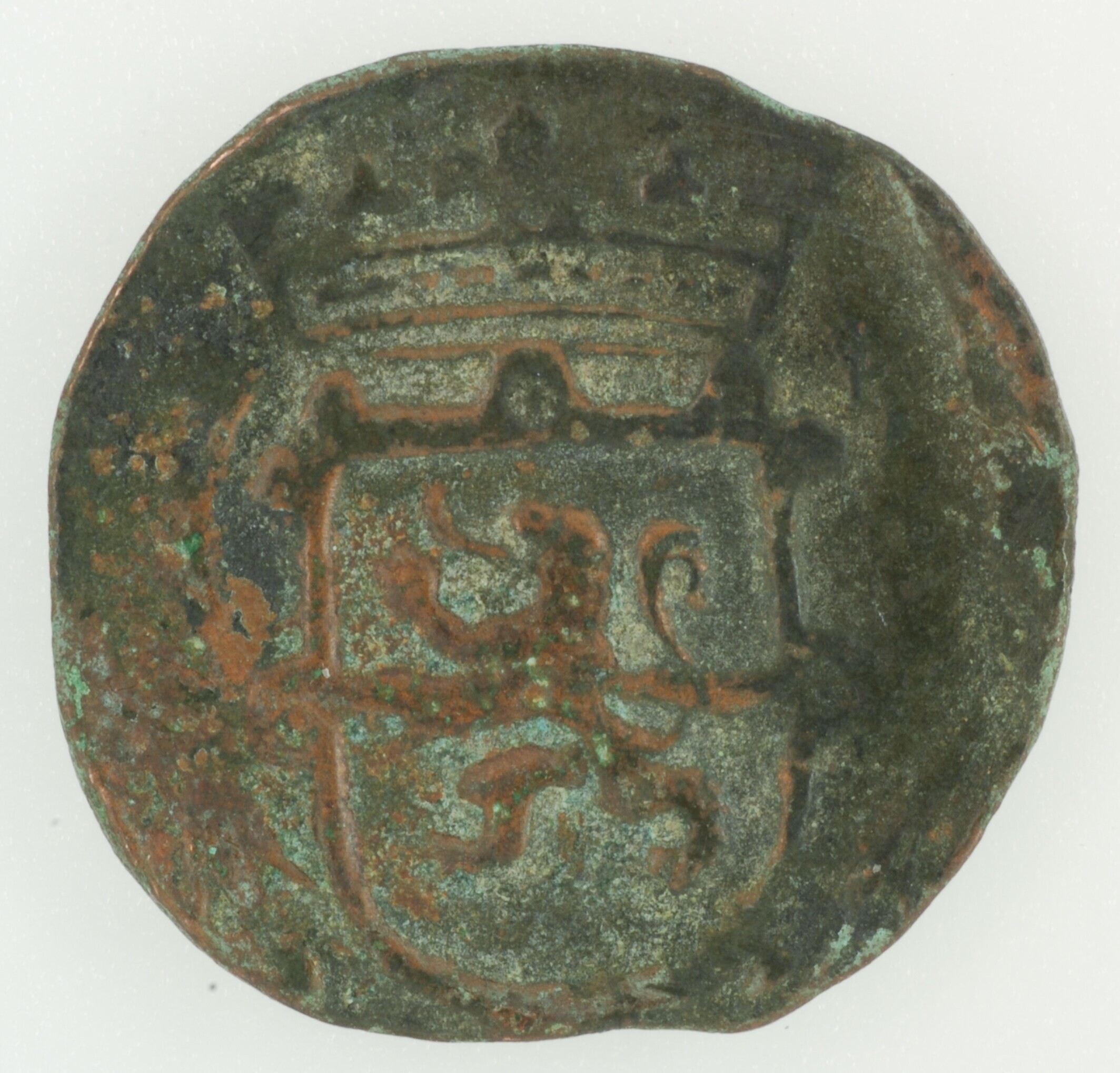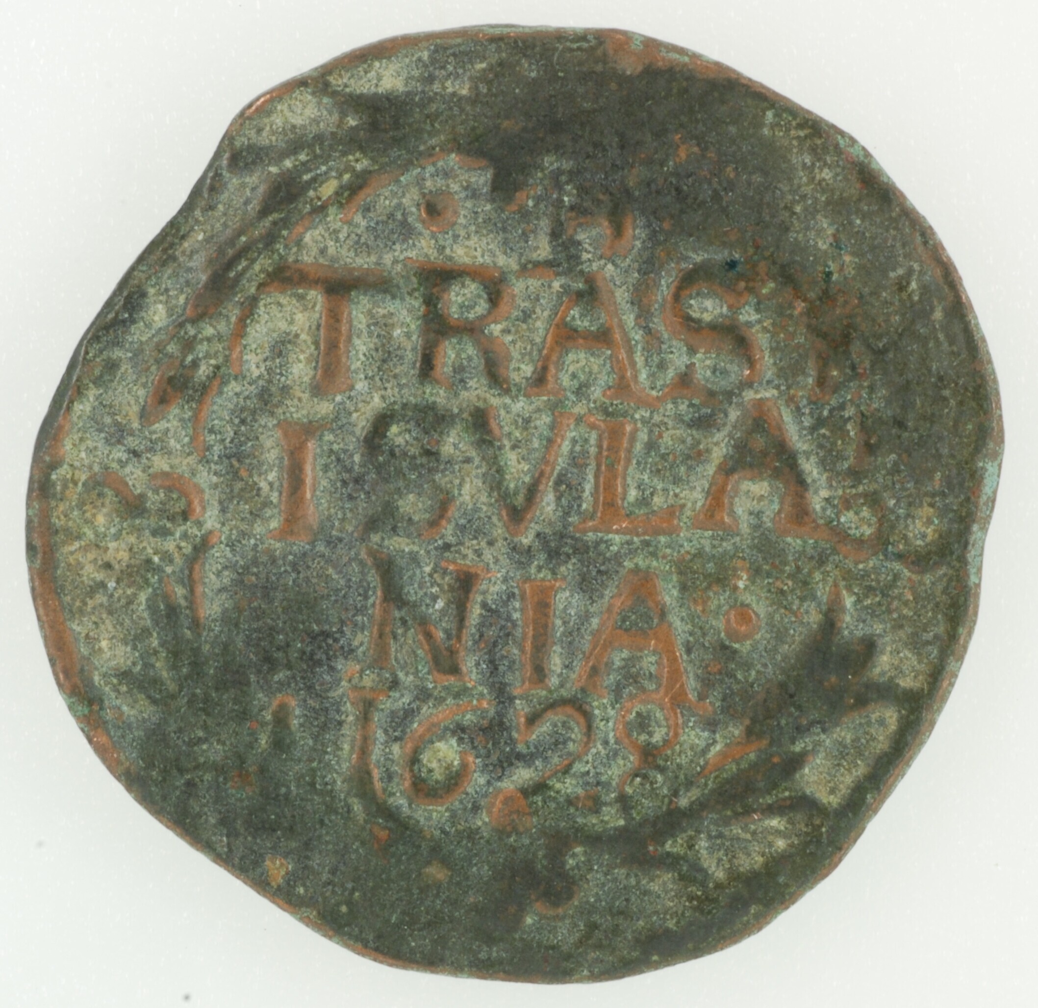 Duit; Overijssel provincie (1581-1795); vz.: in vier regels: TR^AS / ISVLA / [•]NIA• / 1628; kz.: gekroond en versierd wapenschild van Overijssel in een bladerkrans; muntplaats: Kampen; gewicht: 1.59 gram; referentie: Purmer / Wiel 7005, CNM 2.38.111