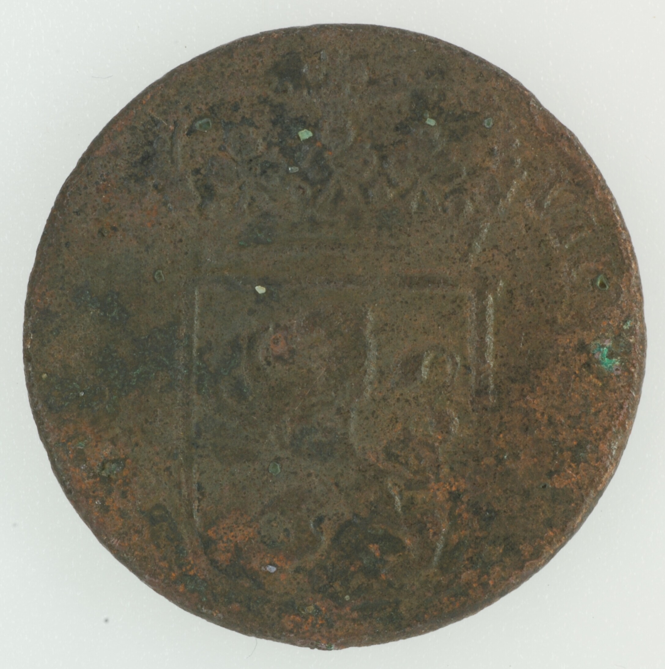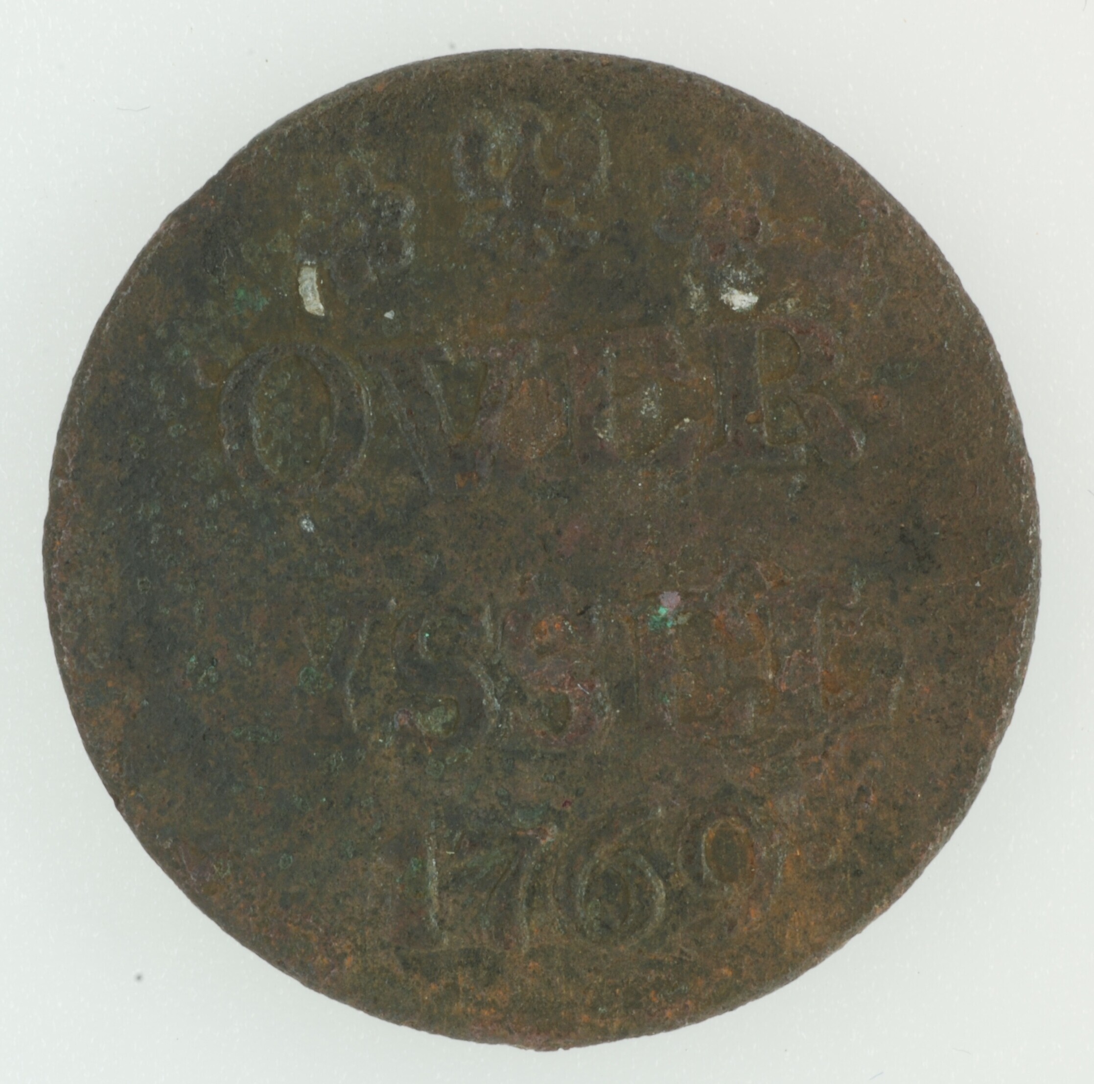 Duit; Overijssel provincie (1581-1795); vz.: in vier regels: rozet (adelaar) rozet / OVER / YSSEL / 1769•; kz.: gekroond wapenschild van Overijssel, met omschrift VIG[ILATE] – ET O[RATE]; muntplaats: Kampen; gewicht: 2.92 gram; referentie: Purmer / Wiel 7009, CNM 2.38.115