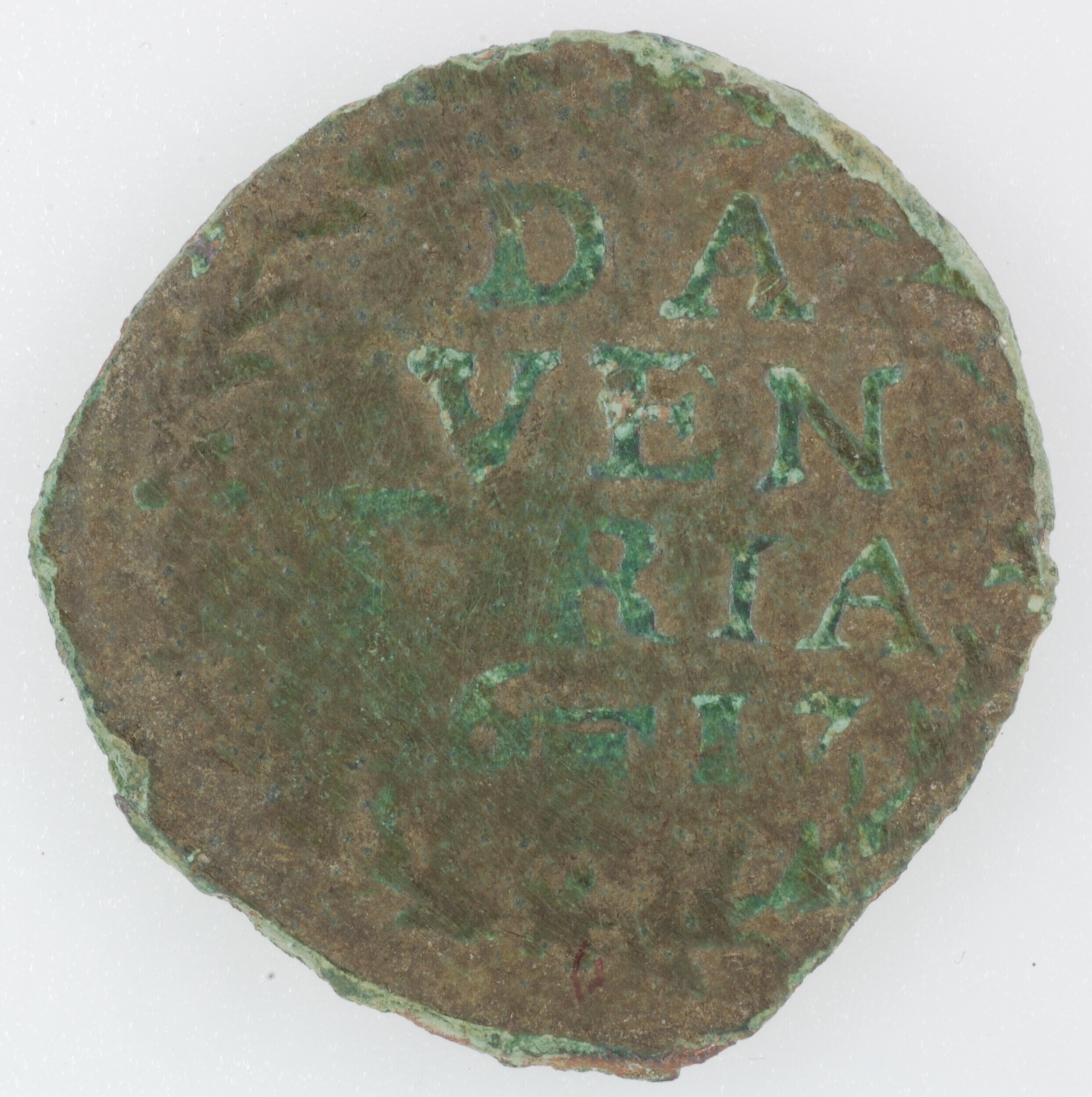Duit; Overijssel Provincie (1581-1795); Steden: Deventer; vz.: binnen bladerkrans in vier regels: DA / VEN / TRIA / 16 (wapen Oversticht) 17; kz.: gekroond wapenschild van Deventer rustend op een klein kruis, waarvan het onderste gedeelte reikt tot de muntrand, met omschrift NO VIDI [I]VST – DER; muntplaats Deventer; gewicht: 1.69 gram; schaars; referentie: Purmer ...