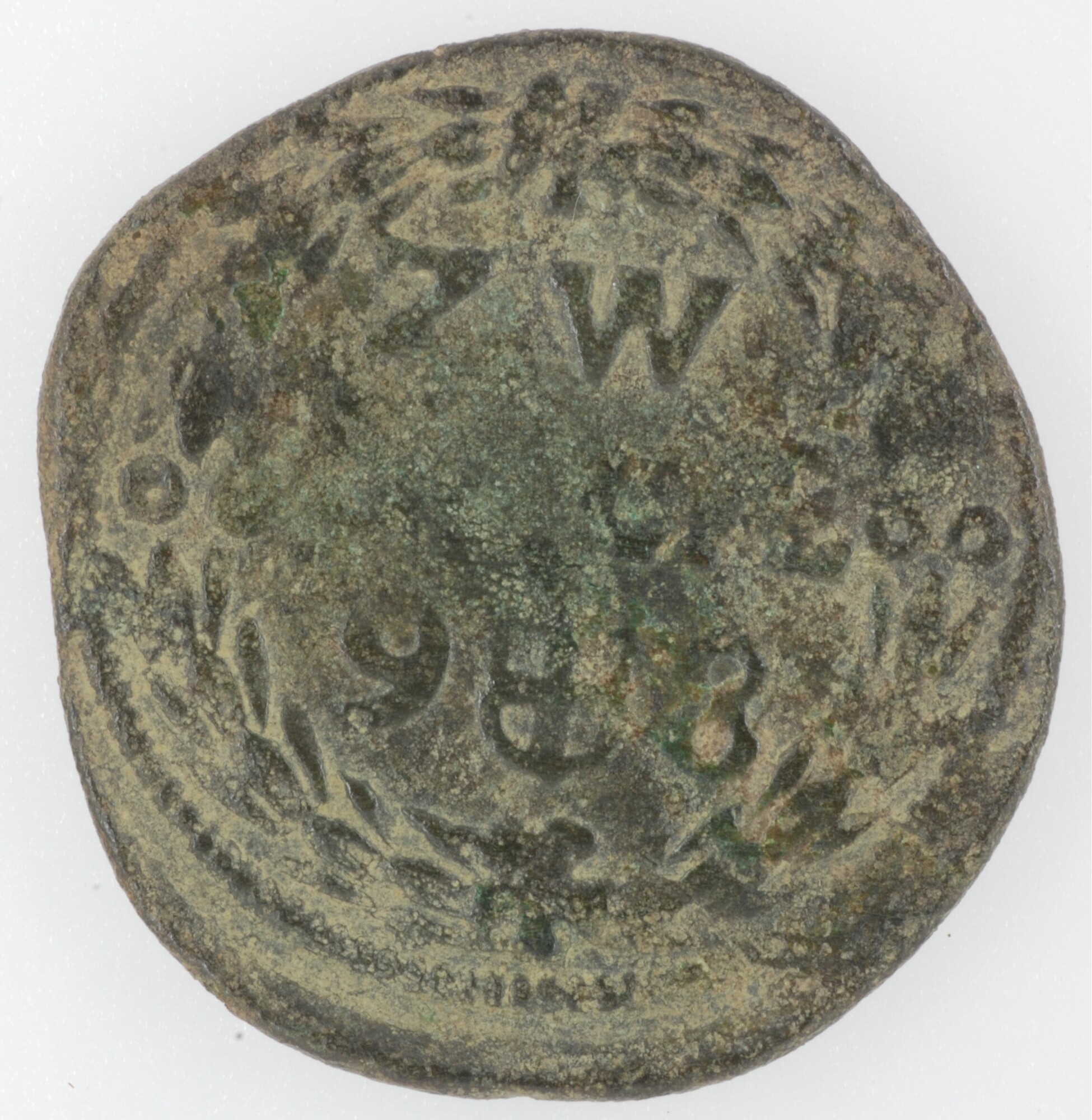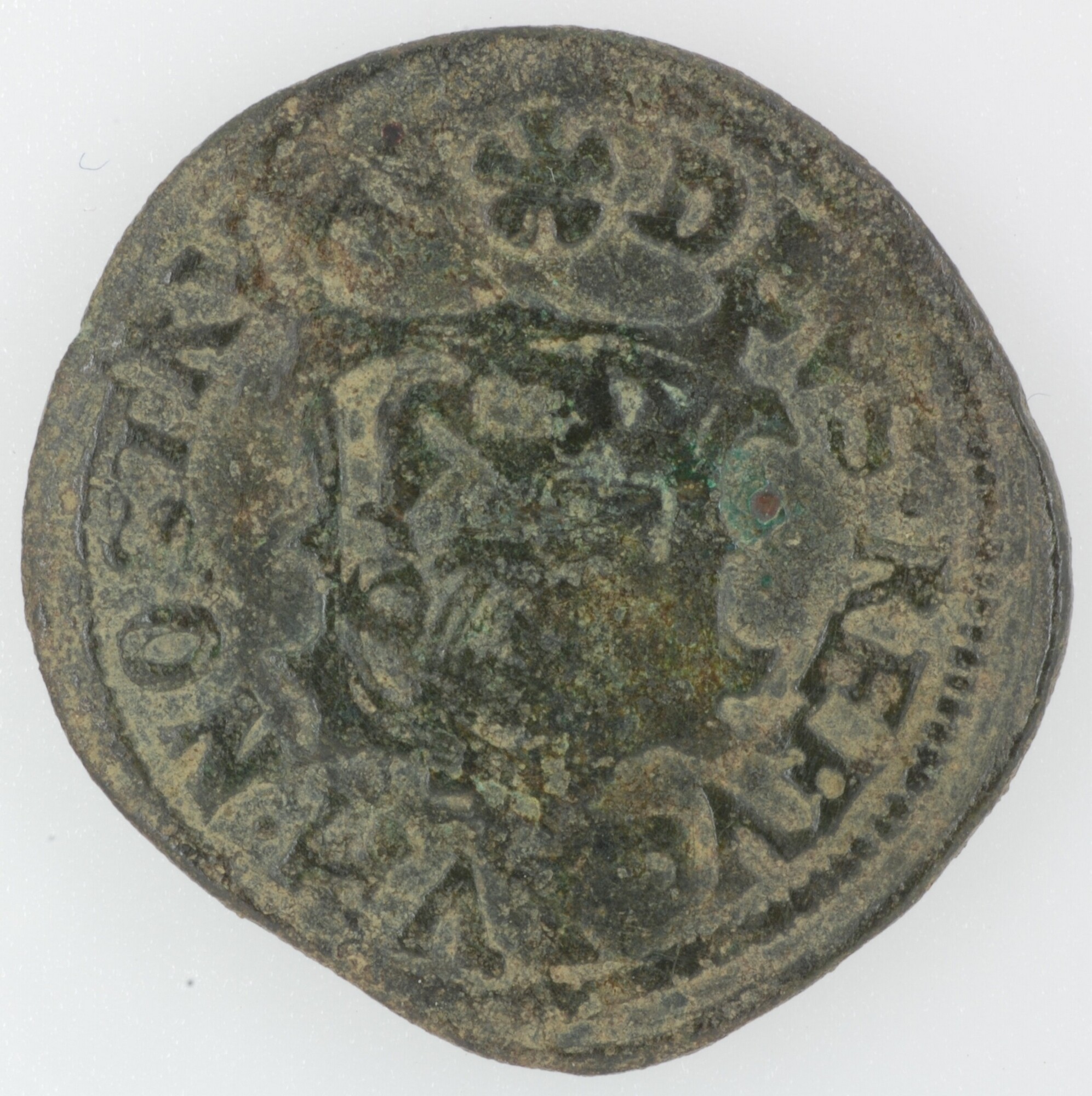Duit; Overijssel Provincie (1581-1795); Steden: Zwolle; vz.: binnen een bladerkrans in drie regels: ZW / [OL]LAE / 15 (stadswapen) 98; kz.: wapenschild van Zwolle (st. Michiel met als schild het Zwolse kruis, met omschrift DEVS•REFVGIVM•NOSTRV[M] (bloem); muntplaats Zwolle; gewicht: 3.22 gram; zeldzaam; referentie: Purmer / Wiel 7301, CNM 2.52.116