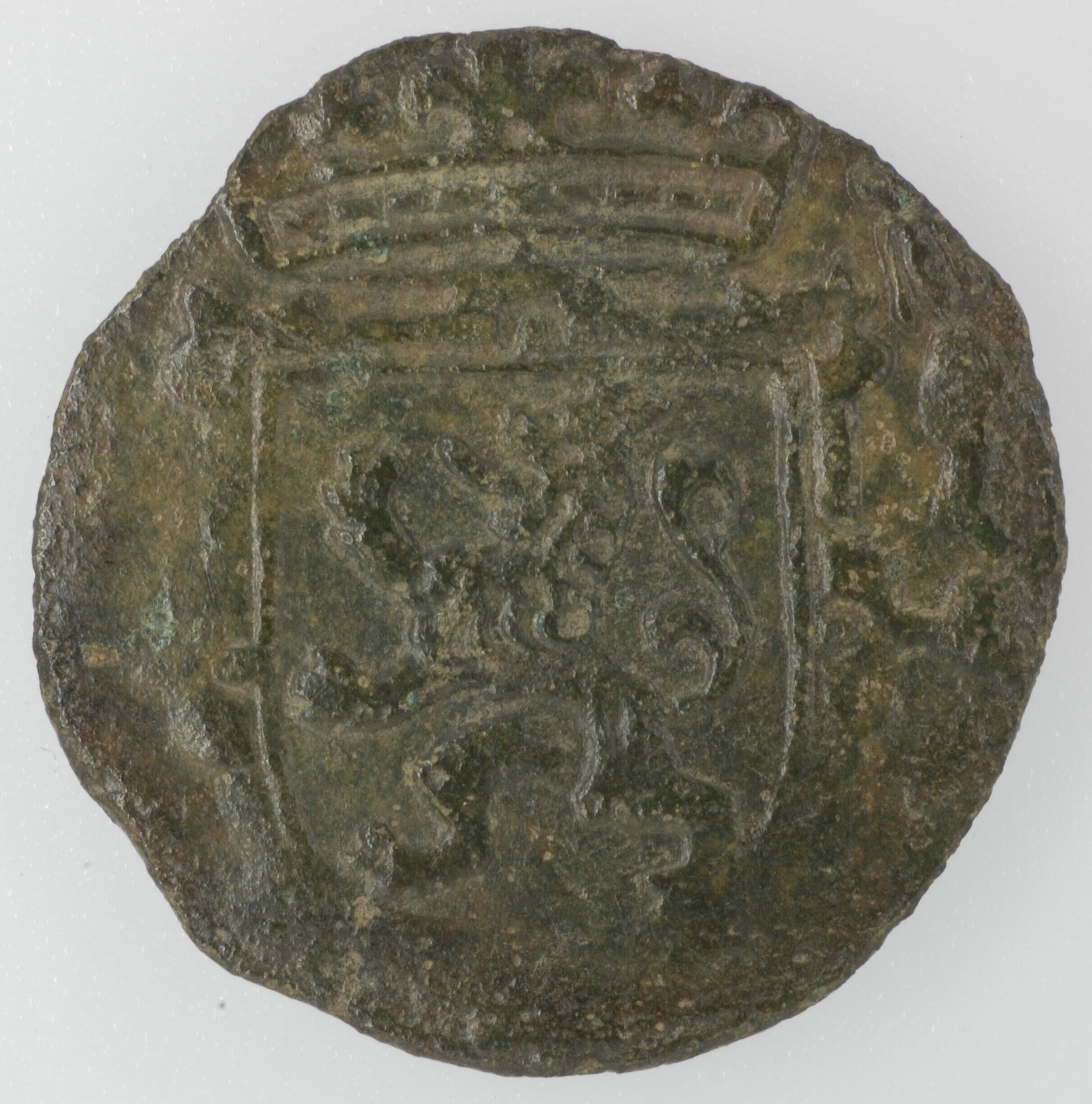 Duit; Gelderland Provincie (1581-1795); Steden, Batenburg; vz.: in vijf regels: • [•] / BAT / ENBVR / GVM / • •; kz.: versierd en gekroond wapenschild met ongewapende klimmende leeuw, naar links gewend, in twee halve bladerkransen; muntplaats Batenburg; gewicht: 1.13 gram; referentie: Purmer / Wiel 1302, CNM 2.05.95