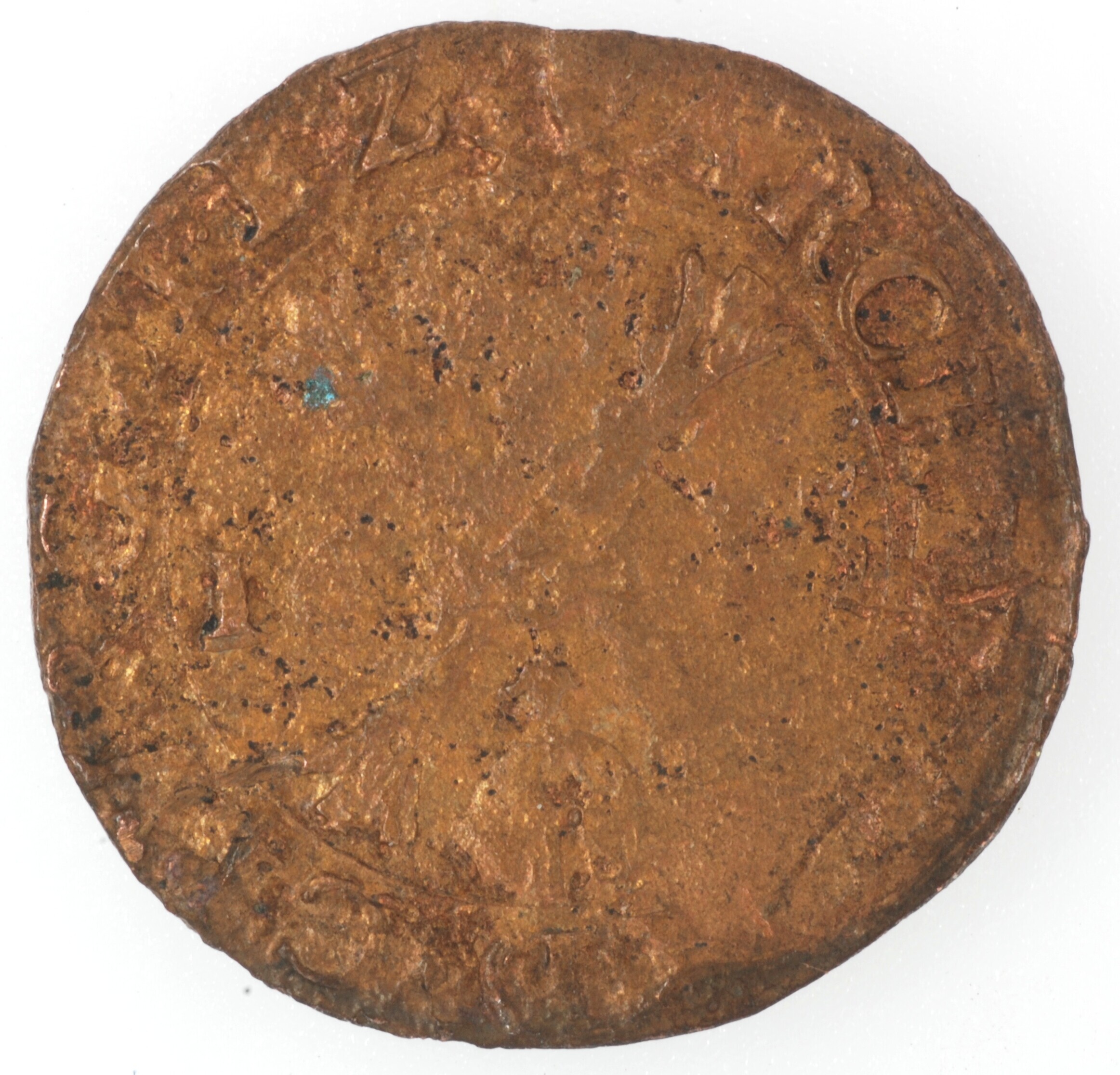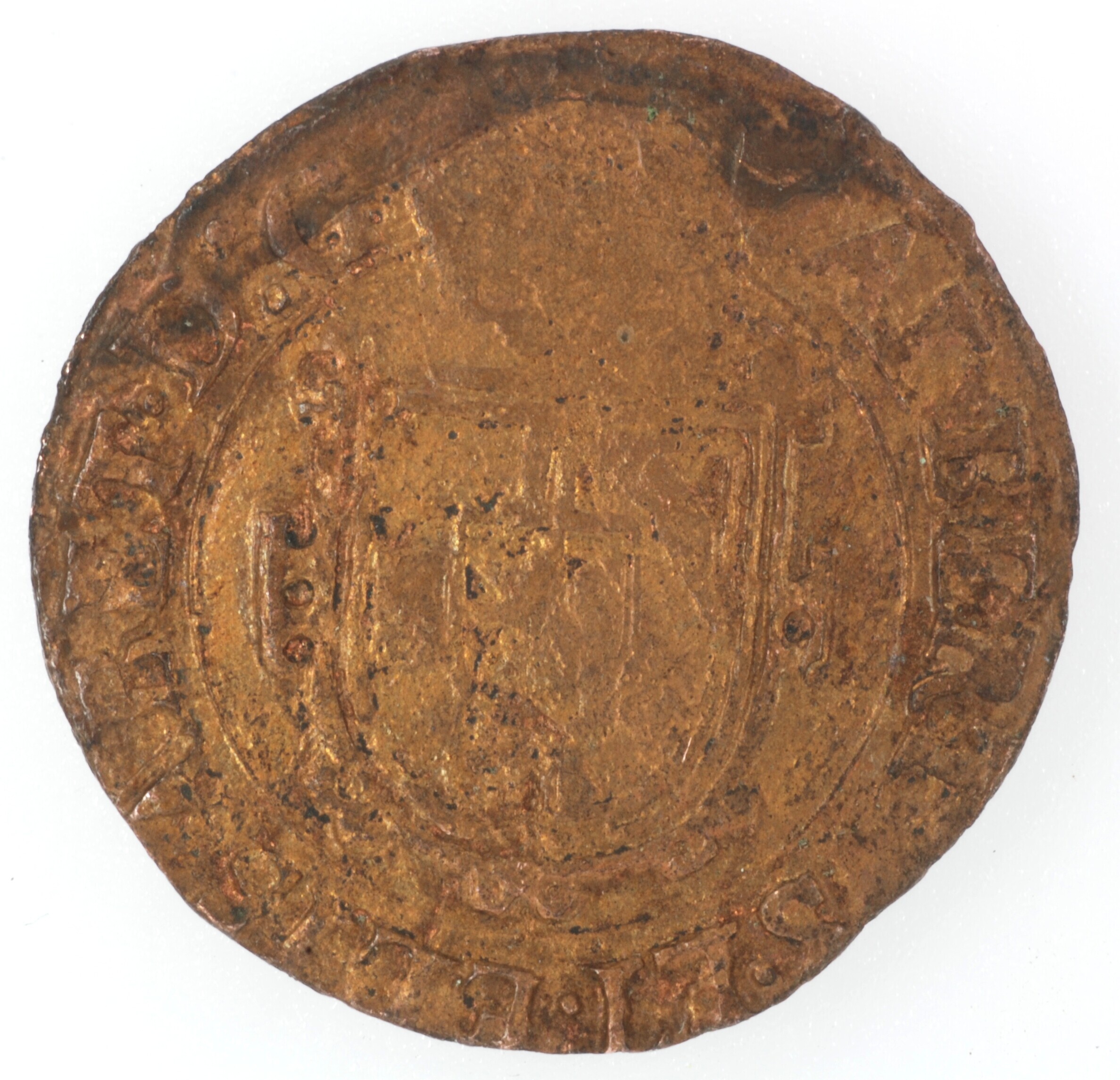 Duit; Brabant Hertogdom (1183 -1795); Albert en Isabella (1598-1621); vz.: gekroond Oostenrijks-Bourgondisch wapenschild, in het midden een wapenschild met een klimmende leeuw naar links, met omschrift (knol) ALBERT[V]S•ET•ELISABET•D:G; kz.: Stokkenkruis met erboven een kroon en met ter weerszijden 16 – 15 gedeeltelijk binnen een cirkel, met omschrift ARCHID[•AVST]•DVC•BVRG•ET•B•Z; muntplaats: ’s-Hertogenbosch; gewicht: 1.60 gram; referentie: Purmer ...