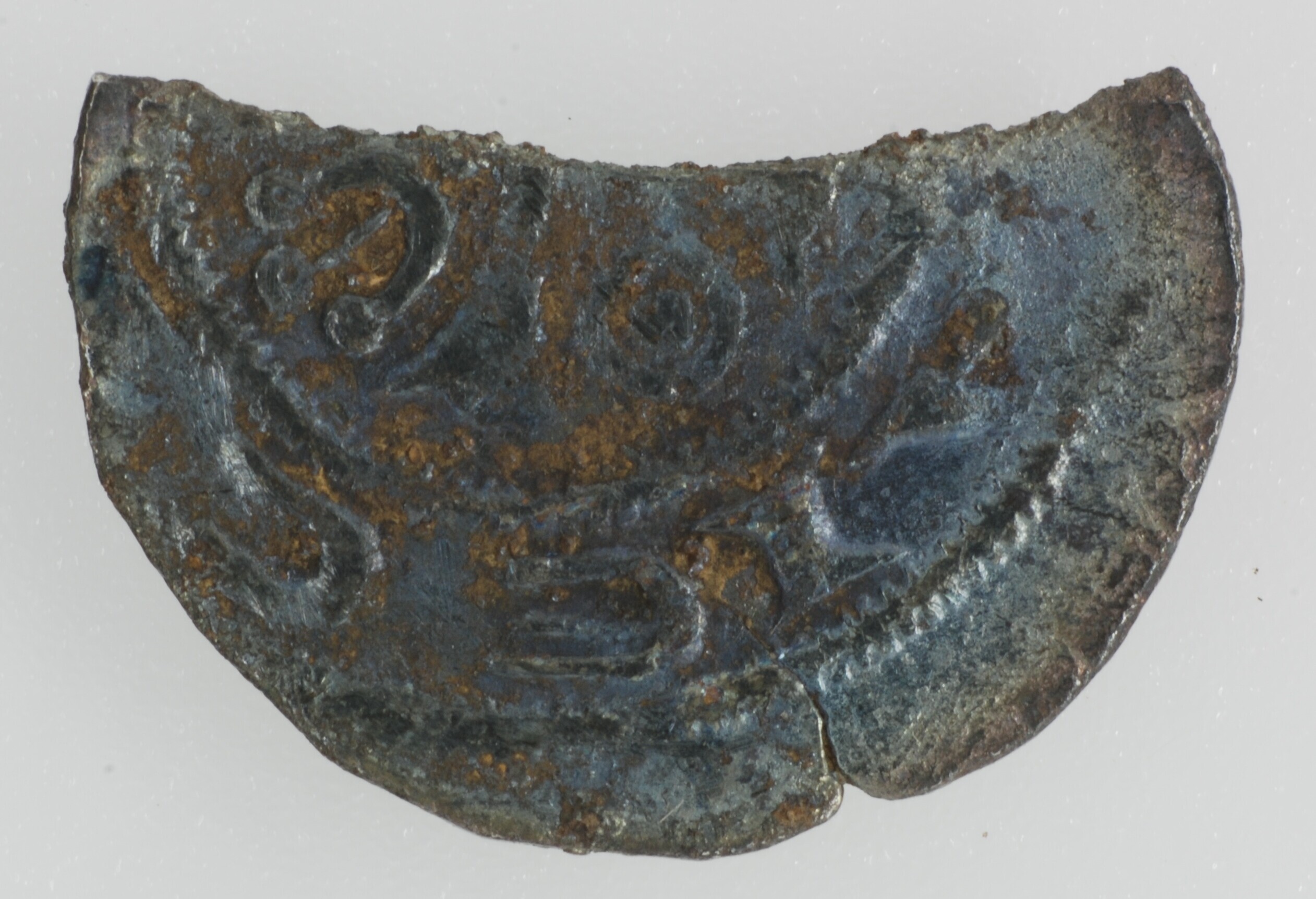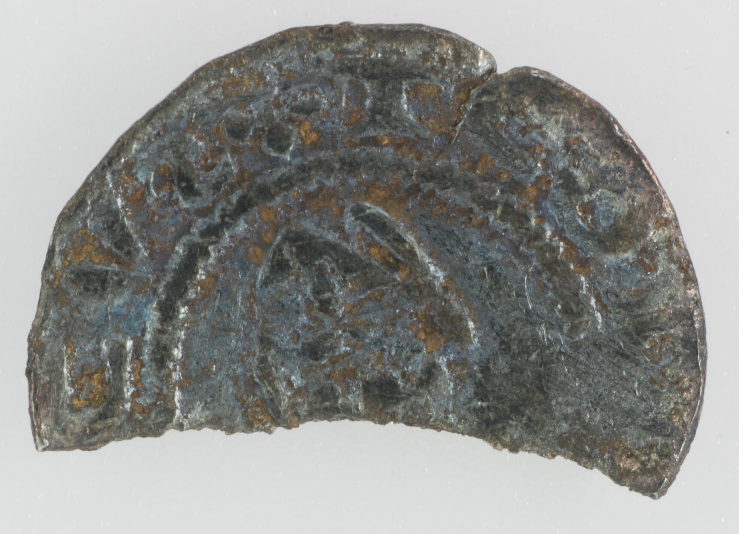 Penning; Utrecht Bisdom (1010-1528); Diederik van der Ahr (1198-1212); vz.: bisschop van voren met staf binnen parelcirkel, met omschrift +TEOD[E - RI]CVS (S in retrograde); kz.: kort gevorkt kruis met beurtelings een ring met punt en drietandvorming voorwerp in de kwadranten binnen parelcirkel, met omschrift +TR[AIEC]TVM; muntplaats: Utrecht; gewicht: 0.37 gram; referentie: vdChijs VI.2-5; fragment