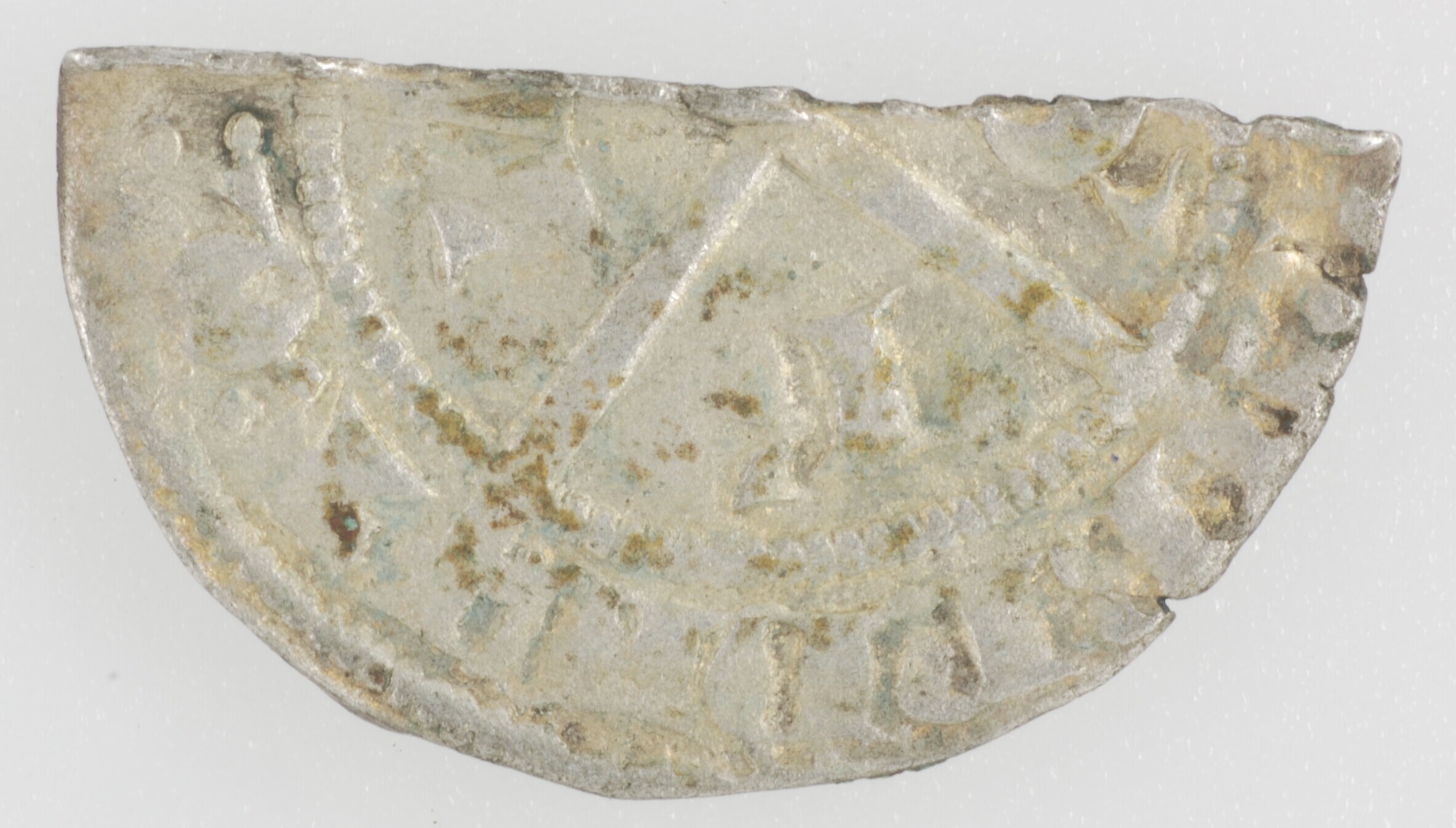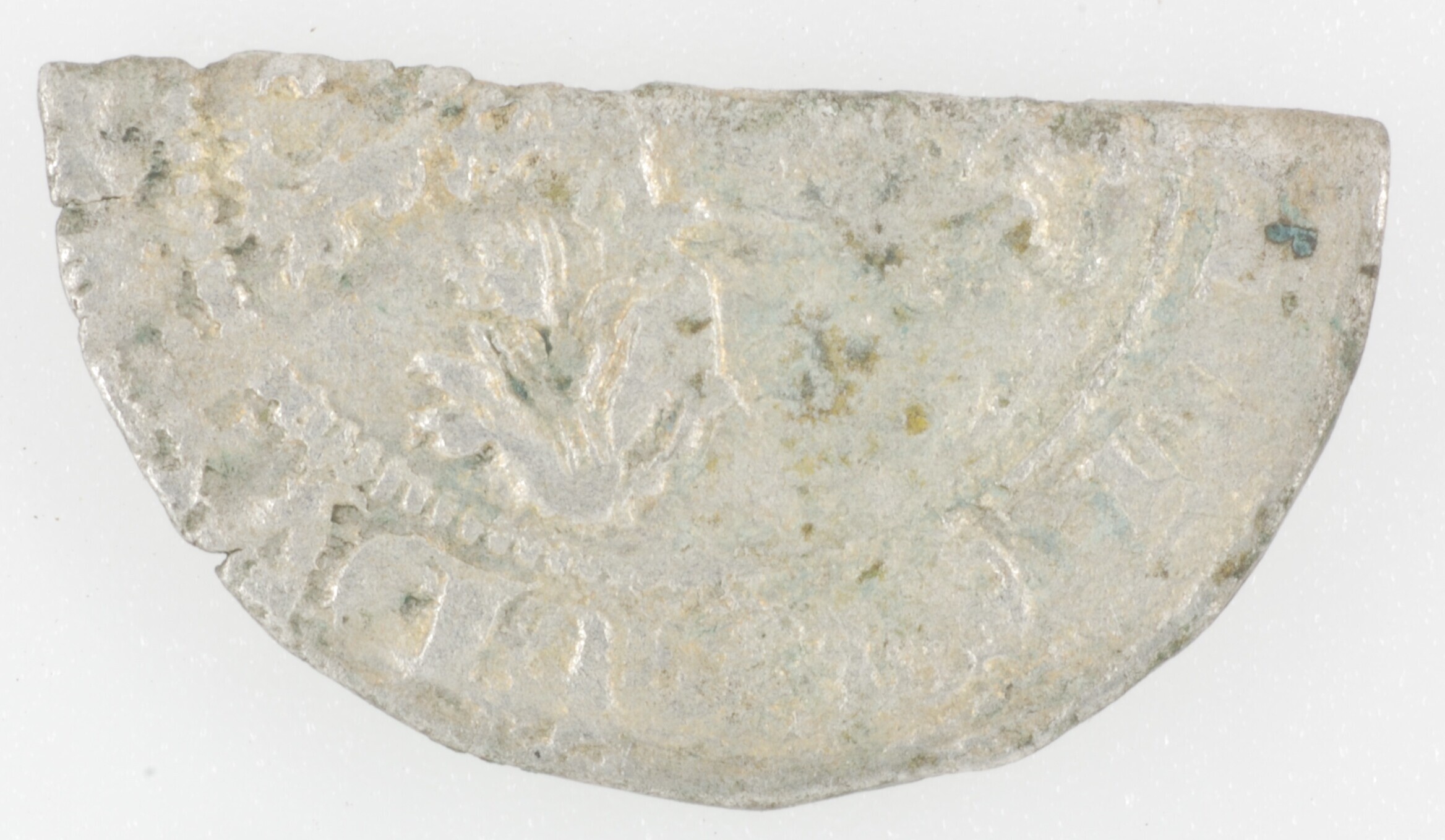Kwart plak; Holland Graafschap (1049-1581); Willem V (1345-1389); vz.: zittende leeuw naar links met helm en helmteken binnen parelcirkel, met omschrift [+GVILLEM:]DVX:COM:H:Z:ZEL; kz.: lang gevoet kruis met H / L / [A] / D’ in de kwadranten, met omschrift BNDIC / T:Q’:[VE / NIT:IN / NE:]DI; muntplaats: Dordrecht; gewicht: 0.48 gram; zeer zeldzaam; referentie: Grolle ...