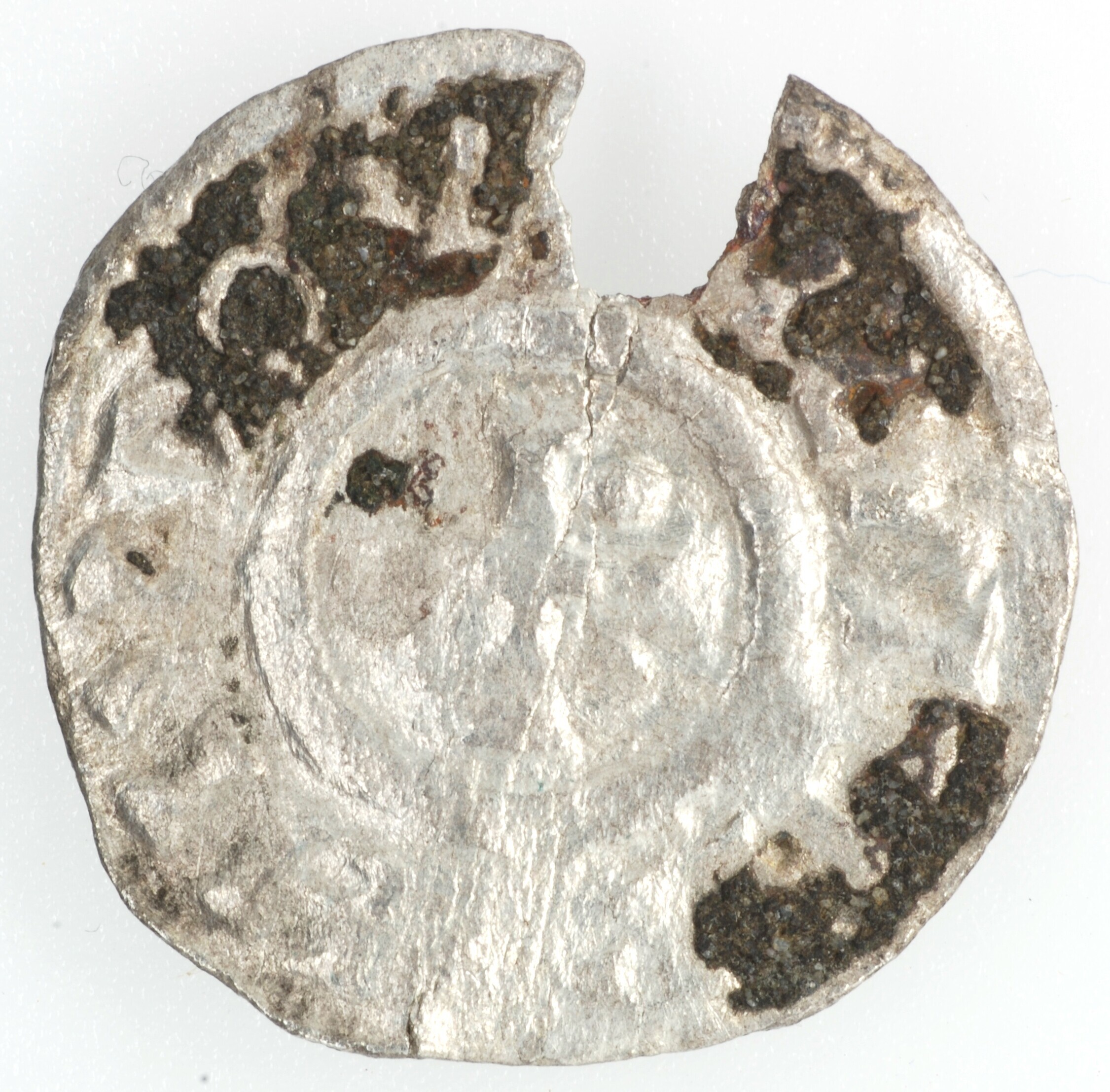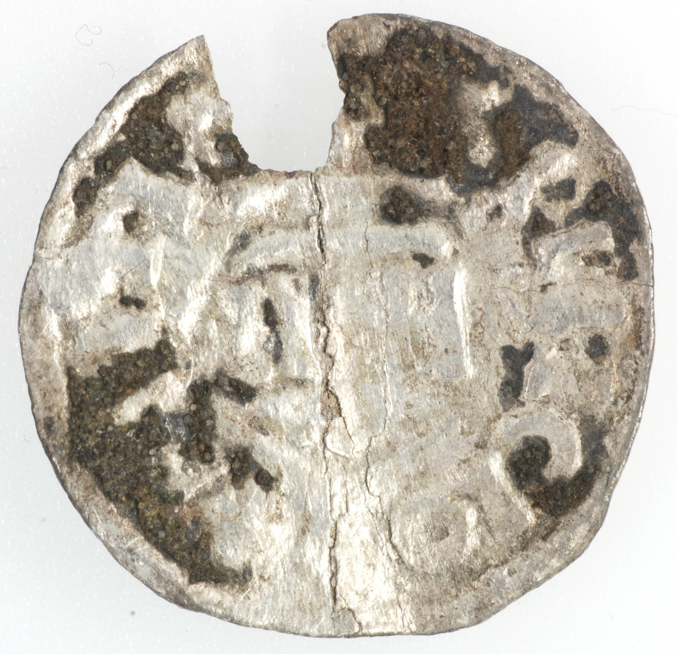Denarius; Karolingische Rijk; Lodewijk de Vrome (814-840), vz.: kort gevoet kruis met punten in de kwadranten zonder cirkel, met omschrift [+]HLVDOV[IC]VS VIIIP (na spatie lastig leesbaar); kz.: tempel zonder cirkel, met omschrift: +XPISTIA..PIIICIO; muntplaats: onbekend; gewicht: 1.17 gram; referentie: Morrison / Grunthal: 472 en verder; bewust doorboord