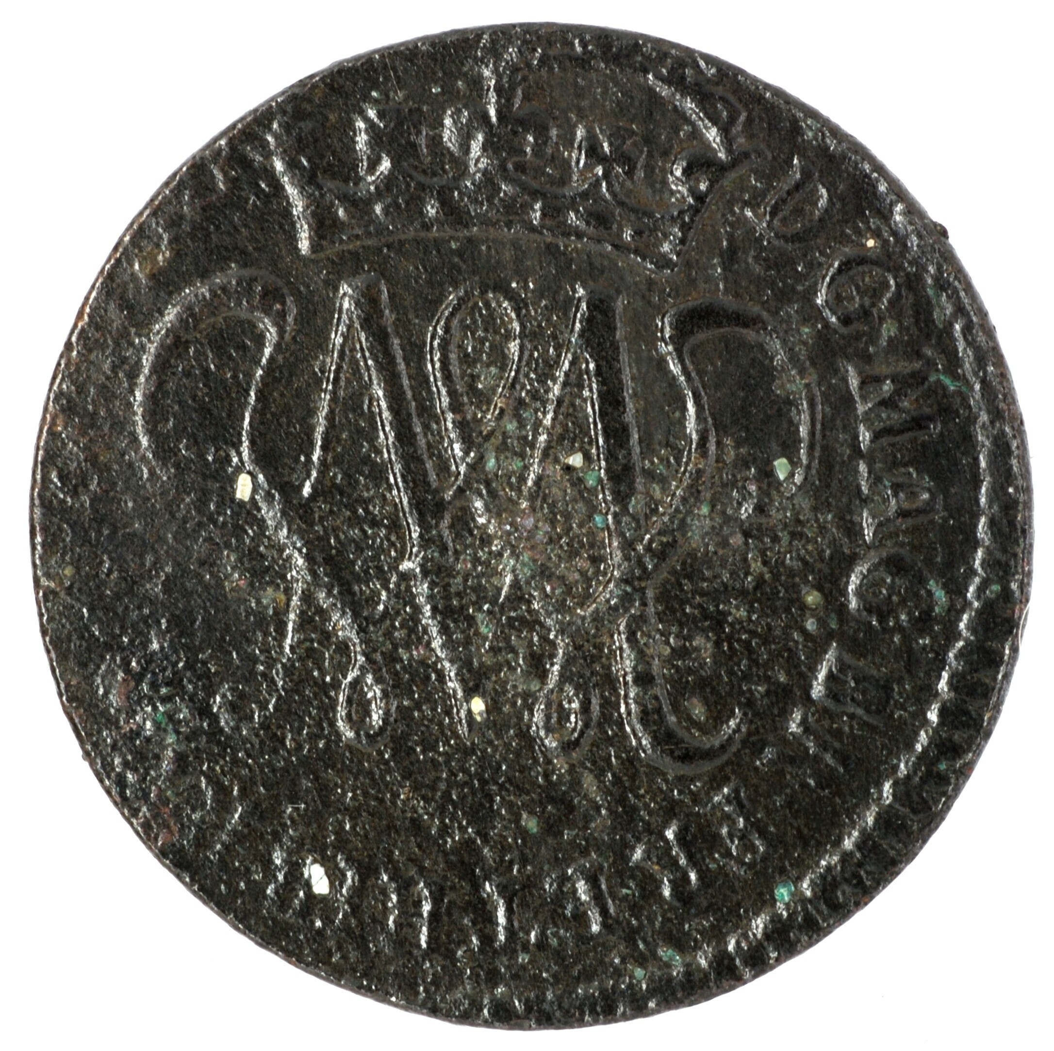 Bodle; Schotland; William en Mary (1689-1694); vz.: gekroond WM-monogram, met omschrift D G•MAG BR FR ET HIB [REX ET REGINA]; kz.: gekroonde en met bladeren omhulde ananas , met omschrift [NE MO ME] IMPVNE [LACESS]ET 1692; muntplaats: Edinburgh; gewicht: 2.36 gram; referentie: Spink 5674
