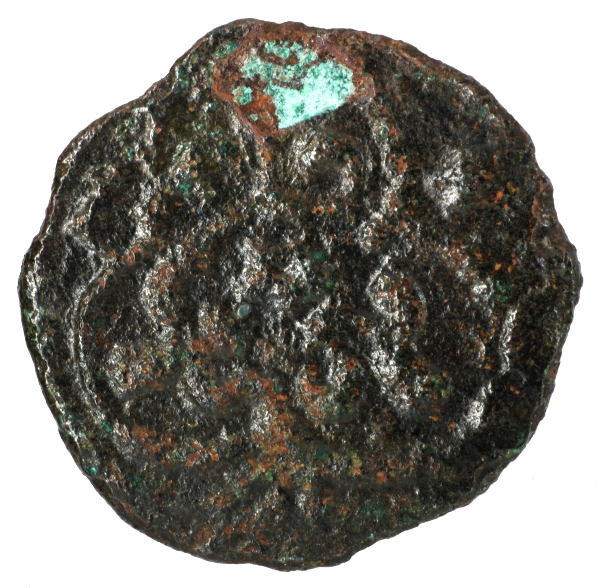 Farthing, type II; Schotland; James III (1460-1488); vz.: drie lelies binnen driepas; kz.: lang kruis met gebloemd uiteinde met ruitersporen in de kwadranten binnen parelcirkel, met omschrift MO / [PA / V]P / ER; muntplaats: Edinburgh; gewicht: 0.41 gram; referentie: Seaby / Purvey 5314
