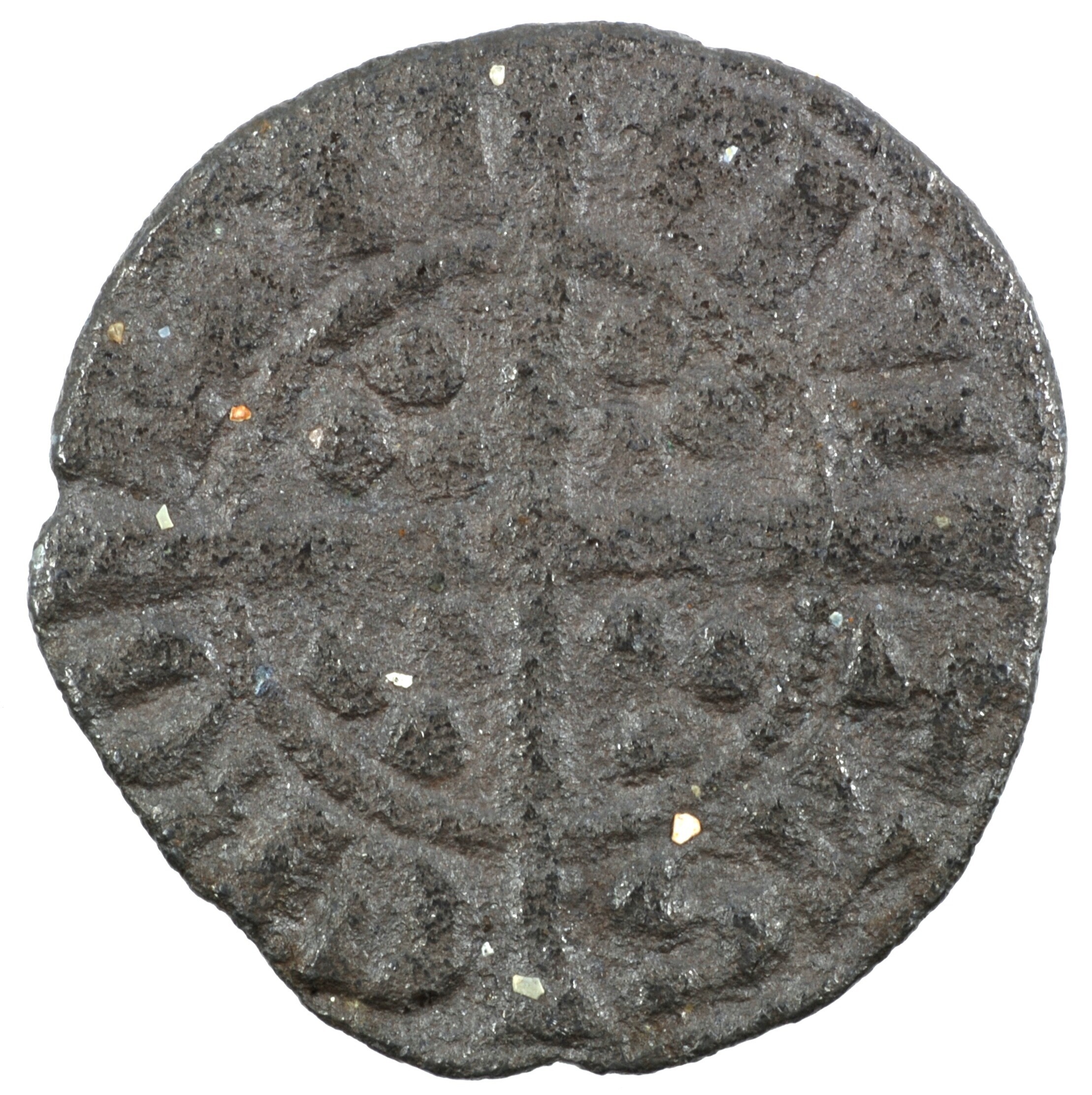 Penny; Engeland; Edward I (1272-1307); vz.: aanziende buste met kroon binnen parelcirkel, met omschrift +EDW R ANGL DNS HYB; kz.: lang gevorkt kruis met in elke kwadrant drie punten binnen parelcirkel, met omschrift CIVI / TAS / GBO / RACI; muntplaats: York; gewicht: 1.37 gram; referentie: Seaby 1383; NUMIS 1013751; aangetast door zeewater