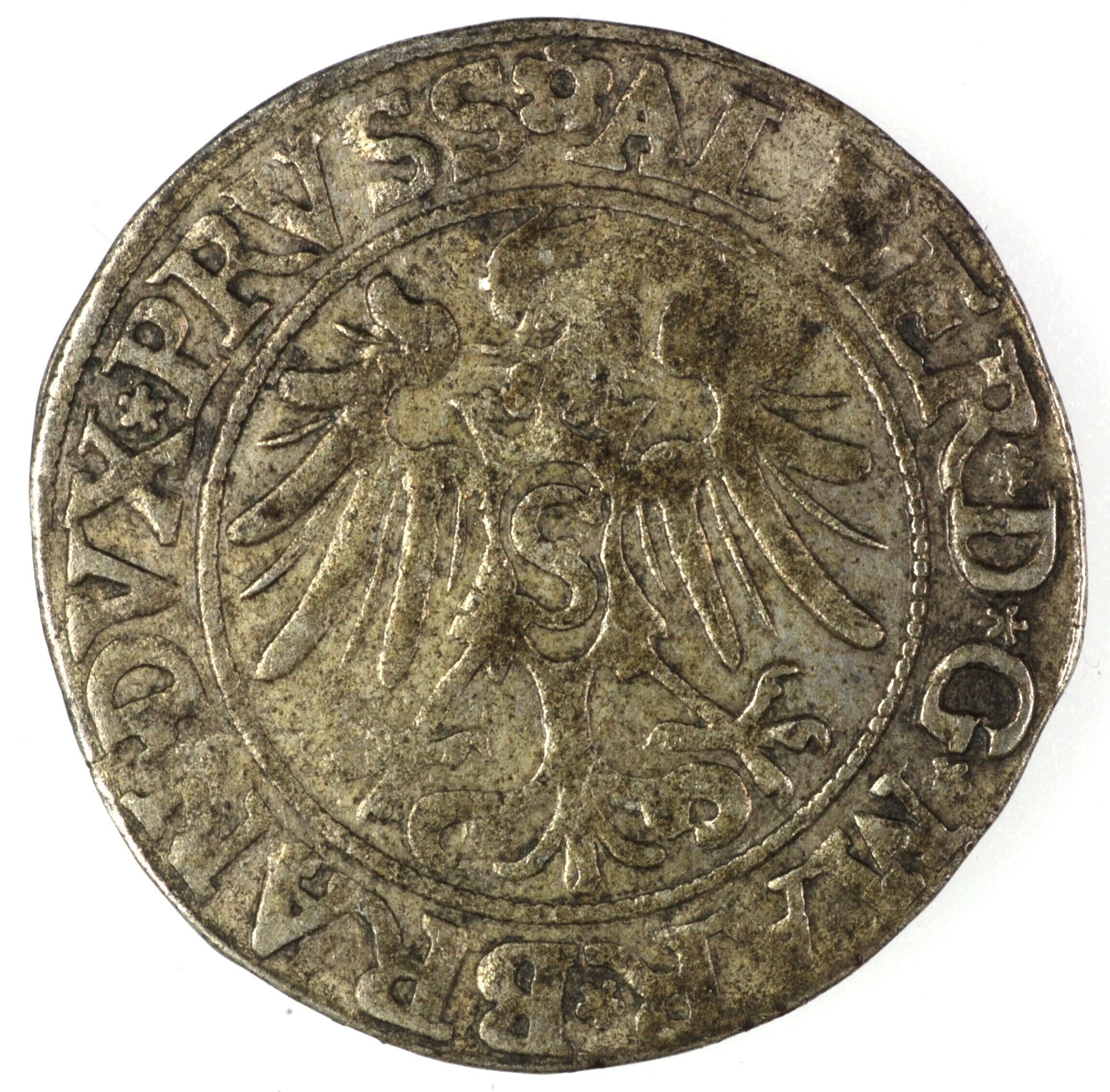 Groschen; Pruisen; Albrecht von Brandenburg (1525-1568); vz.: buste met harnas naar rechts binnen parelcirkel, met omschrift (schild)*IVSTVS*EX*FIDE*VIVIT*1535*; kz.: adelaar met gespreide vleugels naar recht met S op de borst, met omschrift (roos)*ALBER*D*G*MAR*BRAN*DVX*PRVSS; muntplaats: Köningsburg; gewicht: 1.85 gram; referentie: Neumann 45