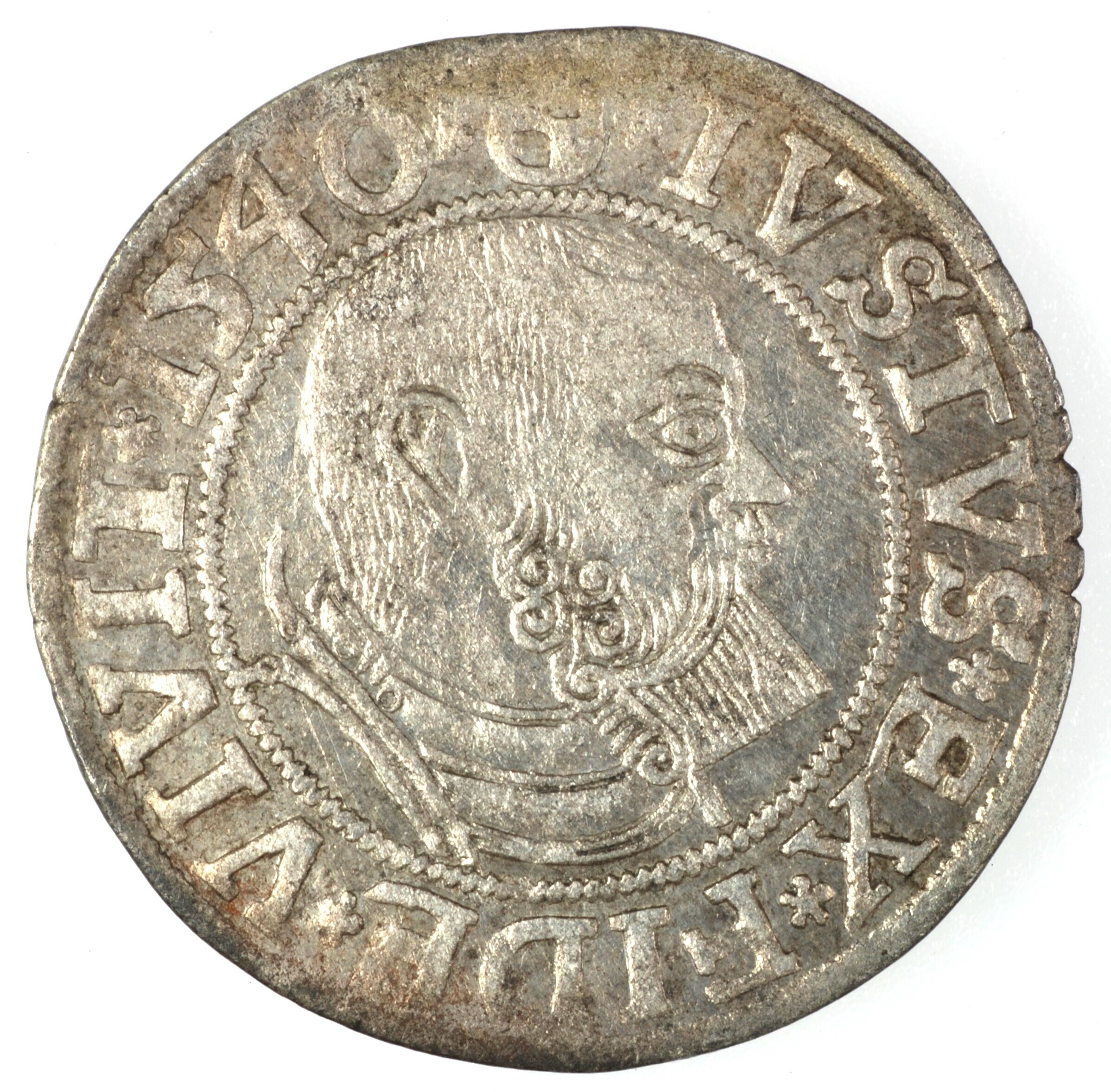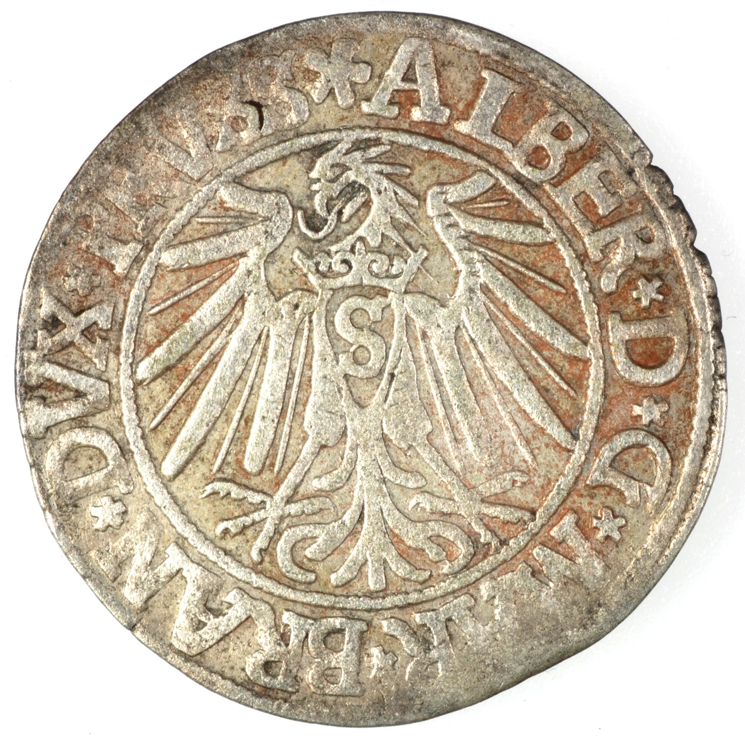 Groschen; Pruisen; Albrecht von Brandenburg (1525-1568); vz.: buste met harnas naar rechts binnen parelcirkel, met omschrift (schild)*IVSTVS*EX*FIDE*VIVIT*1540*; kz.: adelaar met gespreide vleugels naar recht met S op de borst, met omschrift (roos)*ALBER*D*G*MAR*BRAN*DVX*PRVSS*; muntplaats: Köningsburg; gewicht: 1.93 gram; referentie: Neumann 45