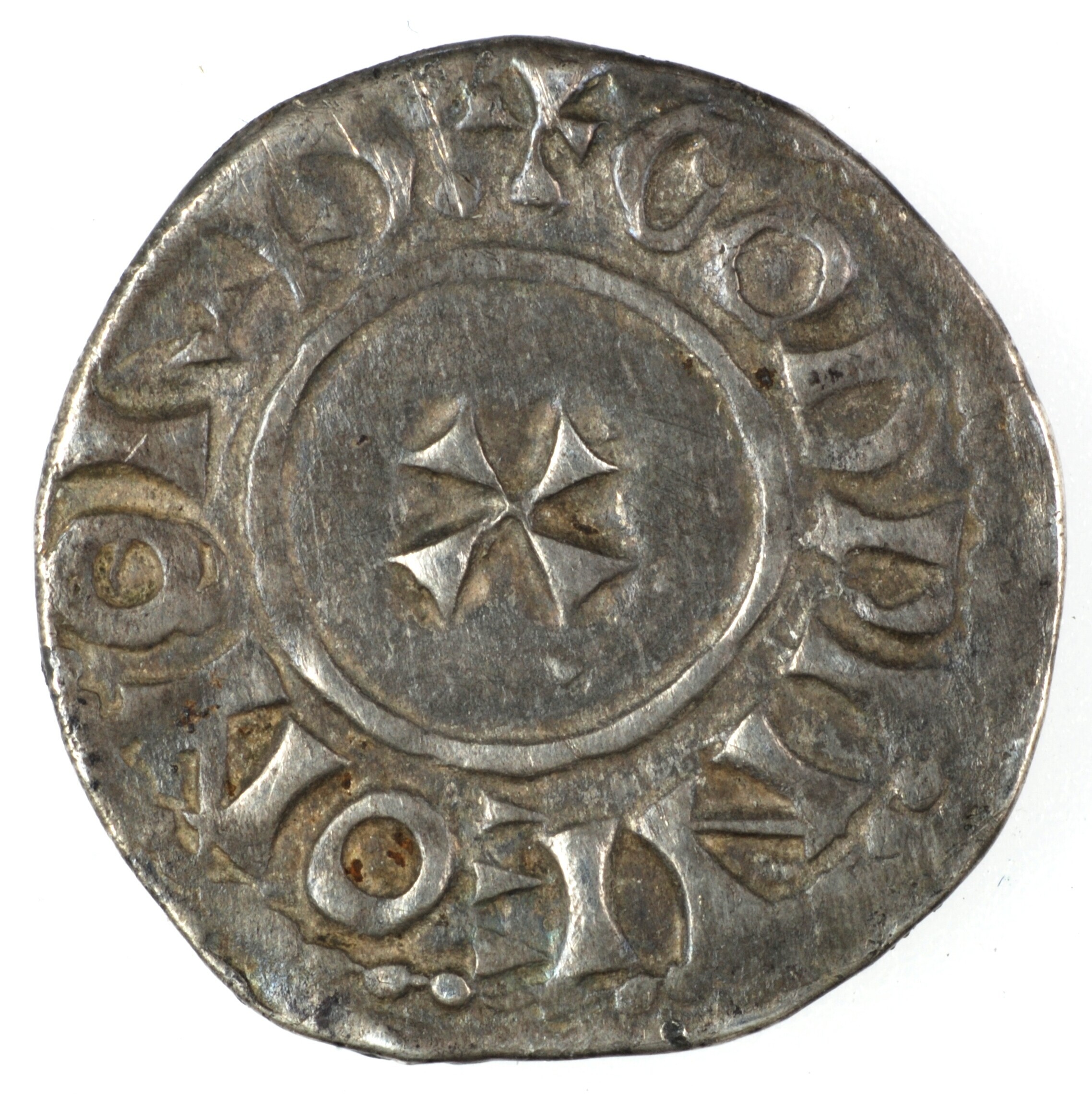 Penny; Angelsaksen; Edward the Confessor (1042-1066); vz.: aanziende buste met kroon binnen cirkel, met omschrift [EDW]ARD [REX]; kz.: klein gevorkt kruis binnen cirkel, met omschrift +GODVINEO NORD:; muntplaats: Norwich; monetarius: Godwine; gewicht: 0.94 gram; referentie: Seaby 1183