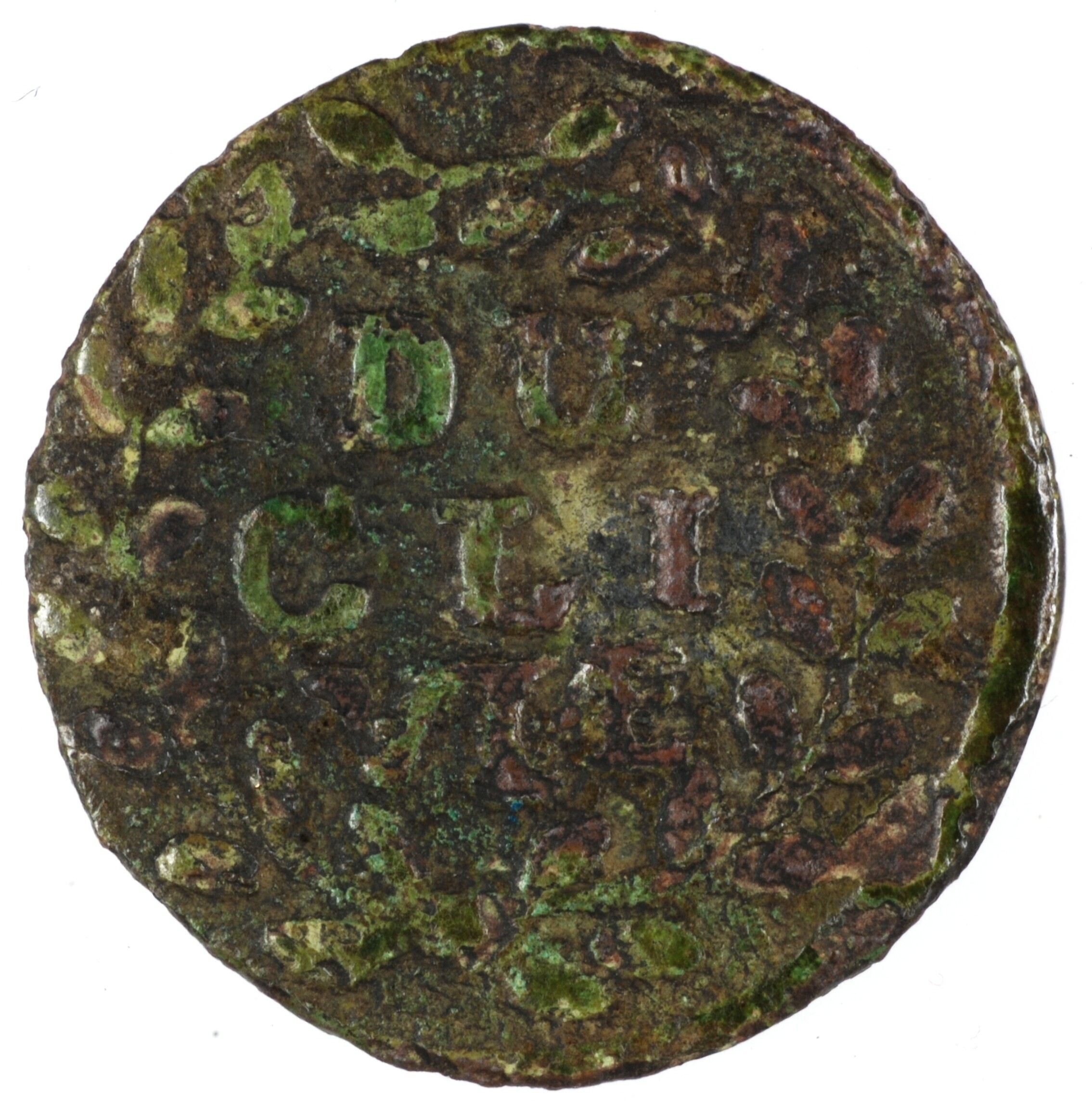 Duit; Duitsland; Kleef Hertogdom (1417-1795); Frederik Willem van Brandenburg (1640-1688); vz.: binnen een bladerkrans in drie regels: DV[.] / CLIV / IAE; kz.: een gekroonde scepter met ter weerszijden 16 – 70 binnen bladerkrans; muntplaats: Kleef; gewicht: 1.76 gram; referentie: Schön 6