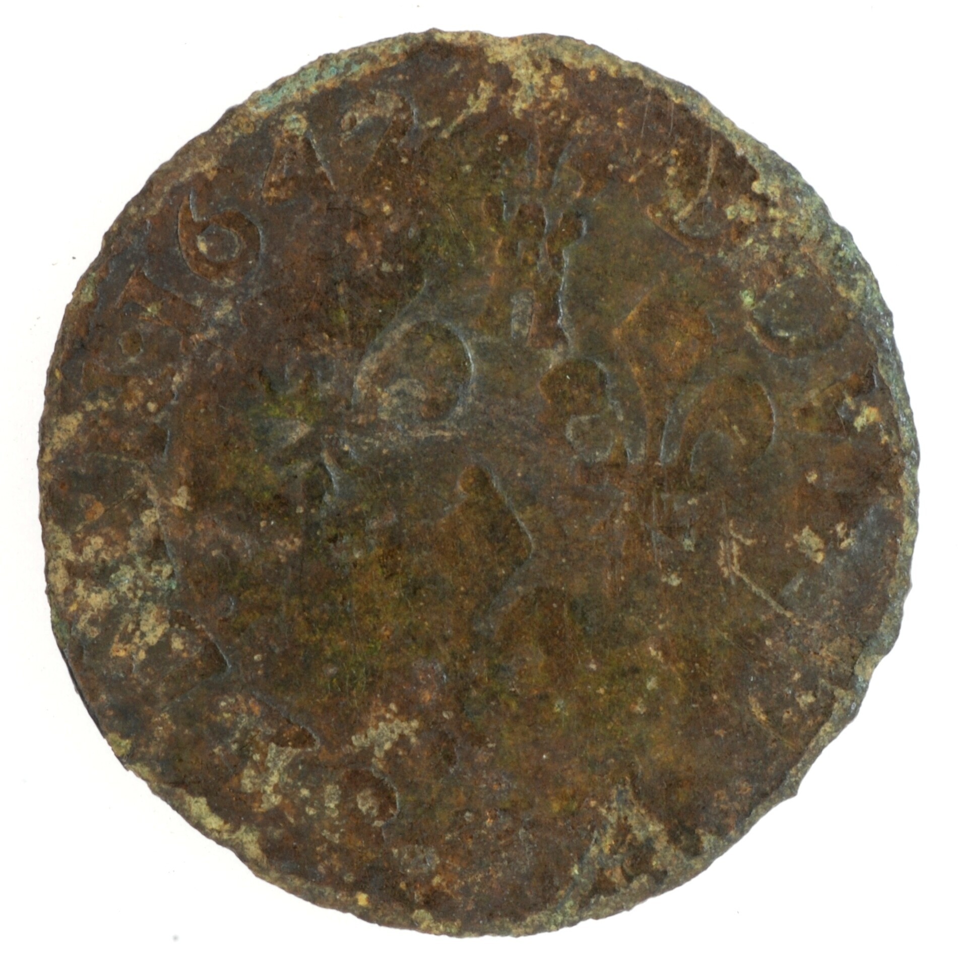 Double tournois; Frankrijk: Sedan Prinsdom; Frédéric-Maurice de la Tour (1638-1643); vz.: gedrapeerde buste naar rechts binnen cirkel, met omschrift •F•M•[D•L•TOVR•DVC•D•BVILL]ON; kz.: drie fleur de lis met erboven een burcht een lelie aan de bovenzijde, met omschrift DOV[BLE•]DE•SEDAN•1642; muntplaats: Bouillon; gewicht: 1.63 gram; referentie: Krause / Mishler 14.3