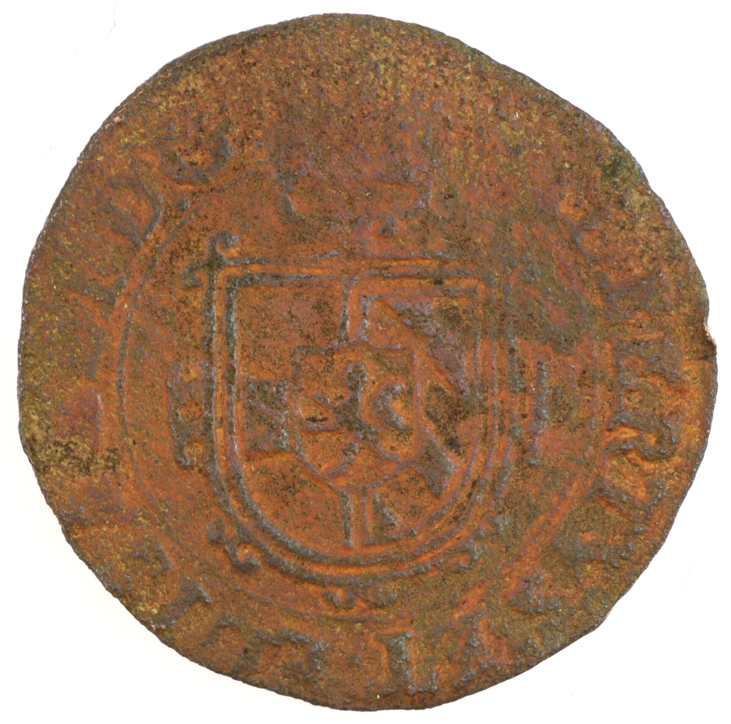 Duit; Brabant Hertogdom (1183 -1795); Albert en Isabella (1598-1621); vz. gekroond Bourgondisch wapenschild binnen een cirkel, met omschrift [(muntmeesterteken) AL]BERTVS•ET•ISASABET•D:G; kz.: schuin geplaatst stokkenkruis dat door een vuurijzer is geplaatst, waaraan de keten van de orde van het gulden vlies hangt met aan weerszijden 16 – 15, met omschrift [(muntmeesterteken) A]RCHID•AVST•DVC•BVRG•ET•B[•]; muntplaats: Antwerpen of Bois-le-Duc; ...