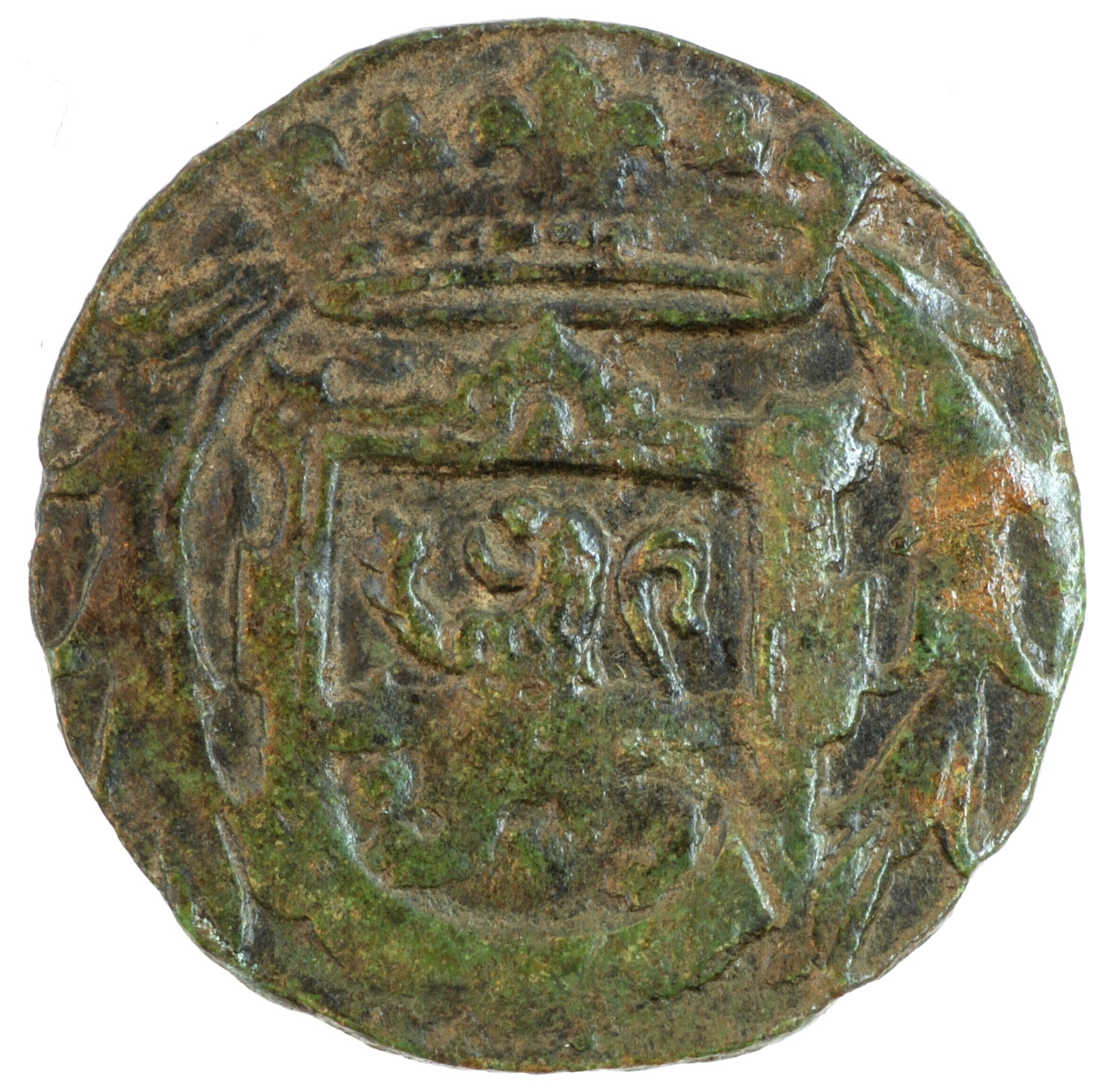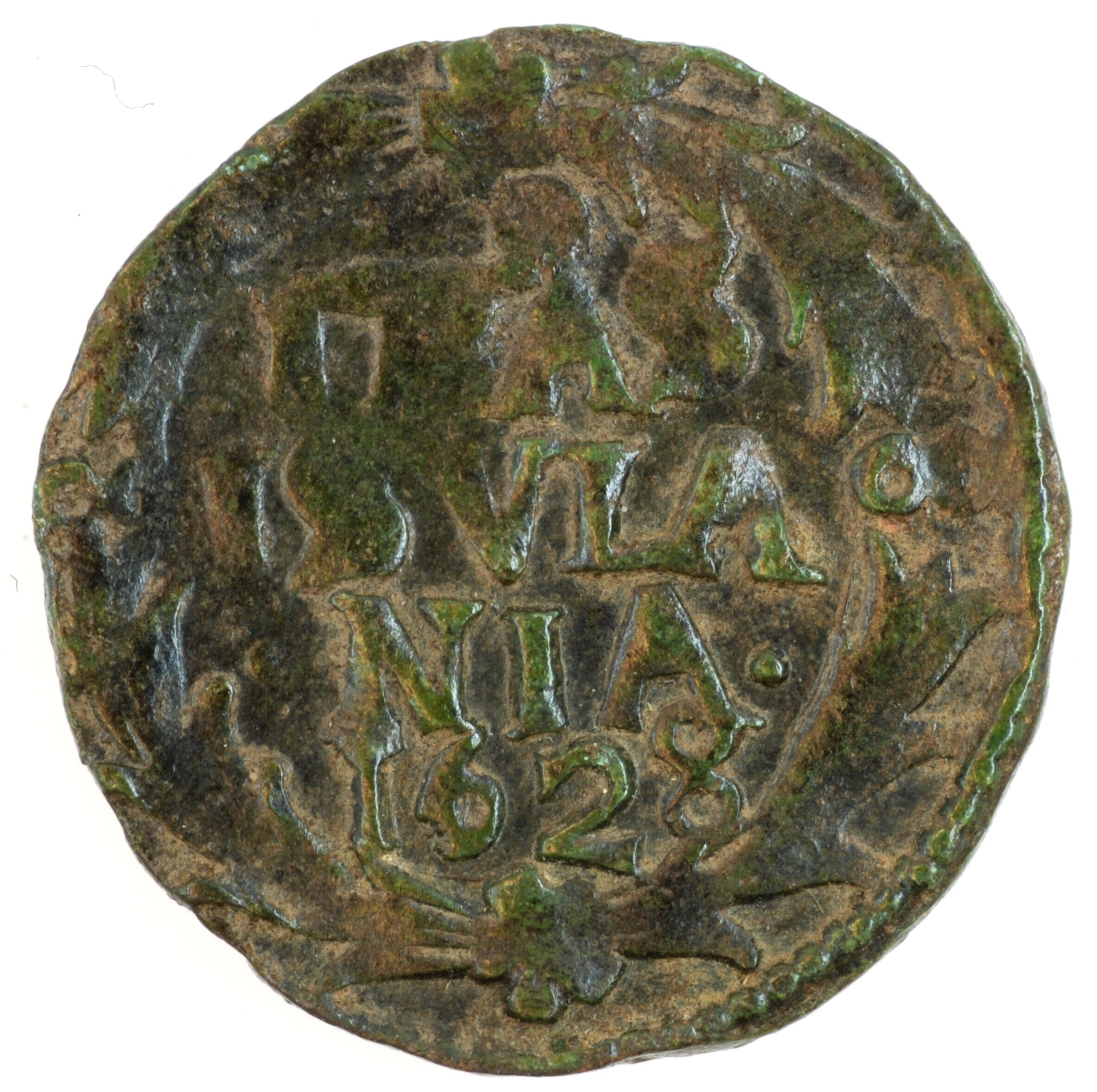 Duit; Overijssel provincie (1581-1795); vz.: binnen een bladerkrans; kz.: in vier regels: TR^AS / ISVLA / •NIA• / 1628; kz.: gekroond en versierd wapenschild van Overijssel; muntplaats: Kampen; gewicht: 1.99 gram; referentie: Purmer / Wiel 7005, CNM 2.38.111