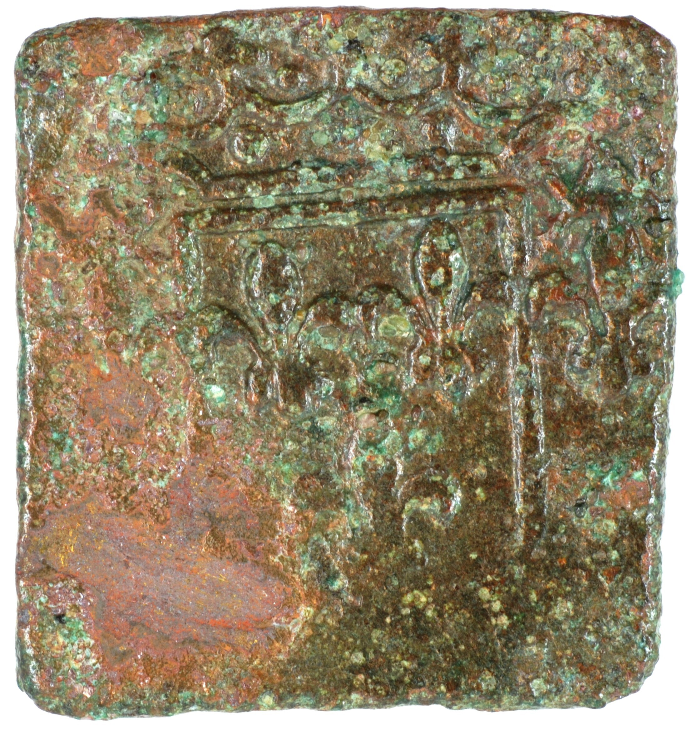 Muntgewicht; Frankrijk, Antwerpen; 1/2 Ecu; (1370-1640); vz.: wapenschild met drie fleur de lis; kz.: handje; gewicht: 1.45 gram