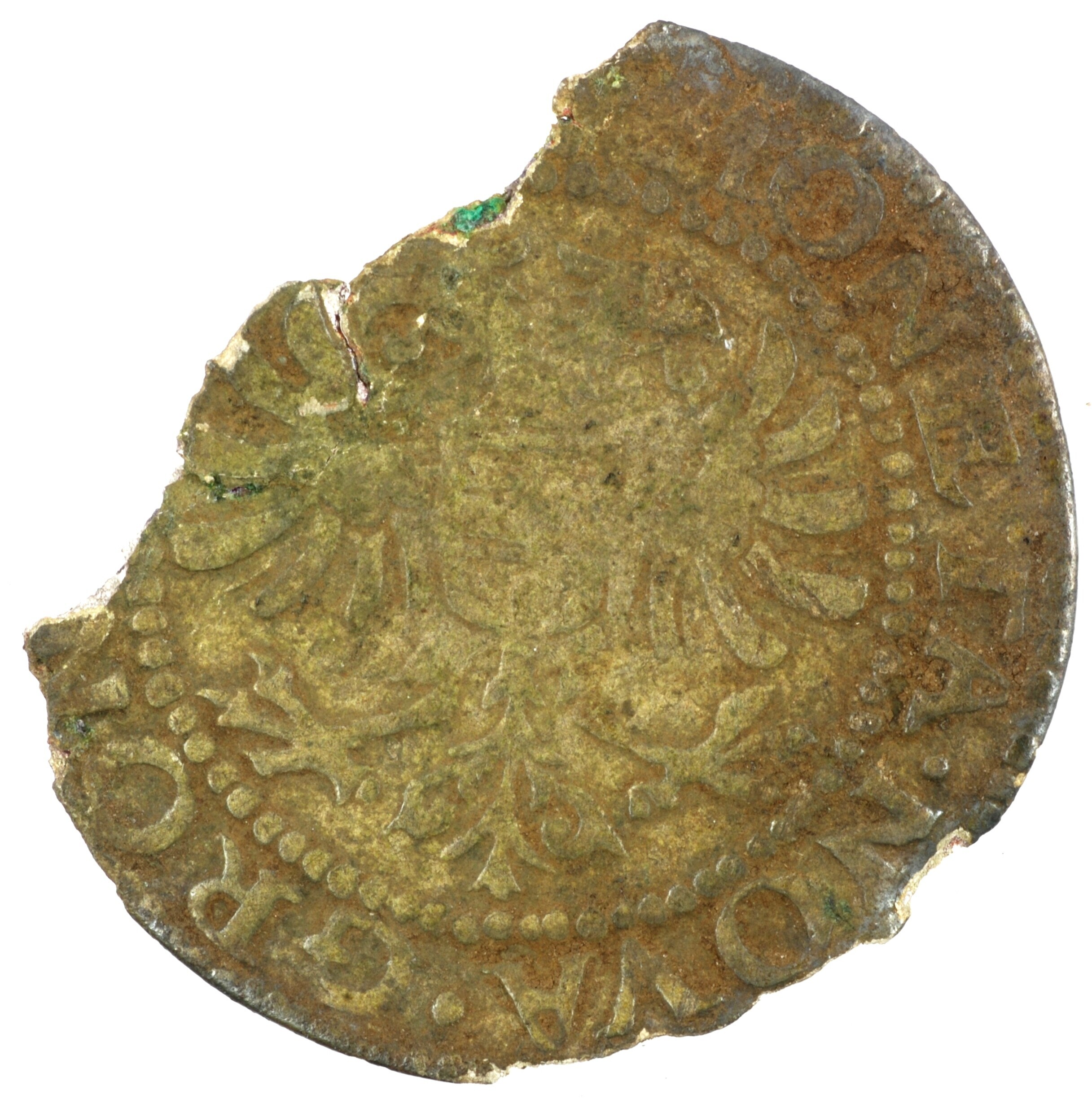 Brabantse stuiver; Groningen Provincie (1581-1795); Steden; Groningen; vz.: dubbele adelaar met dwarsbalkschild op de borst binnen parelcirkel, met omschrift [(muntmeestersteken)] MONETA•NOVA•GRON[INGENSIS]; kz.: lang gelelied kruis met dwarsbalkschild in het hart en [I] - S - B - R in de kwadranten, met omschrift [S]IT•NO. / DO.BE / NE•DIC / [1...]; muntplaats: Groningen; gewicht: 0.98 gram; ...