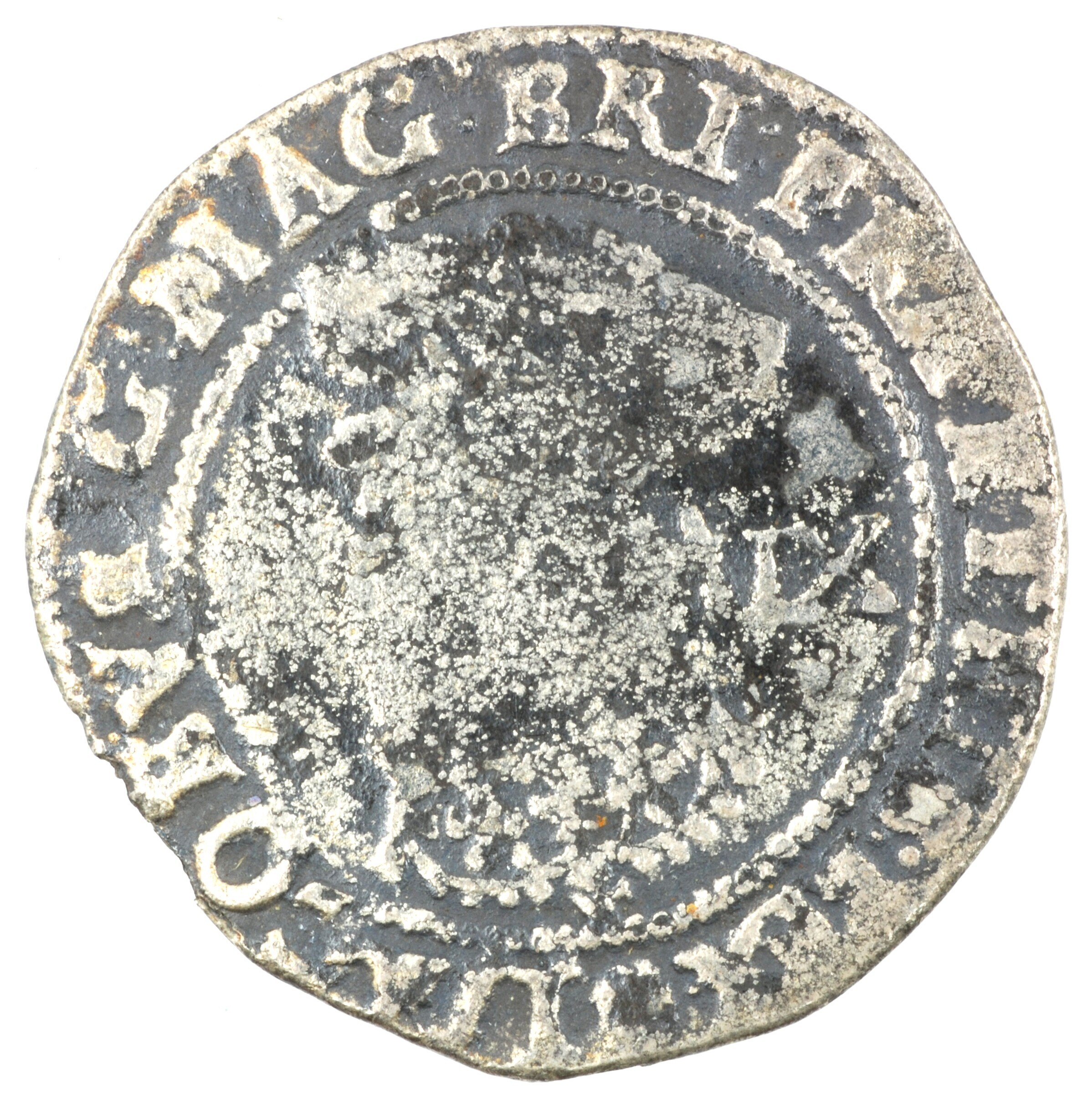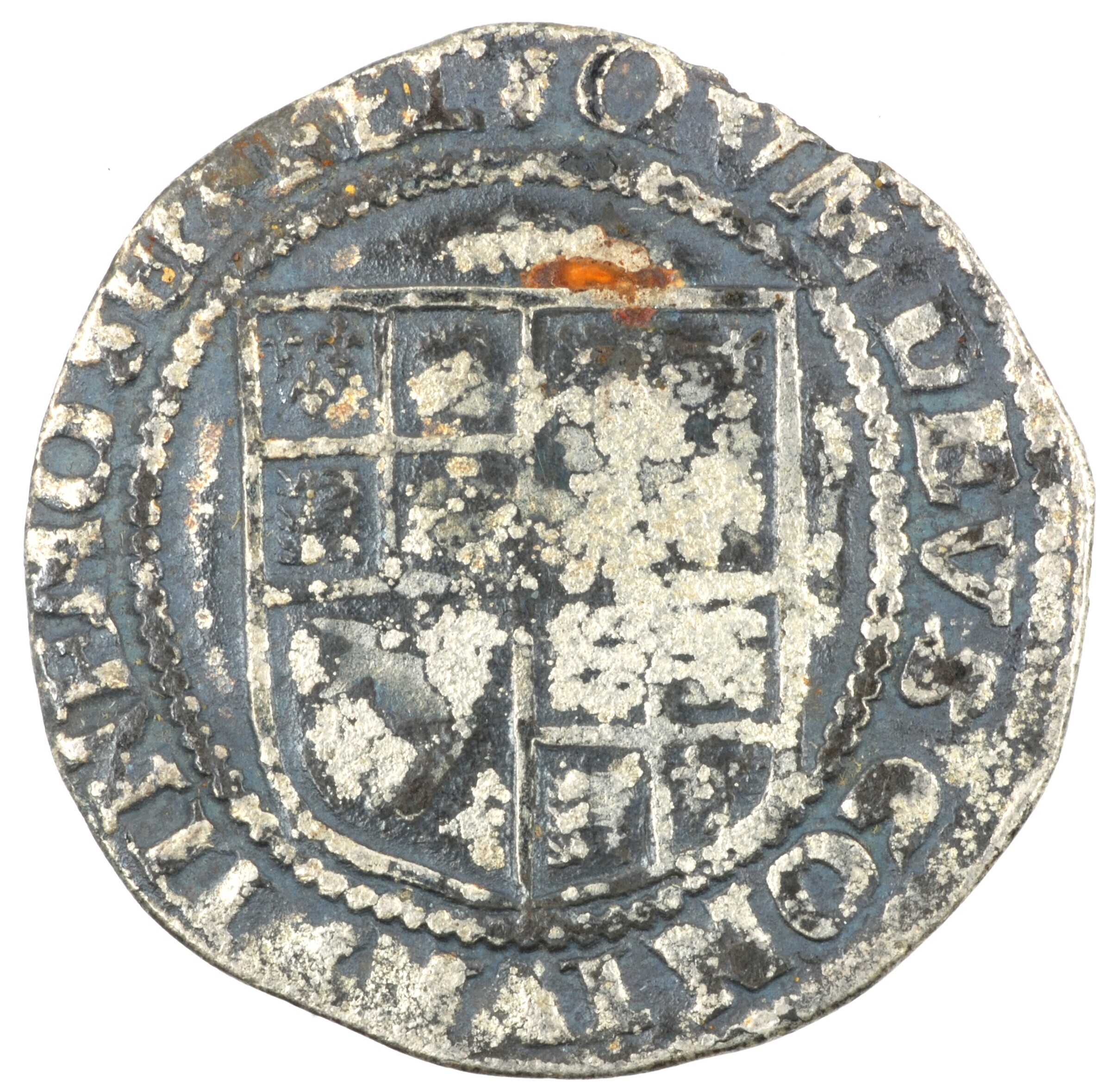 Shilling; Engeland; James I, (1603-1625); vz.: buste met harnas en kroon naar rechts met XII in veld aan linkerzijde, met omschrift (distel) IACOBVS:G:MAG:BRI:FRA ET ETS:REX; kz.: schild met wapens, met omschrift (muntmeestersteken) QVAE DEVS CONIVNXTI NEMO SEPARET; muntplaats: London; gewicht: 5.53 gram; referentie: Seaby 2669