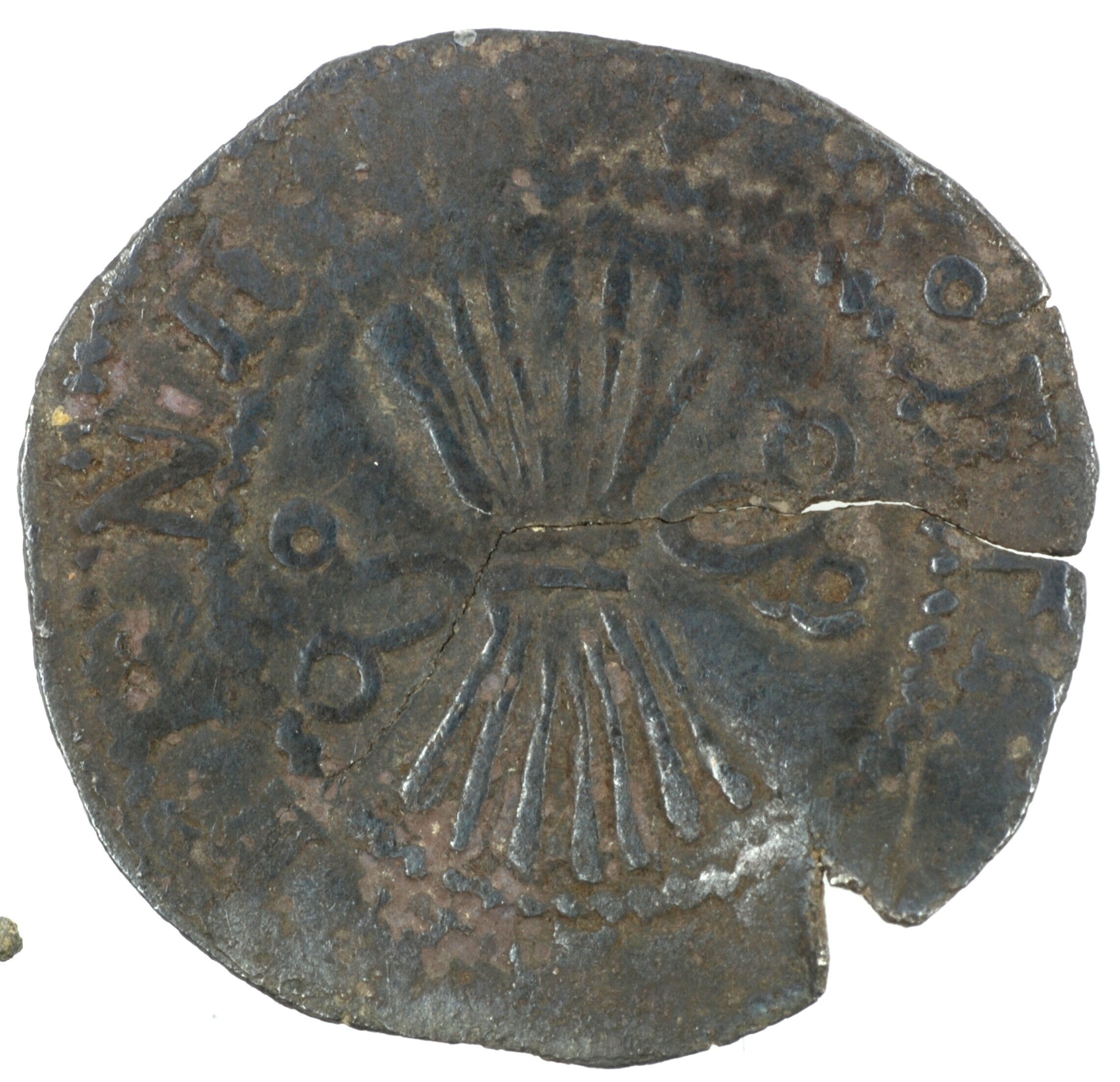 Halve reaal; Spanje; Ferdinand en Isabella (1474-1504); vz.: pijlenbundel binnen parelcirkel, met omschrift FERNANDVSoETo[…]; kz.: gekroonde initialen met omschrift REX:ET:R[EG]INA; muntplaats: Granada?; gewicht: 1.47 gram; referentie: Vicenti type 16?; vervalsing?