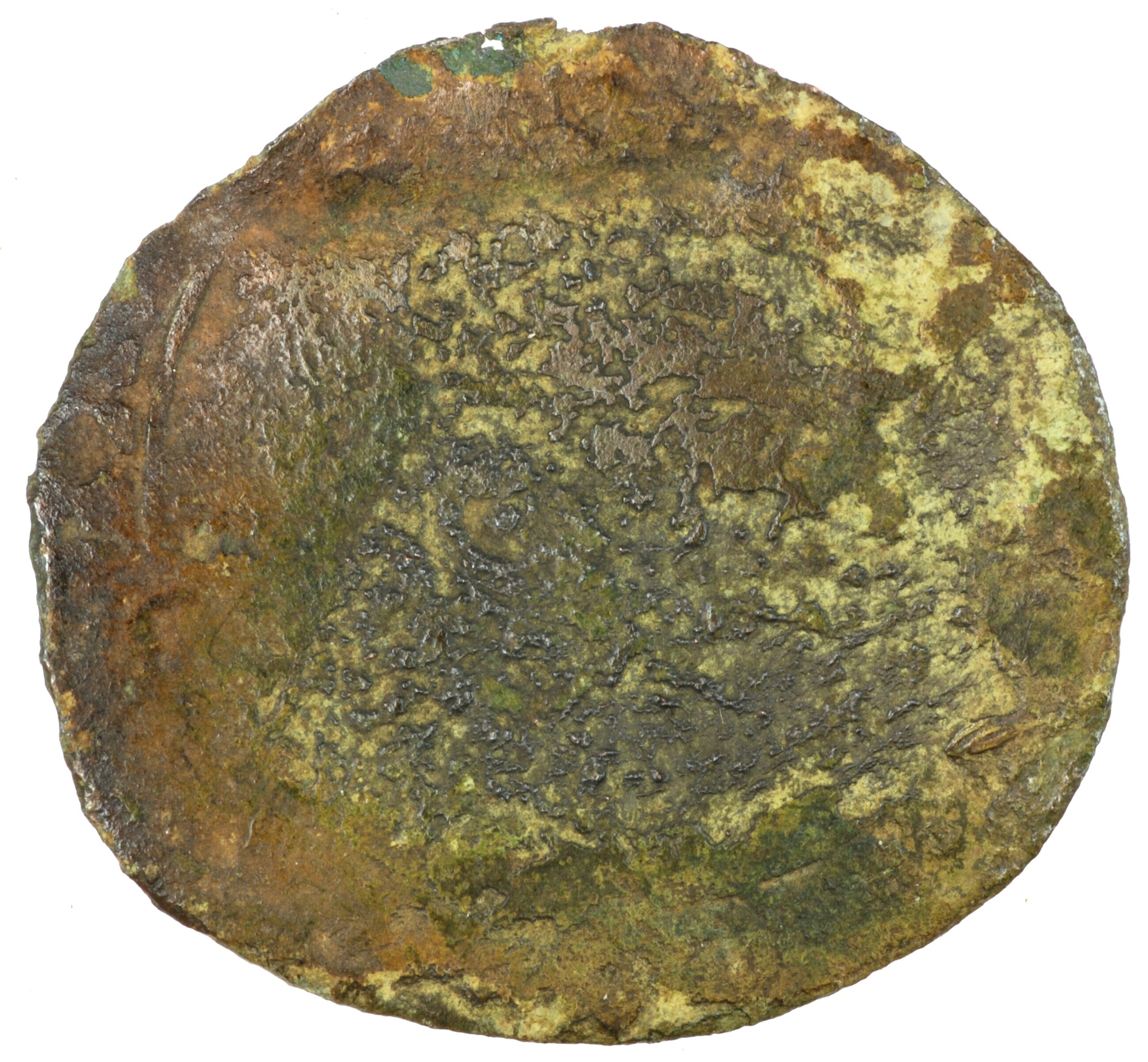 Oord; Albert & Isabella (1598-1621); vz.: gekroond vuurijzer omgeven door drie wapenschildjes binnen een parelcirkel met omschrift […]X; kz.: gekroond Spaans wapenschild met meerdere kwartieren met omschrift: .[…]; gewicht: 1.76 gram; referentie: Purmer / Wiel , CNM