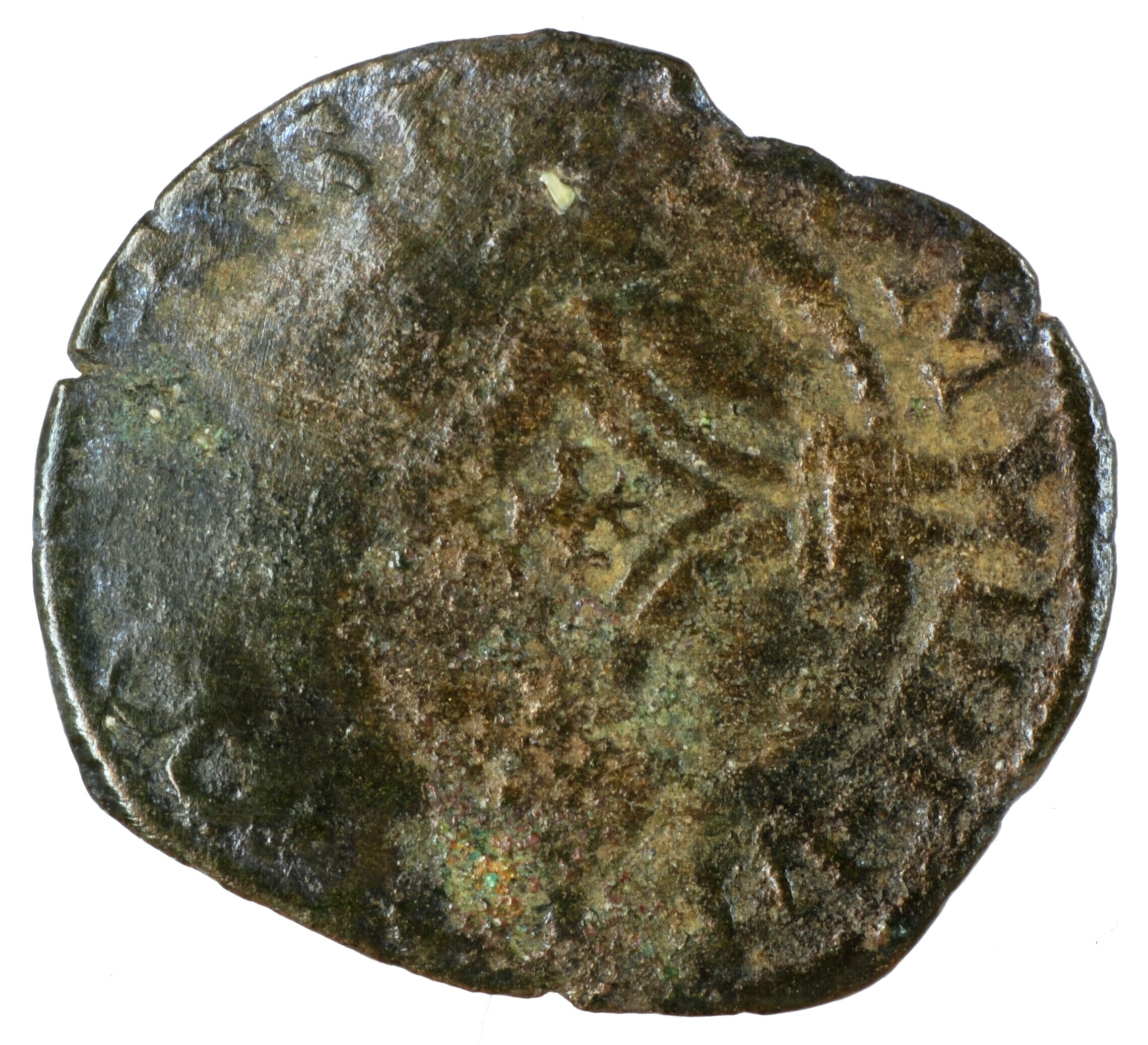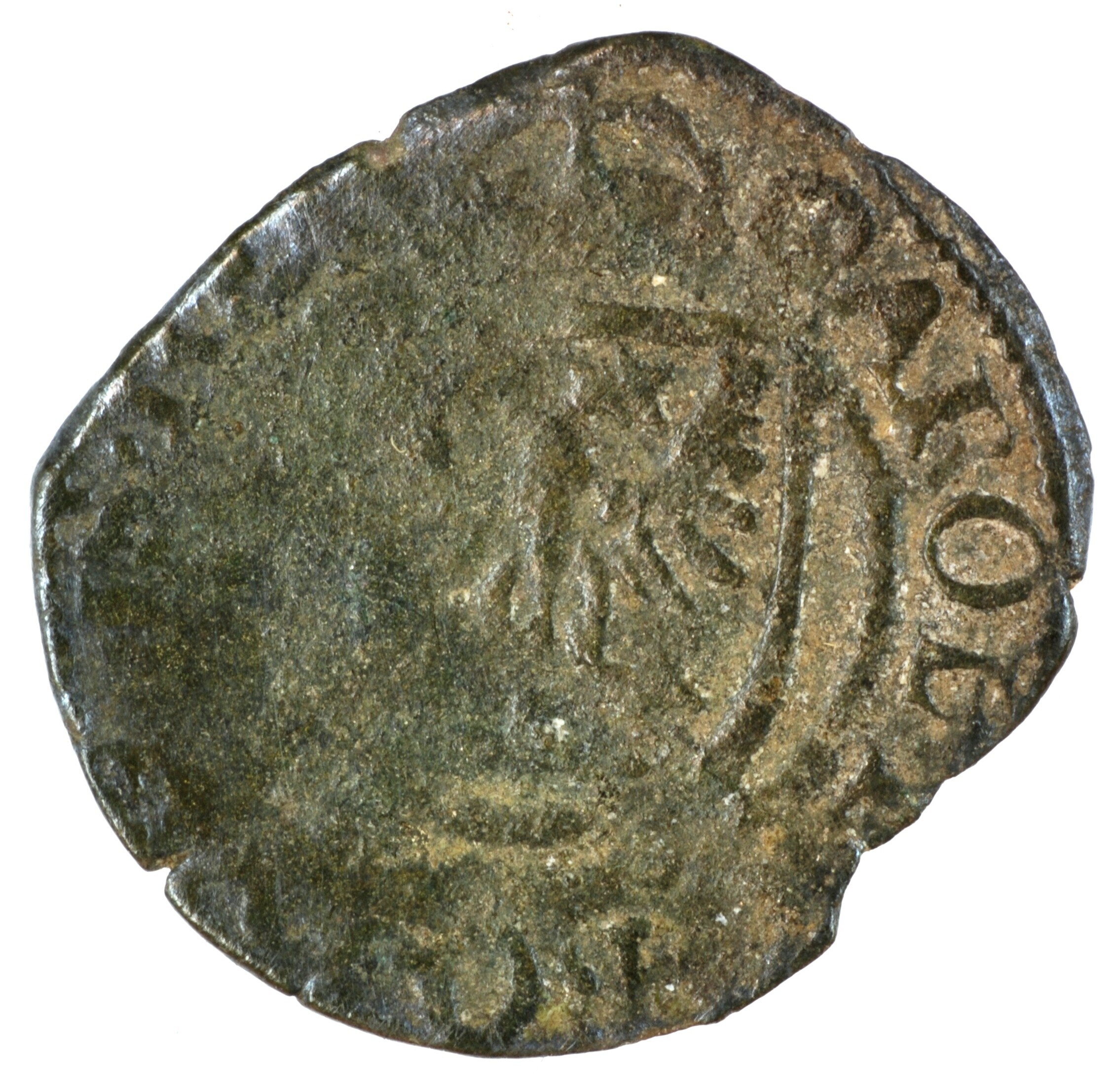 Hollandse penning; Gelre Hertogdom (1339-1581); Karel V (1506-1555); vz.: gekroond wapenschild met dubbelkoppige adelaar met omschrift CAROL[•D•G•]RO•IM•H]IS•R[EX]; kz.: dubbellijnig gevoet kruis met Gelders kruis in het hart met omschrift [D]A•M / IHI•VI / [RT]•CO / [HO]S•T; muntplaats: Nijmegen; gewicht: 0.51 gram referentie: Gelder / Hoc 195-4, vHoudt II 236.NIJ