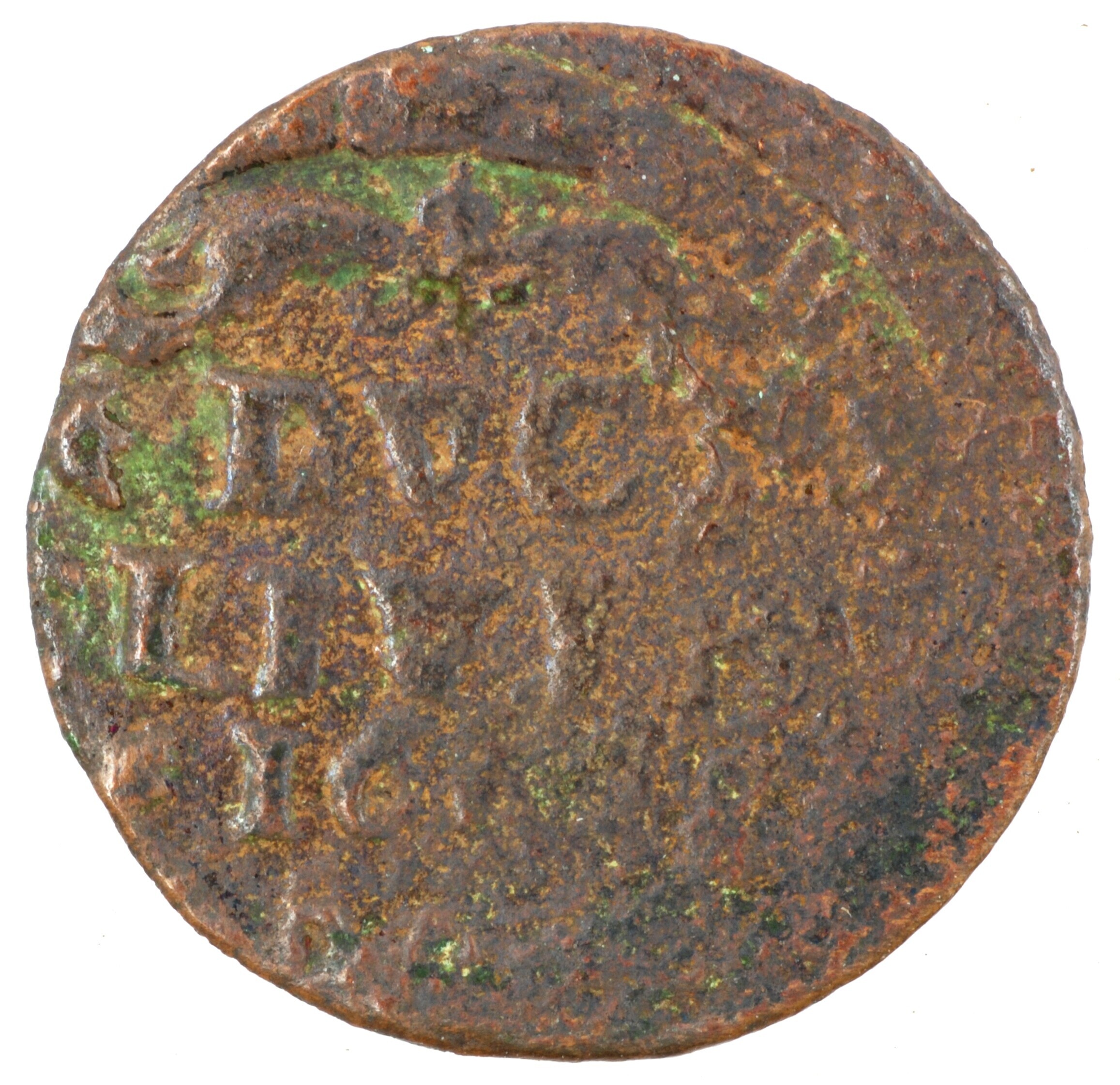 Duit; Duitsland; Kleef Hertogdom (1417-1795); Frederik III van Brandenburg (1688-1701); vz.: gekroond wapen van Kleef, vastgehouden door 2 leeuwen met onder het wapen een versiering; kz.: met aan boven- en onderzijde versiering, in drie regels: DVC / [C]LIVI[AE] / 169[.]; muntplaats: Emmerich; gewicht: 1.44 gram; referentie:Krause / Mishler 37