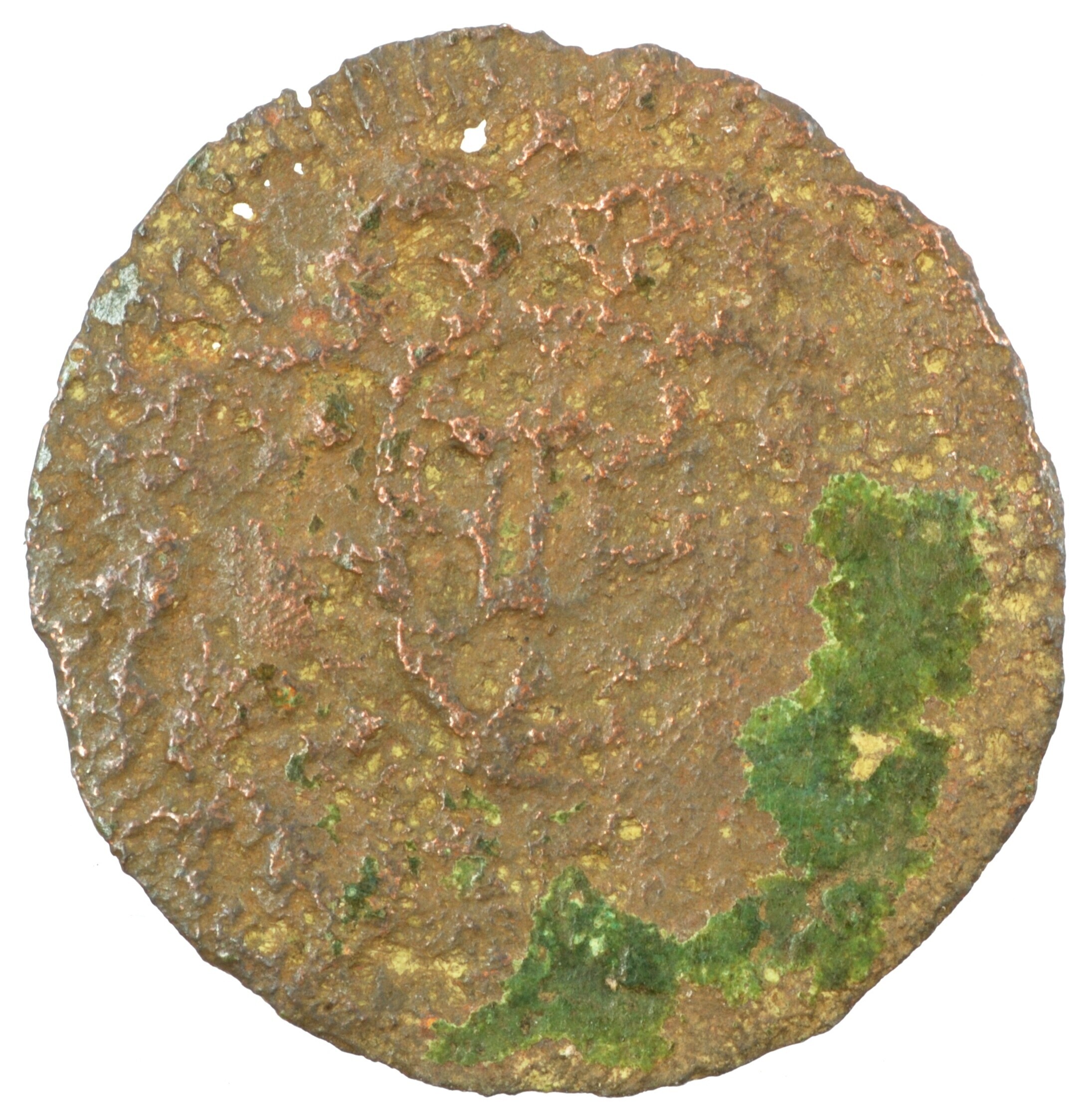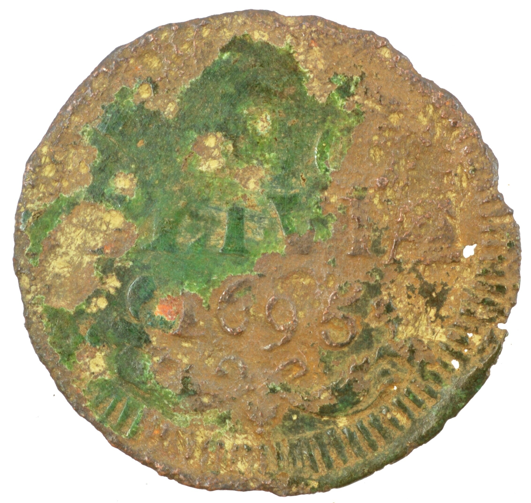 Duit; Duitsland; Kleef Hertogdom (1417-1795); Frederik III van Brandenburg (1688-1701); vz.: gekroond wapen van Kleef, vastgehouden door 2 leeuwen met onder het wapen een versiering; kz.: met aan boven- en onderzijde versiering, in drie regels: [D]VC: / CLIVIAE / 1696/5; muntplaats: Emmerich; gewicht: 0.83 gram; referentie: Krause / Mishler 37