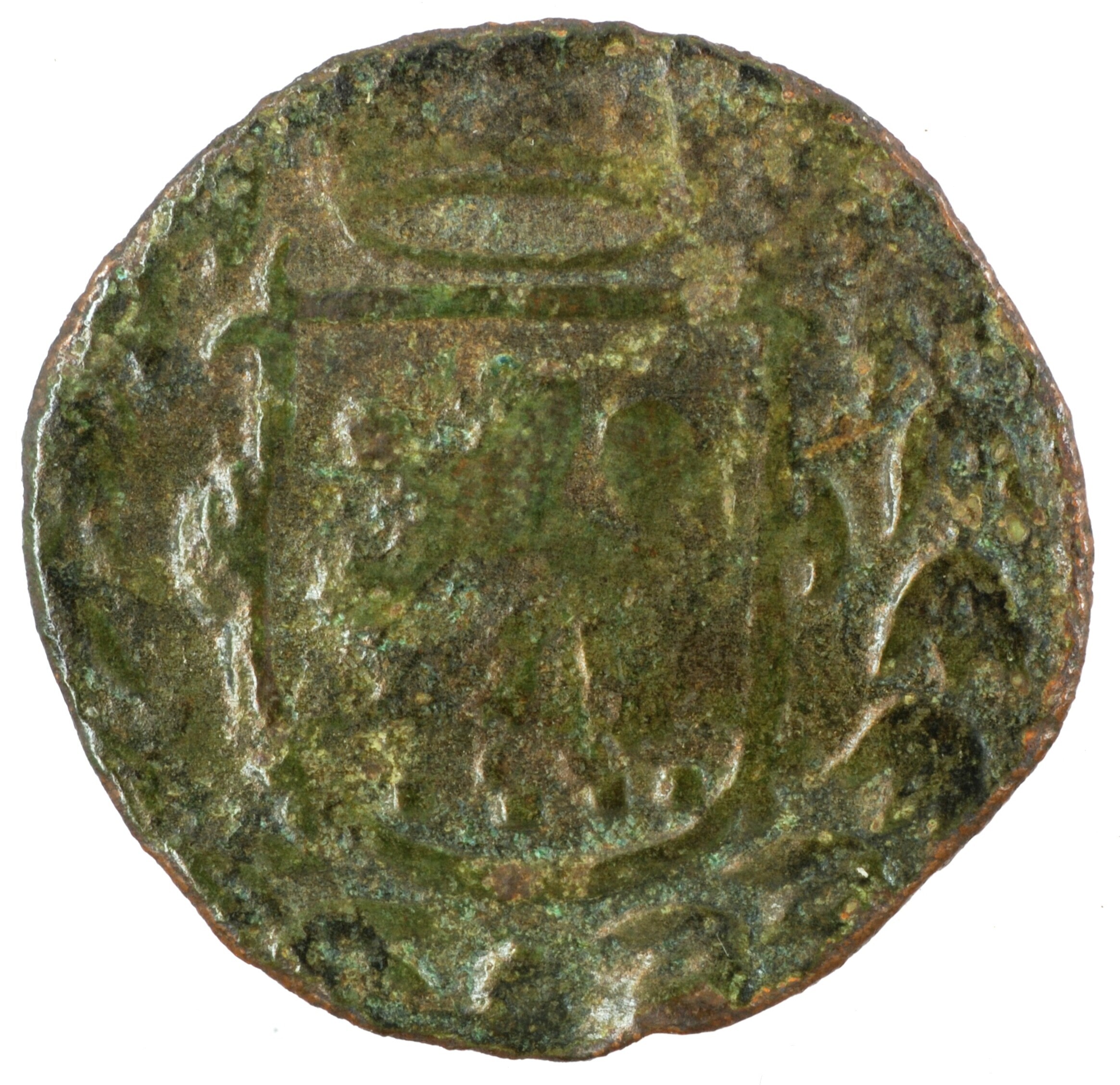 Duit; Abdij Thorn; Anna van der Marck (1604-1631); vz.: gekroond wapenschild van Mark binnen bladerkrans, binnen een parelcirkel in vier regels: [•I]N• / TH[O]RE / •CVS• / •; muntplaats: Thorn; gewicht: 1.57 gram; zeer zeldzaam; referentie: Purmer / Wiel 9602