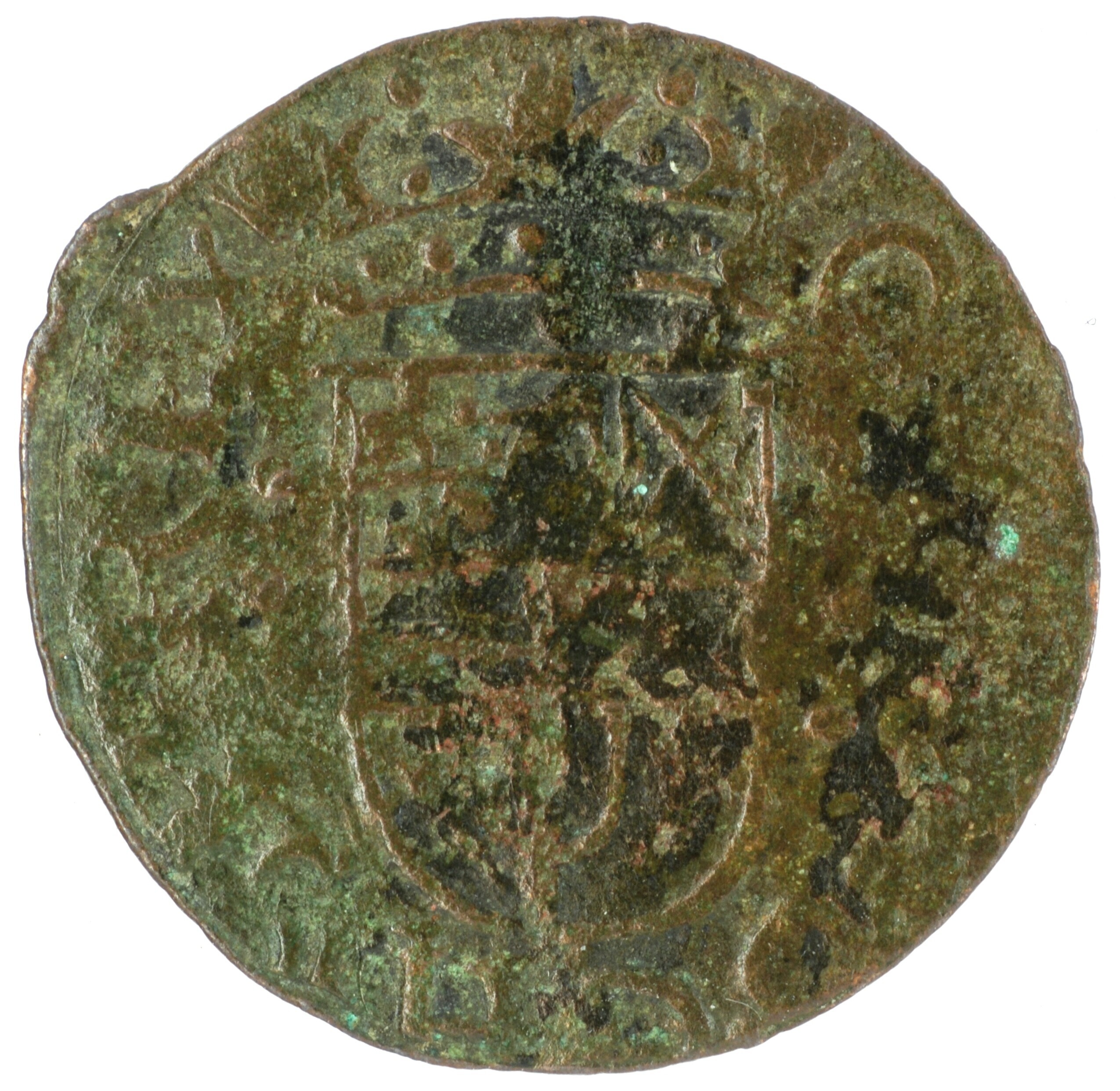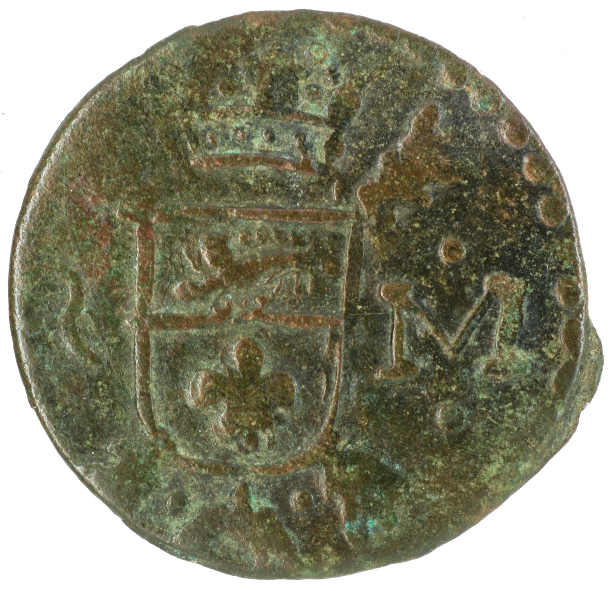 Duit; Gelderland Provincie (1581-1795); Steden, Roermond; Karel II (1665-1700); vz.: gekroond wapenschild van de koning, met omschrift C[AR II] D G HISP REX; kz.: gekroond wapenschild van Roermond, rustend op Bourgondisch kruis met ter weerszijden R – M met punten boven en onder de letters; muntplaats: Roermond; gewicht: 1.08 gram; referentie: Purmer / Wiel 9407, ...