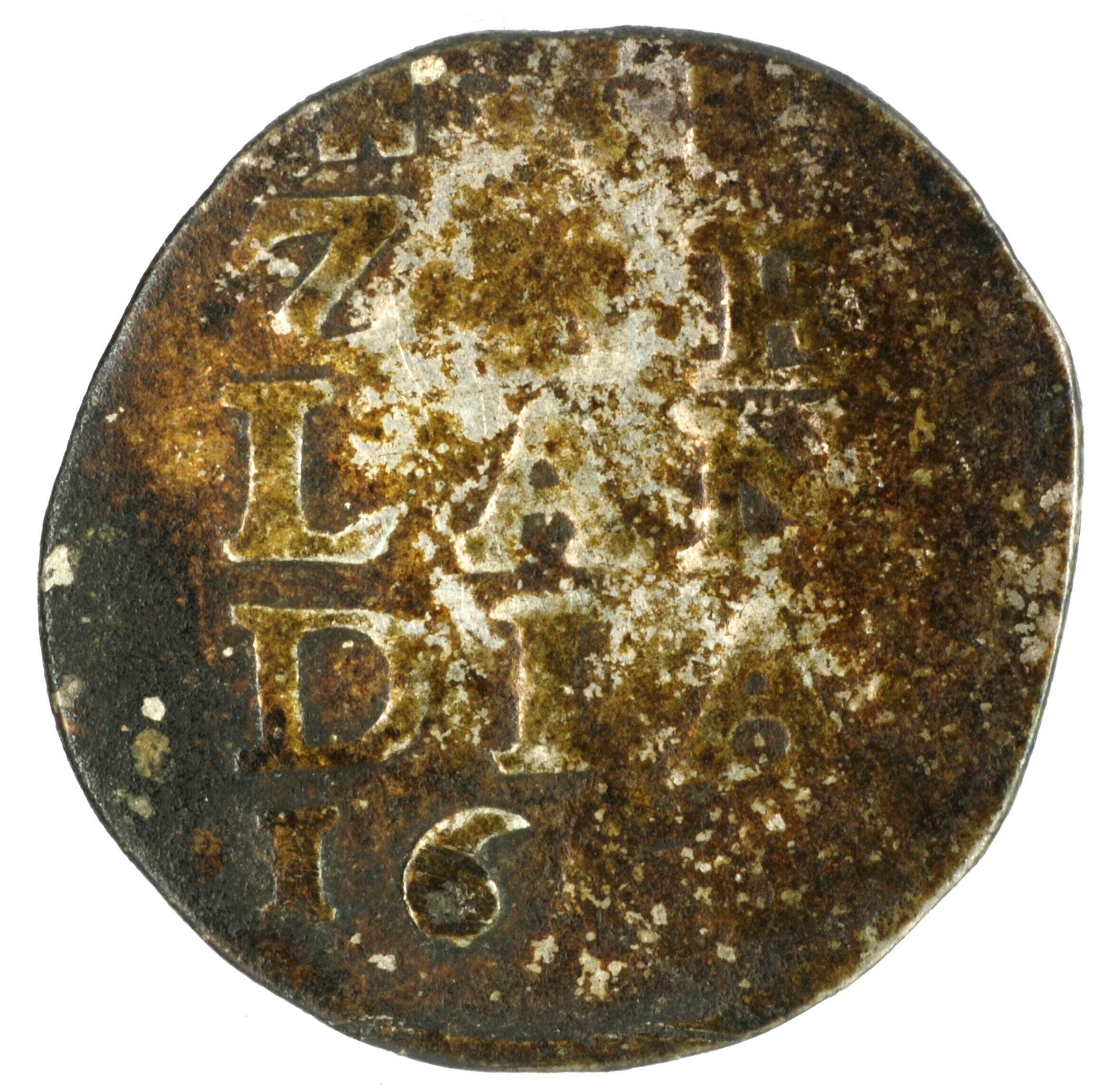Dubbele stuiver; Zeeland Provincie (1581-1795); vz.: in vier regels: rozet (burcht) rozet / ZEE / LAN / DIA / 165[3]; naar links klimmende generaliteitsleeuw met 2 – S ter weerszijden; muntplaats: Middelburg; gewicht: 1.49 gram; referentie: CNM 2.49.94