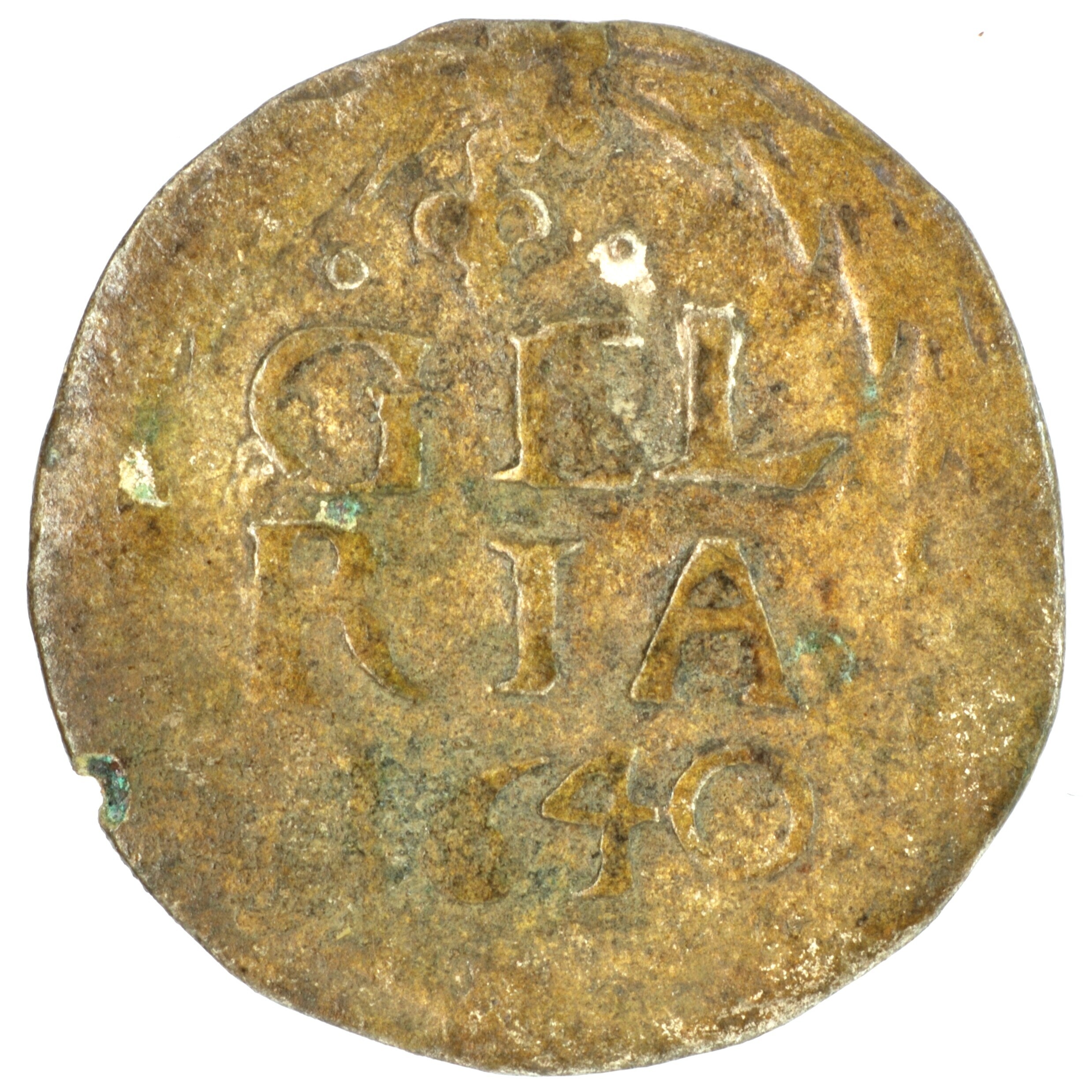 Bezemstuiver; Gelderland Provincie (1581-1795); vz.: binnen een bladerkrans in vier regels: • (lelie) • / GEL / RIA / 1640; kz.: bundel van zeven pijlen met ter weerszijden 1 – S binnen een bladerkrans; muntplaats: Harderwijk; gewicht: 0.95 gram; referentie: CNM 2.17.178