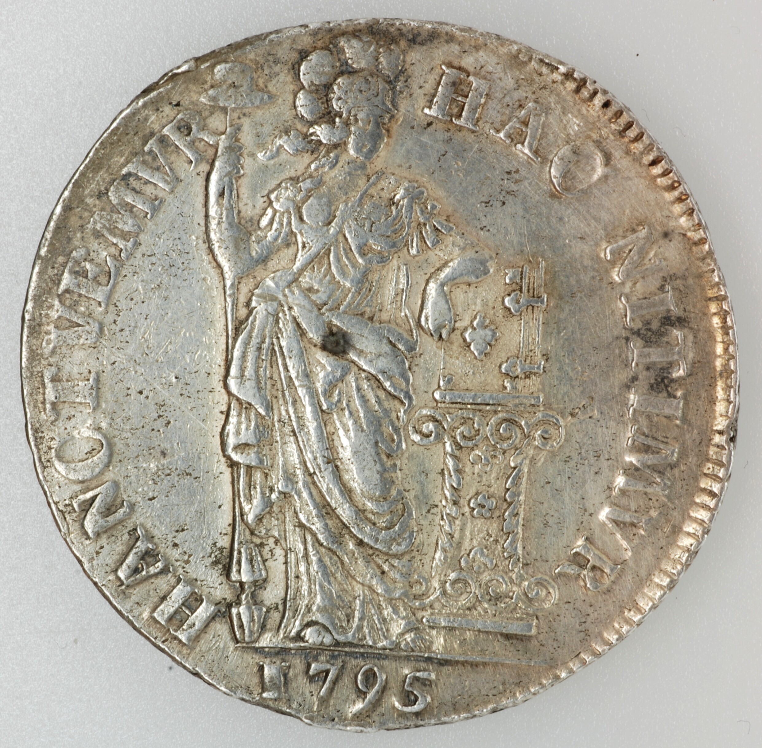 Drie gulden; Holland Provincie (1581-1795); vz.: gekroond generaliteitswapen met 3 – G aan weerszijden, met omschrift MO:ARG:ORD:FAED:BELG:HOLL•; kz.: Nederlandse maagd, in de rechterhand een speer waarop een vrijheidshoed, met de linkerelleboog steunend op een rechtop op een zuil staande bijbel met in afsnede 1795, met omschrift HAC NITIMVR – HANC TVERMVR; muntplaats: Dordrecht; gewicht: 31.14 ...