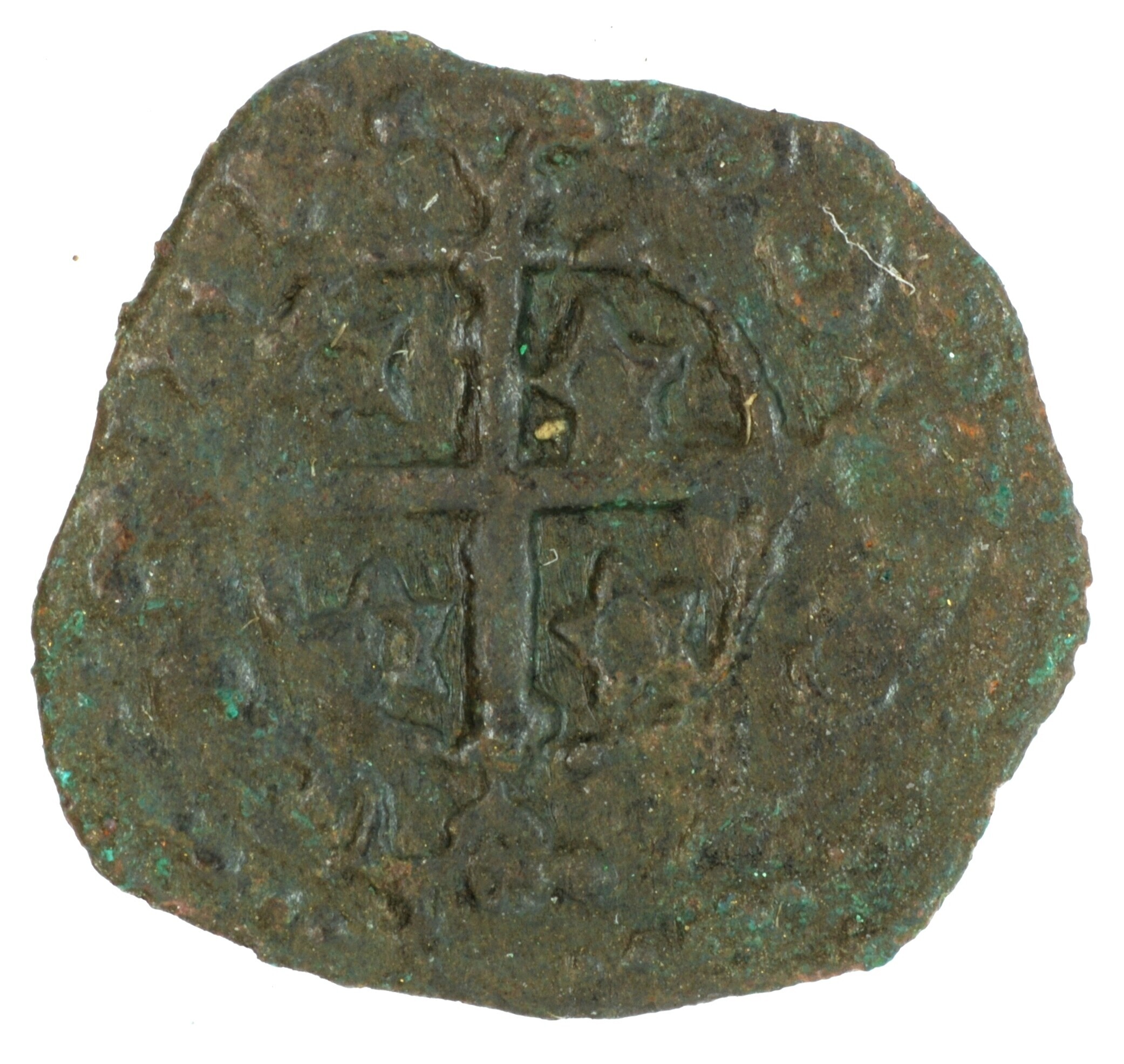 Farthing, type II; Schotland; James III (1460-1488); vz.: drie lelies binnen driepas en parelcirkel; kz.: lang kruis met gebloemd uiteinde met ruitersporen in de kwadranten binnen parelcirkel, met omschrift MO / PA / VP / ER; muntplaats: Edinburgh; gewicht: 0.47 gram; referentie: Seaby / Purvey 5314