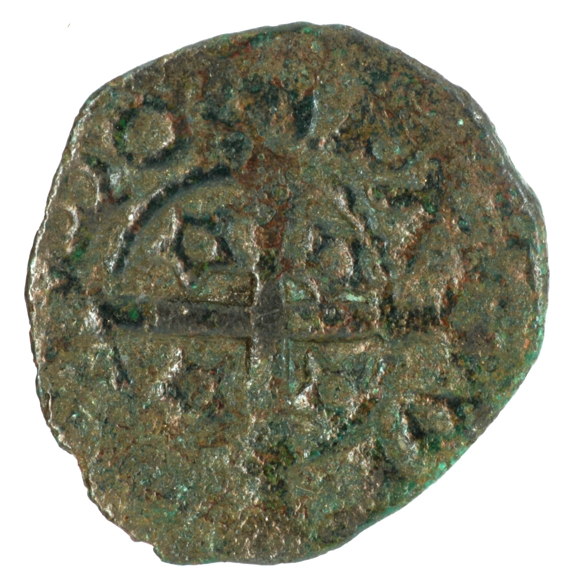 Farthing, type II; Schotland; James III (1460-1488); vz.: drie lelies binnen driepas en parelcirkel; kz.: lang kruis met gebloemd uiteinde met ruitersporen in de kwadranten binnen parelcirkel, met omschrift MO / PA / V[P / ER]; muntplaats: Edinburgh; gewicht: 0.38 gram; referentie: Seaby / Purvey 5314