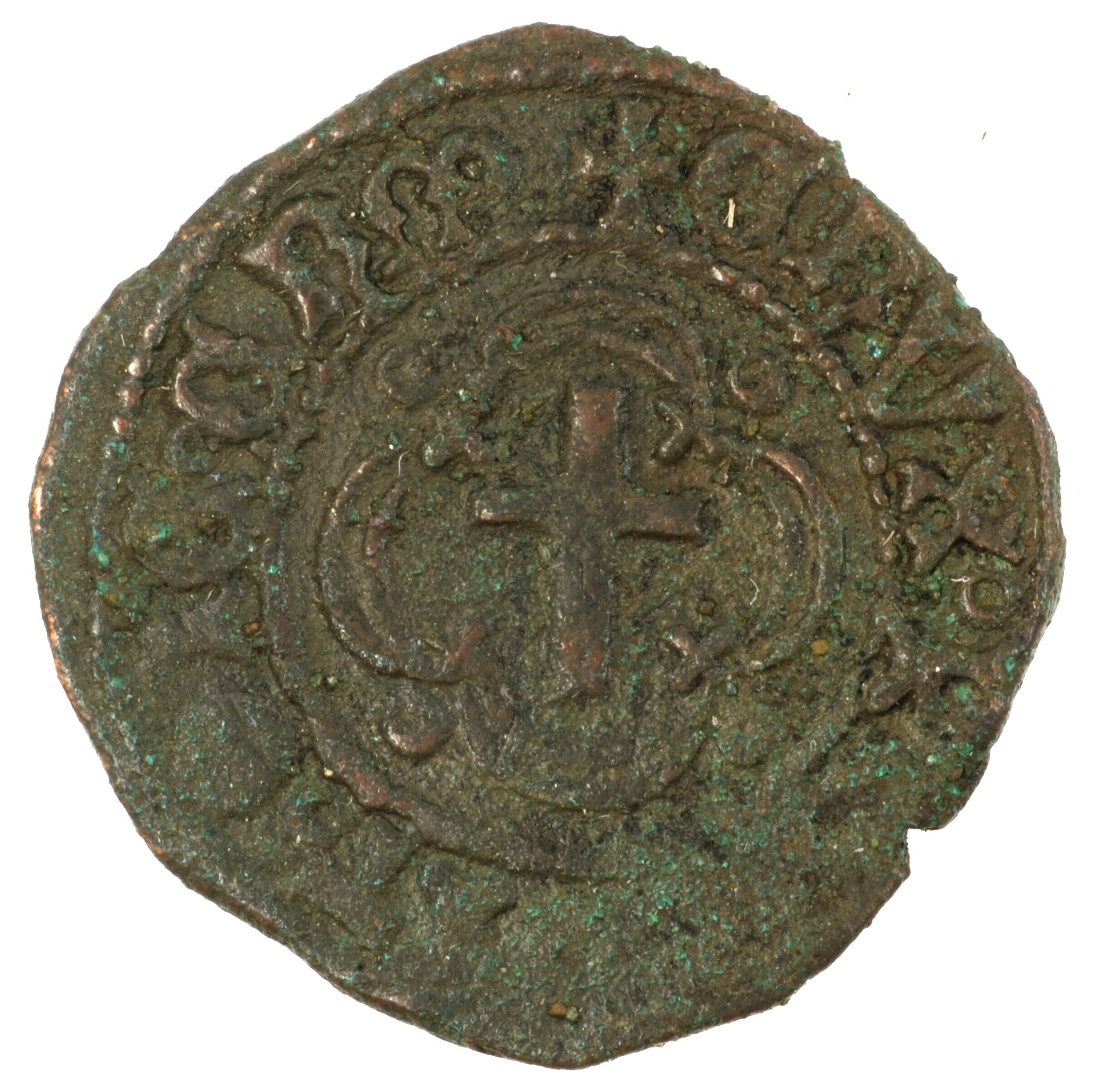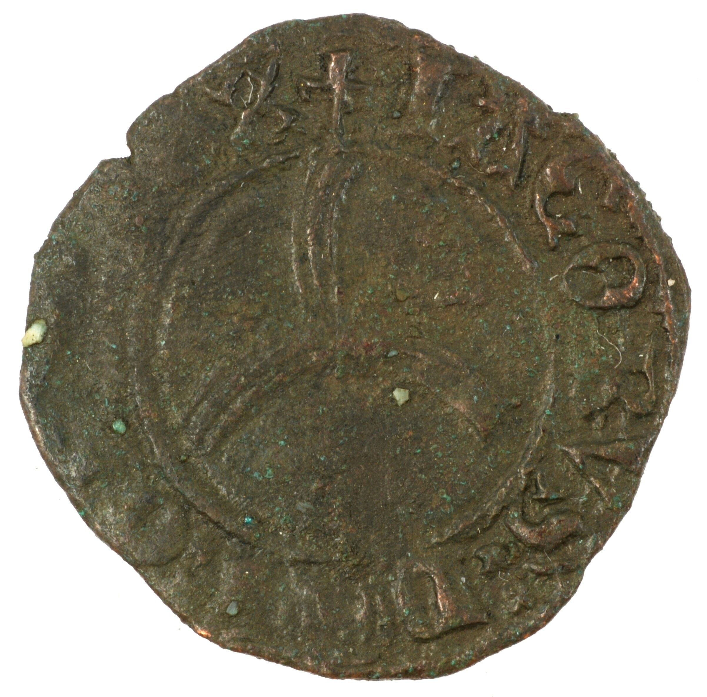 Penny, type I; Schotland; James III (1460-1488); vz.: rijksappel naar beneden gedraaid binnen parelcirkel, met omschrift +IACOBVS×DEI×G[RA×R]EX; kz.: Latijns kruis binnen vierpas en parelcirkel, met omschrift +CRVXoP[ELL]IToOIEoCRIM; muntplaats: Edinburgh; gewicht: 2.17 gram; zeldzaam; referentie: Seaby / Purvey 5307 var (interpunctie voorzijde twee kruizen boven elkaar, voorzijde interpunctie rondje en CRM in plaats an CRIM)
