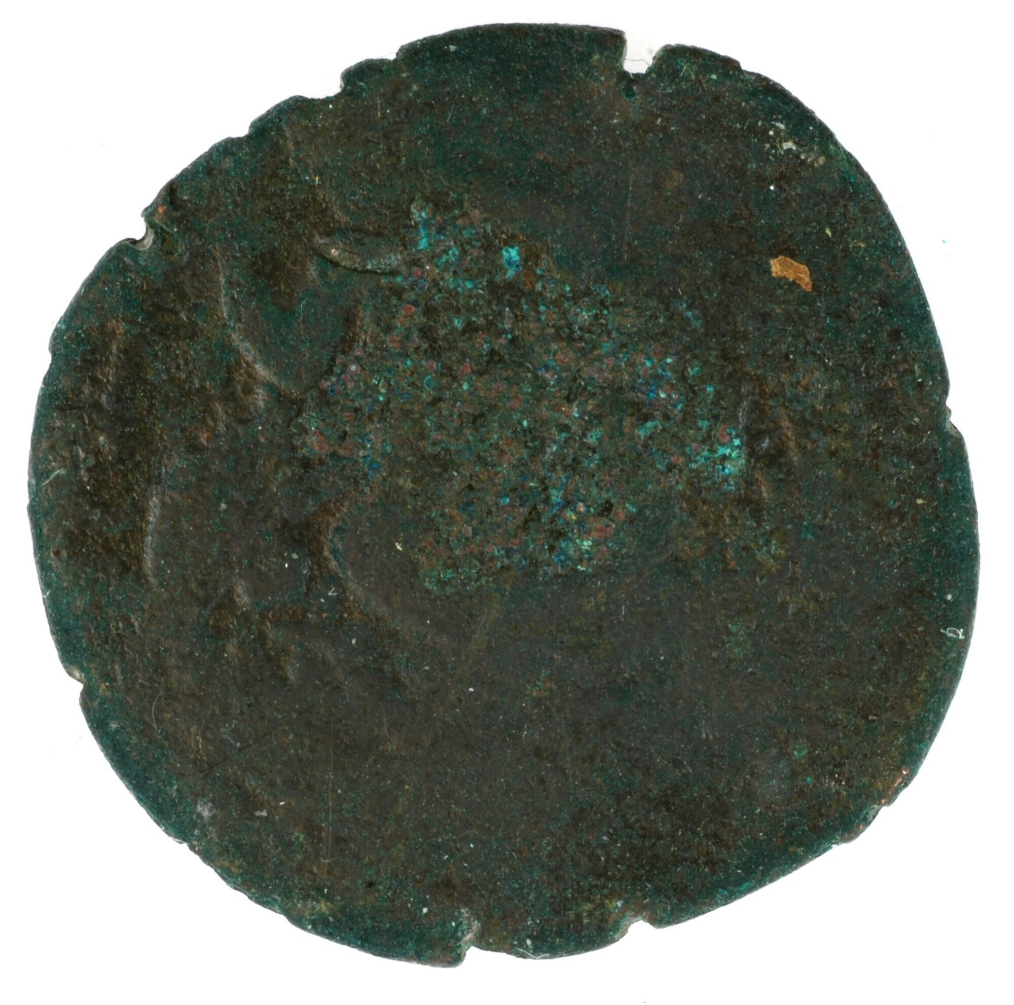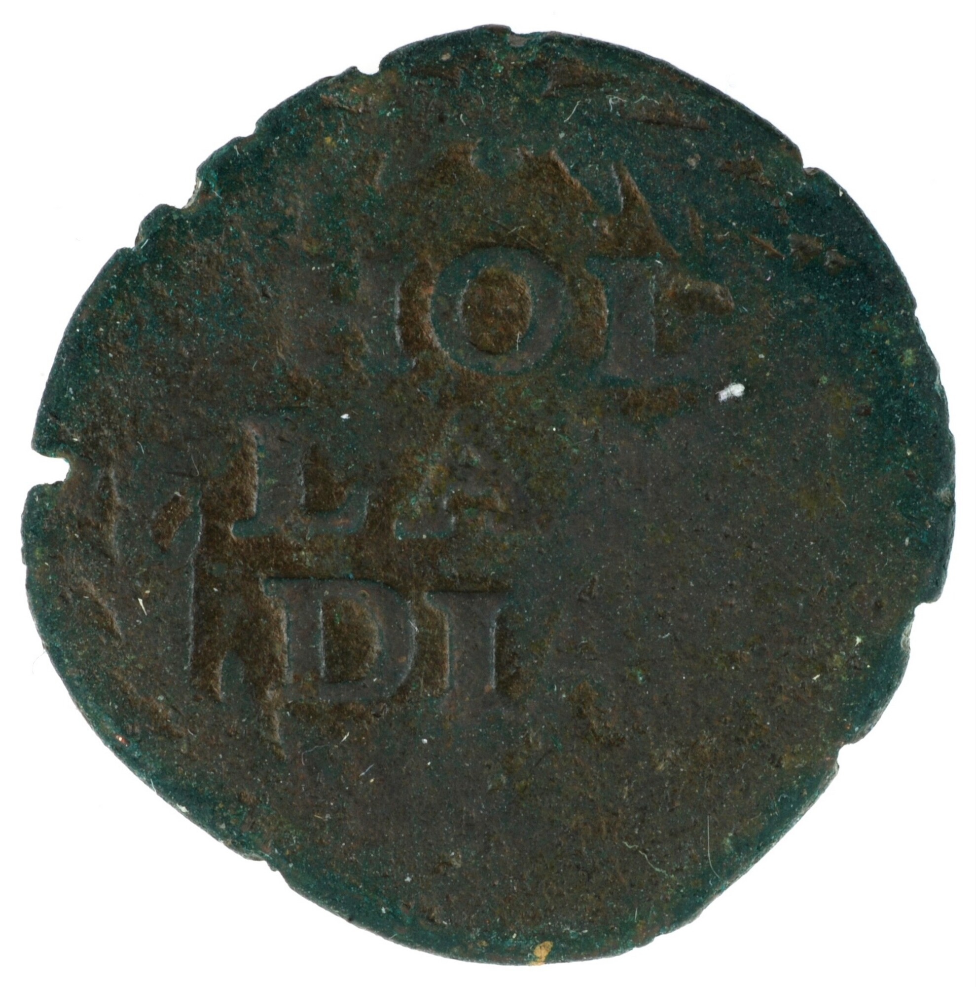 Duit; Holland Provincie (1581-1795); vz.: binnen een bladerkans in drie regels: HOL / LAN / DIA; kz.: maagd gezeten binnen een niet gesloten omheining, met de rechterarm omhoog, wijzend naar de zon, met omschrift [•AVX•NOS•IN•NOM•DOM•(rozet)]; muntplaats: Dordrecht; gewicht: 3.72 gram; referentie: Purmer / Wiel 2004, CNM 2.28.123